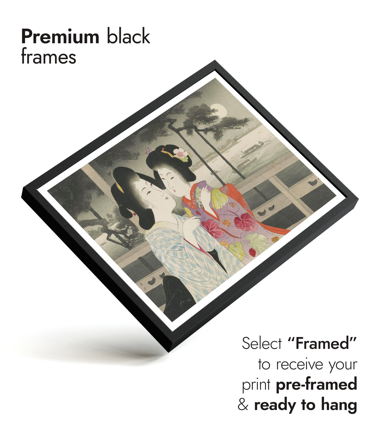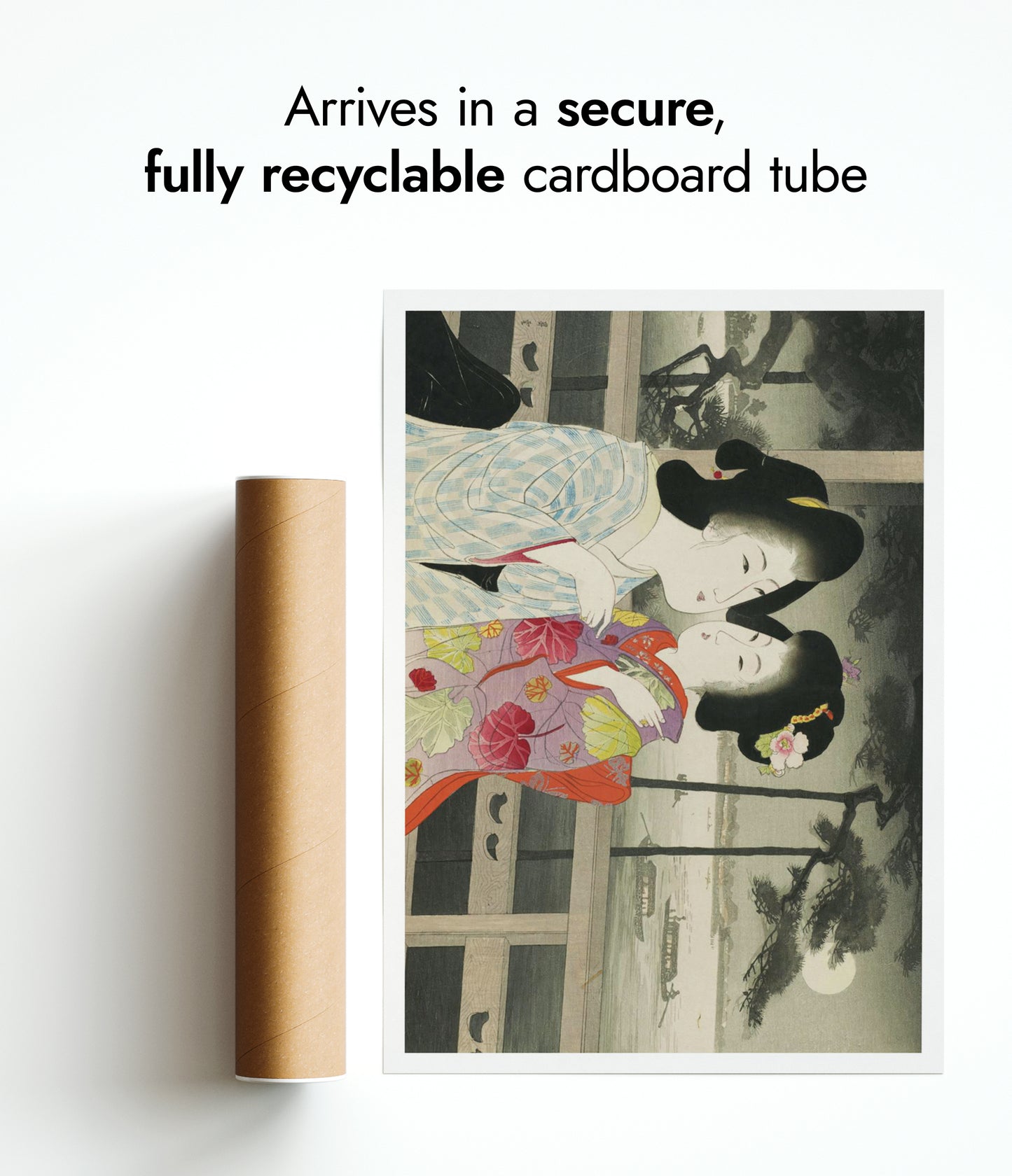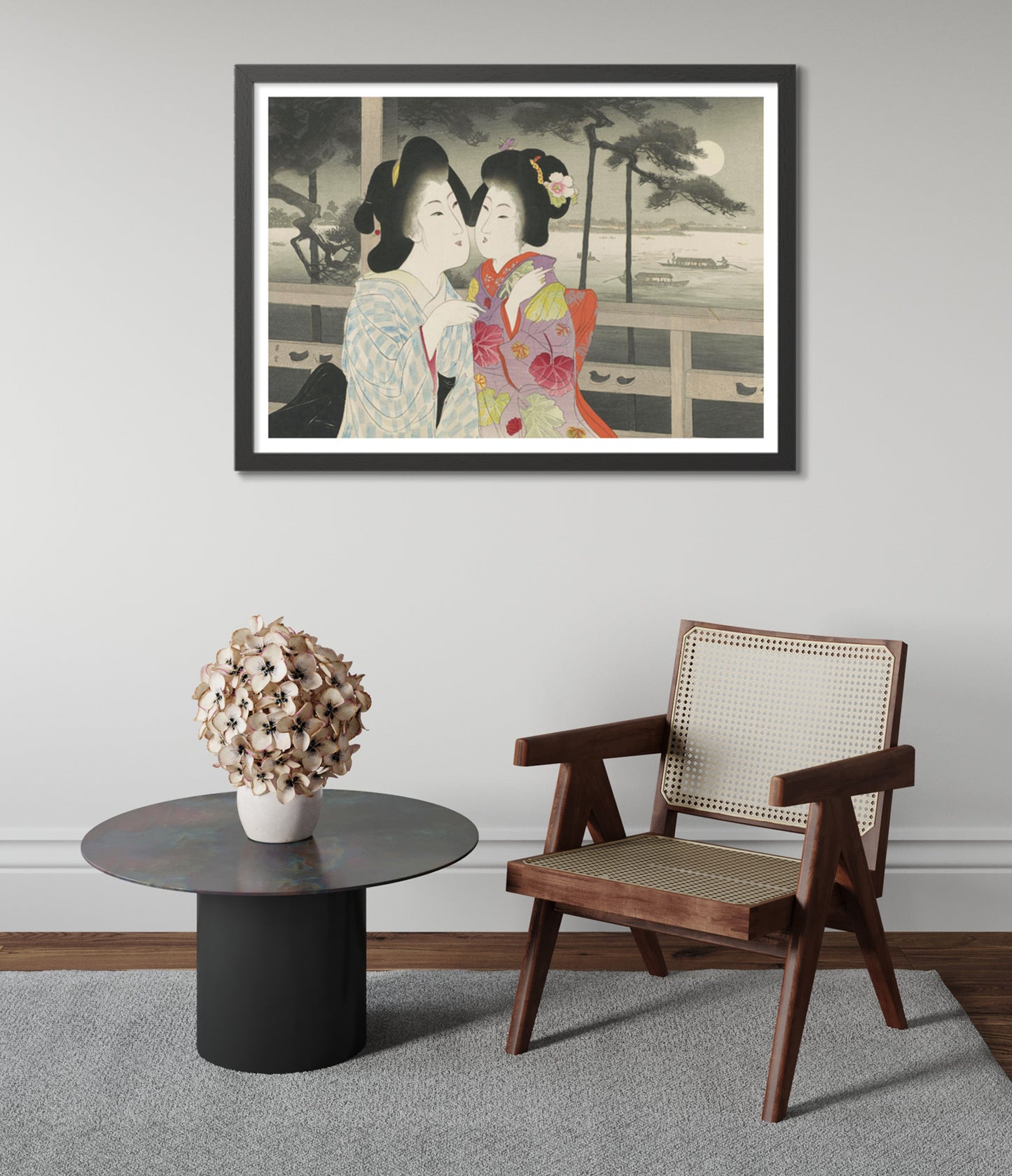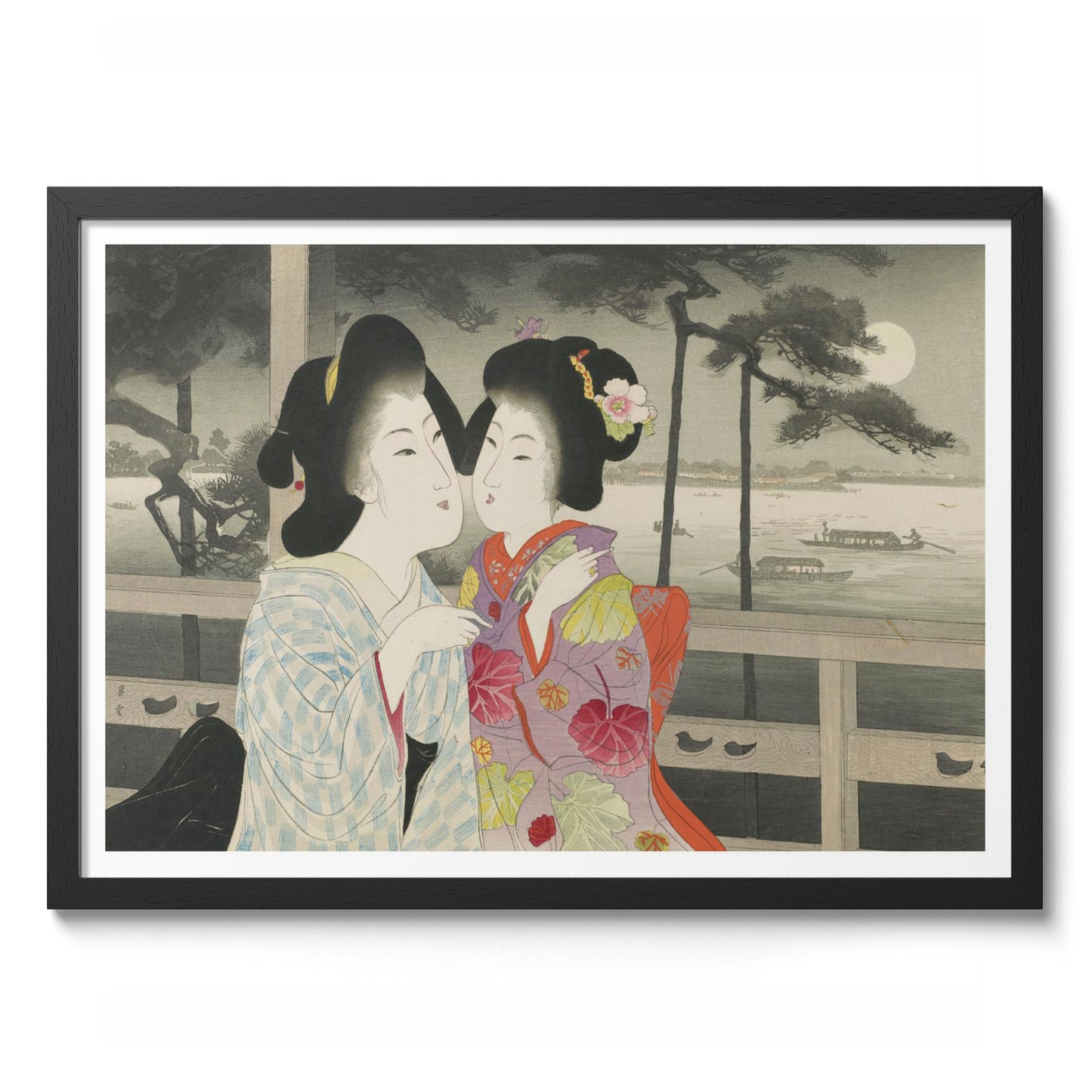 This "Moonlit Night" print by Yamamoto Shoun, created in 1906, beautifully captures a serene evening scene in traditional Japanese woodblock style. The poster features two elegantly dressed women in vibrant kimonos sharing an intimate moment by a tranquil lakeside. The grey and pink hues highlight the moonlit serenity, complemented by the presence of boats and distant trees.