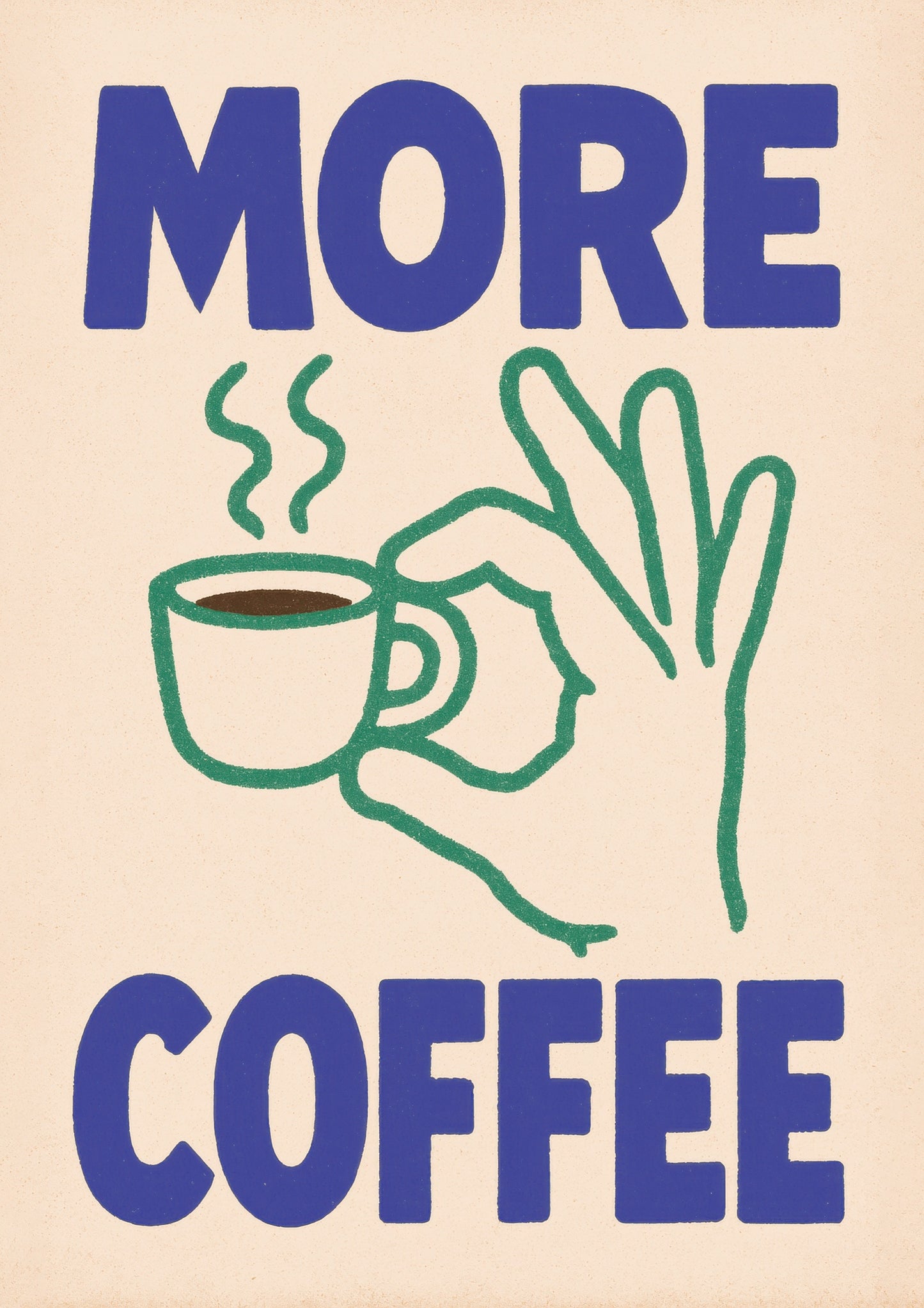 This typographic poster features bold, blue text reading "MORE COFFEE" above a graphic illustration of a hand holding a steaming cup, depicted in green lines. The minimalist and vibrant design captures the essence of coffee culture, using simple shapes and playful typography. Ideal for coffee lovers and modern decor, this artwork adds a lively touch to any space.