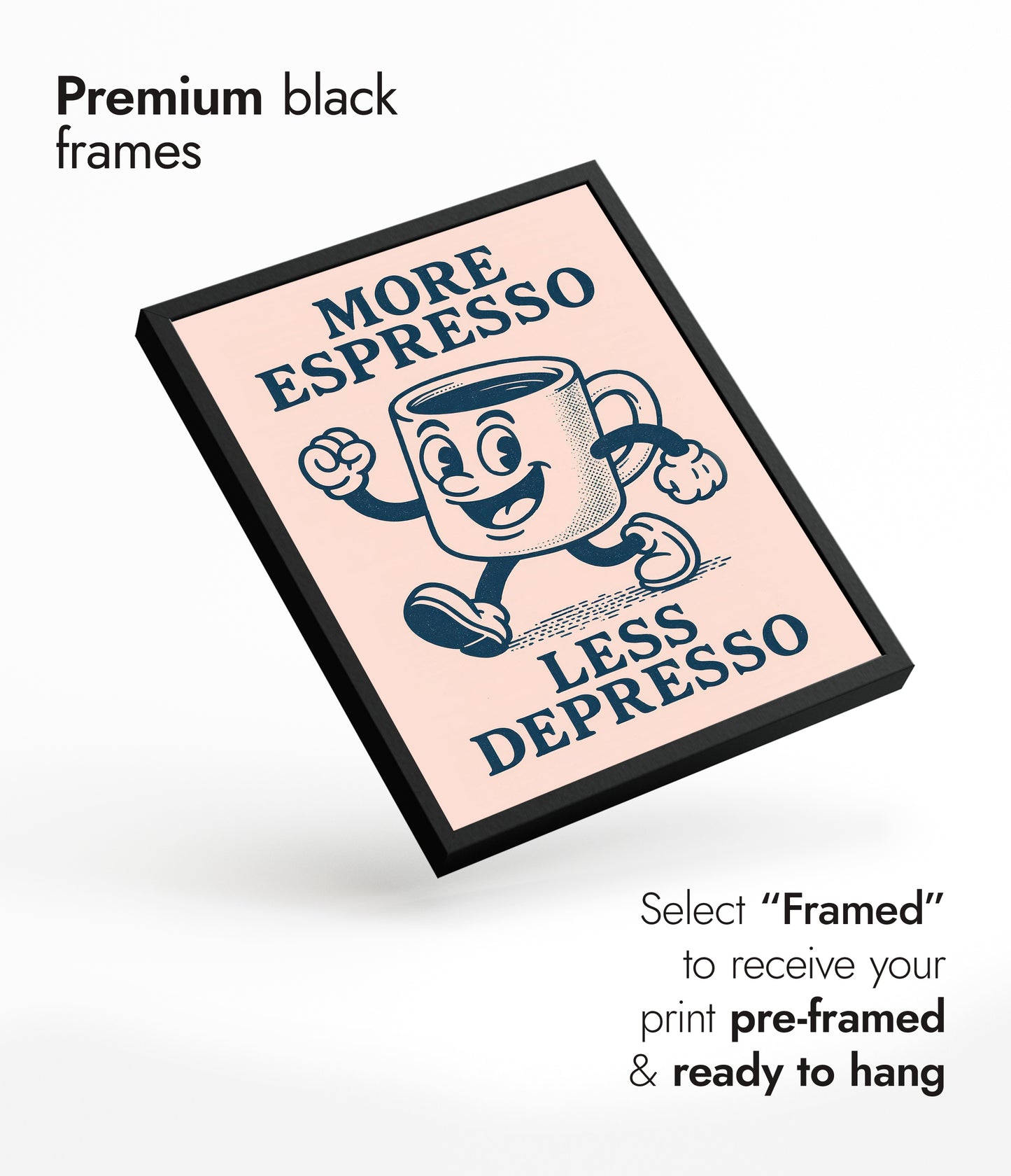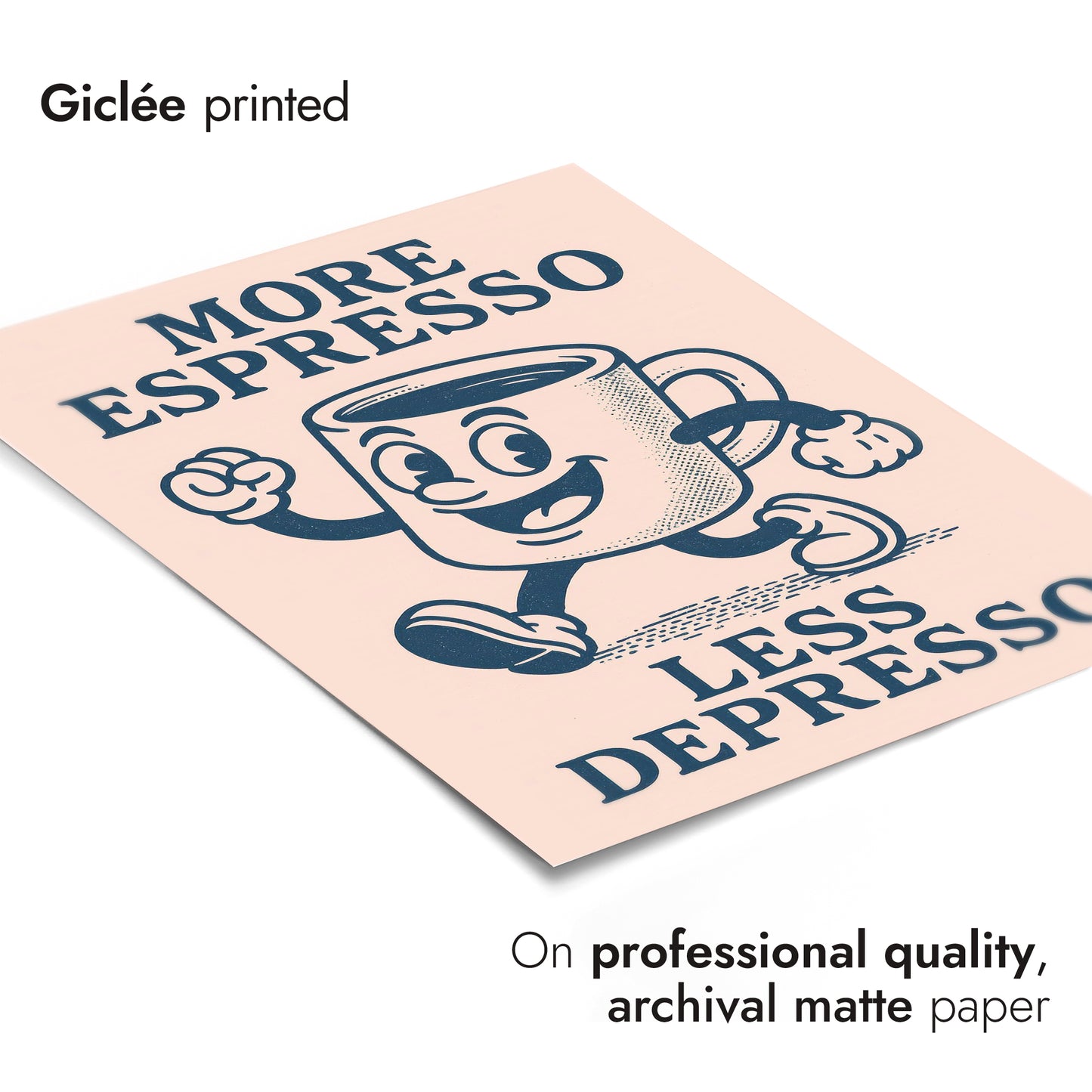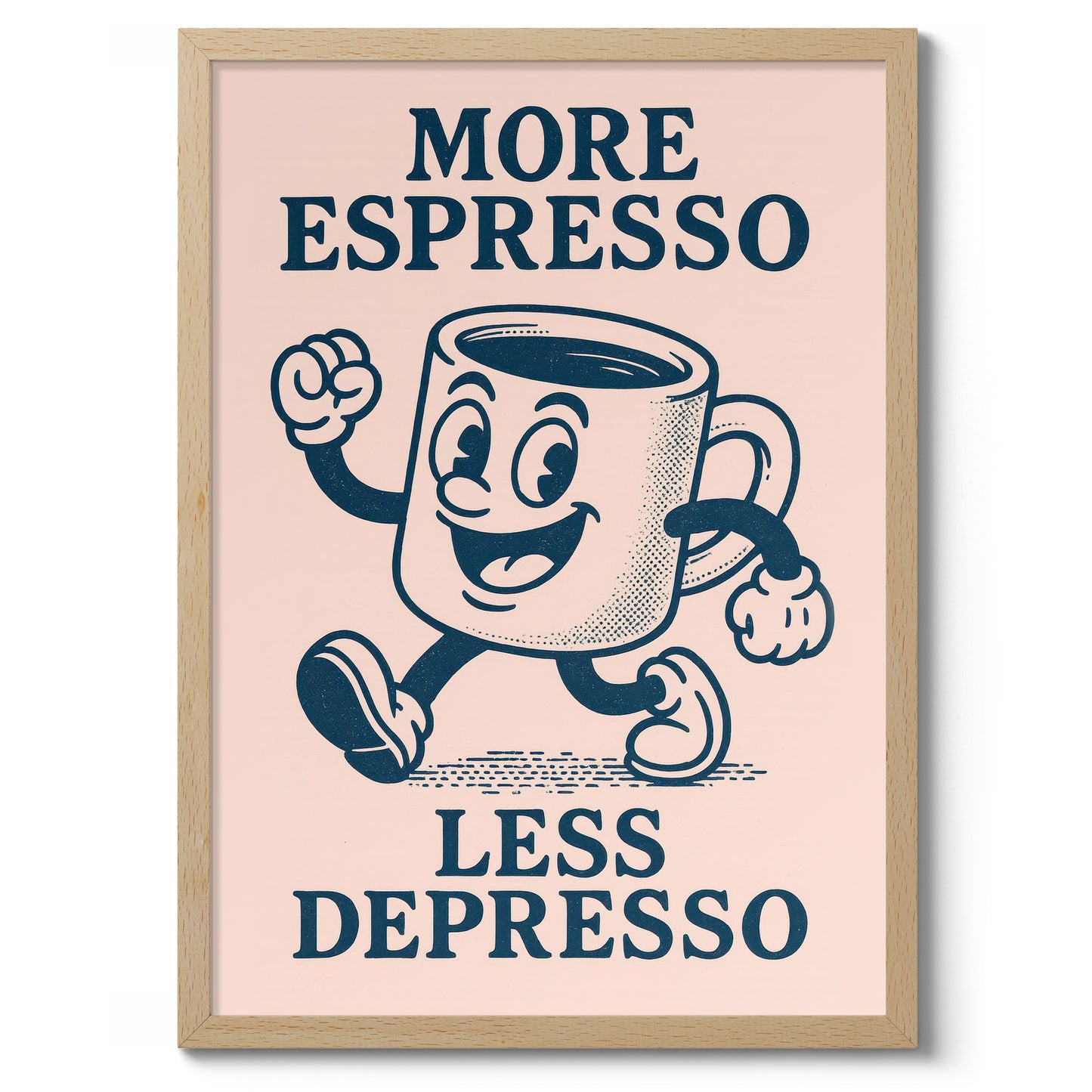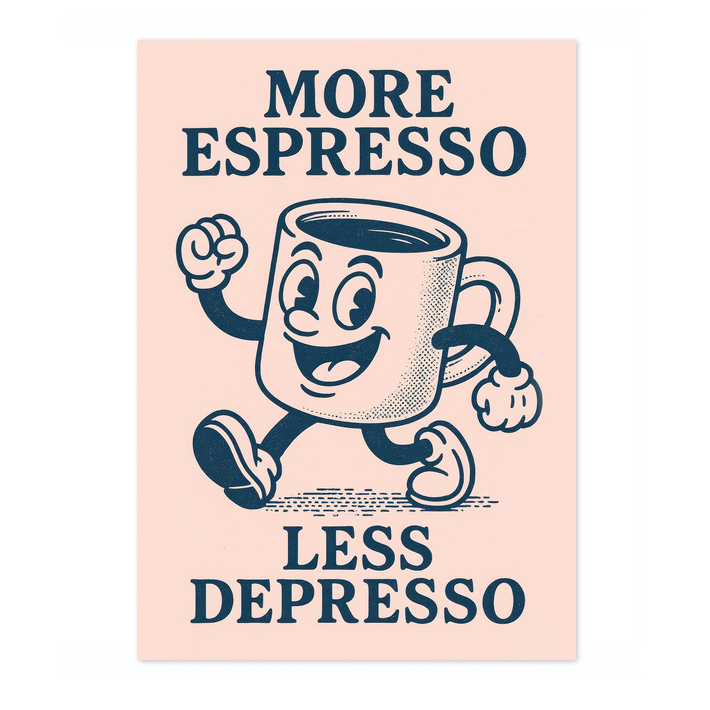 This vintage-inspired poster features a cheerful cartoon coffee mug walking energetically, accompanied by the playful quote "More Espresso, Less Depresso." With classic typography and retro illustration style, this artwork brings a humorous touch to any kitchen or breakfast nook, celebrating the uplifting power of espresso. Perfect for coffee lovers seeking a lighthearted aesthetic in their home decor.