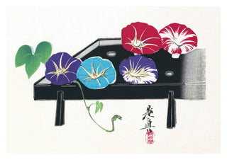 "Morning Glories" by Shibata Zeshin showcases a traditional Japanese still life with vibrant morning glories in shades of purple, blue, red, and white. The blossoms are elegantly arranged on a black lacquer box, accentuating their delicate petals and lush green leaves. This painting-style art print offers a serene floral theme, perfect for those seeking classical Japanese poster art.