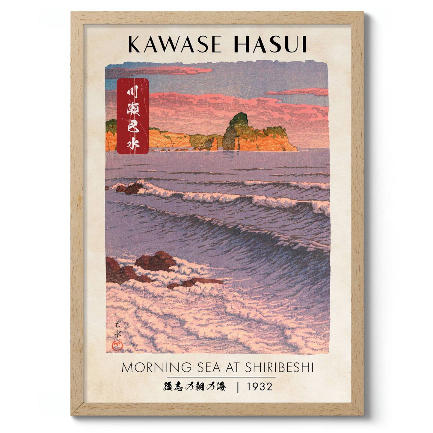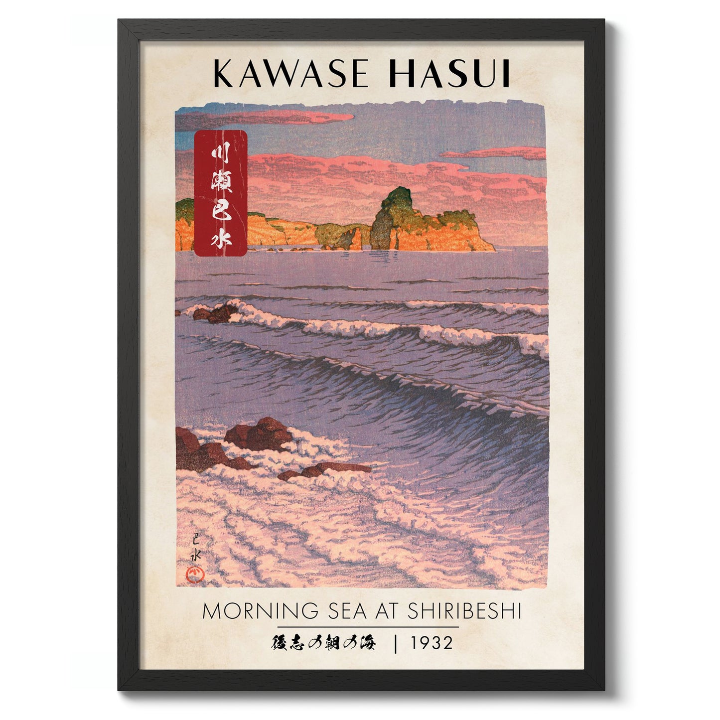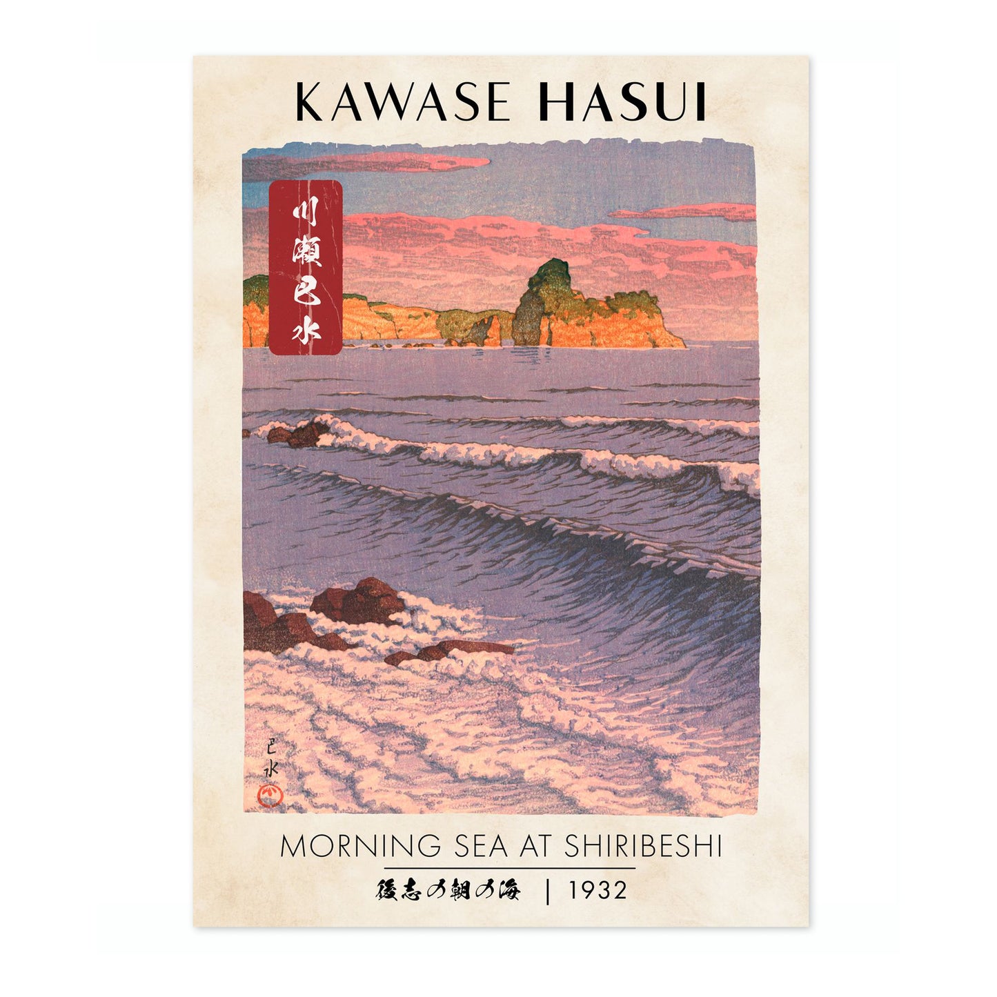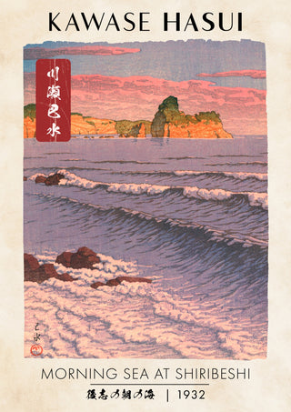 This "Morning Sea at Shiribeshi" poster by Kawase Hasui, created in 1932, beautifully captures a tranquil sunrise over the Japanese coast. The traditional woodblock print displays gentle ocean waves against a serene beach and cliff backdrop, rendered in shades of pink and blue. A harmonious blend of nature's elements is vividly portrayed, echoing Japan's timeless coastal beauty.