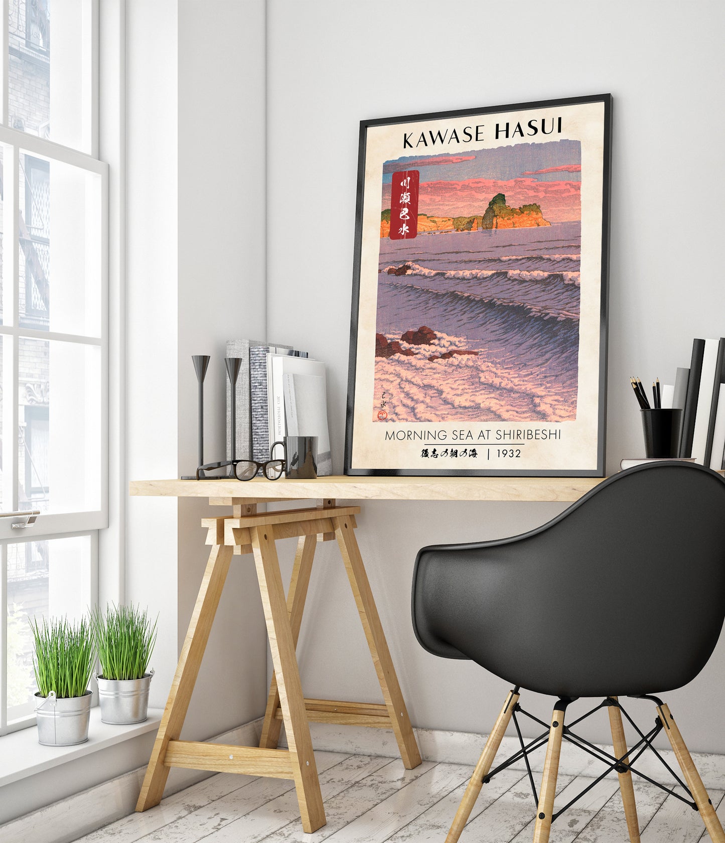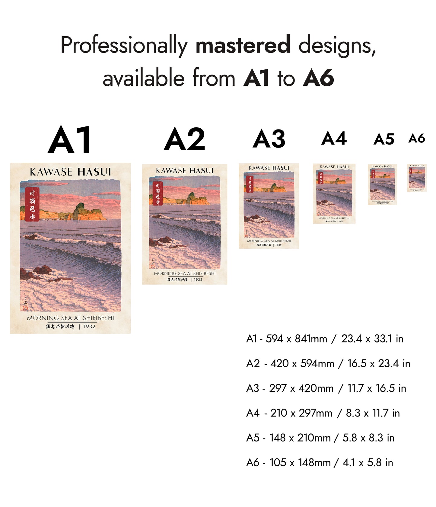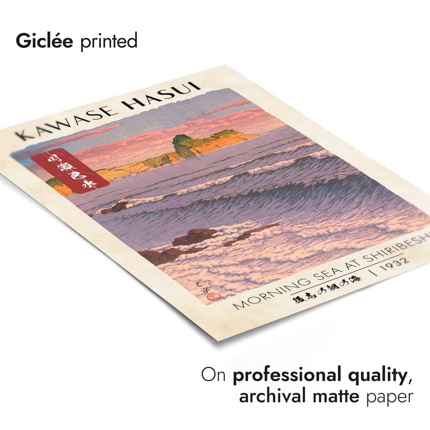 This "Morning Sea at Shiribeshi" poster by Kawase Hasui, created in 1932, beautifully captures a tranquil sunrise over the Japanese coast. The traditional woodblock print displays gentle ocean waves against a serene beach and cliff backdrop, rendered in shades of pink and blue. A harmonious blend of nature's elements is vividly portrayed, echoing Japan's timeless coastal beauty.