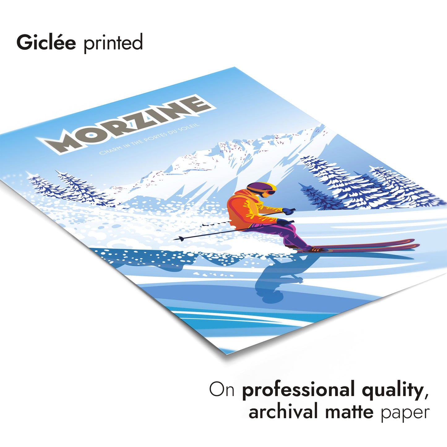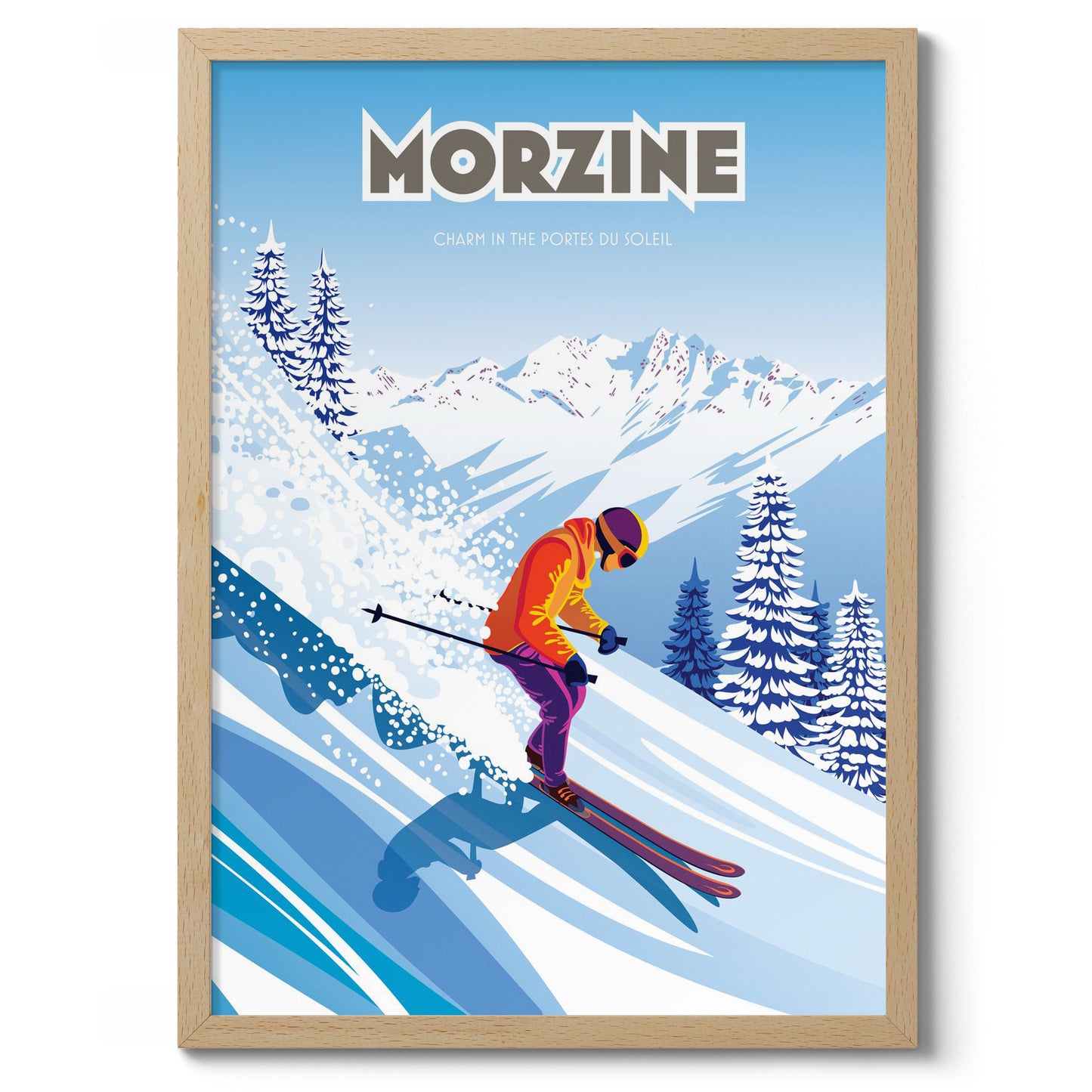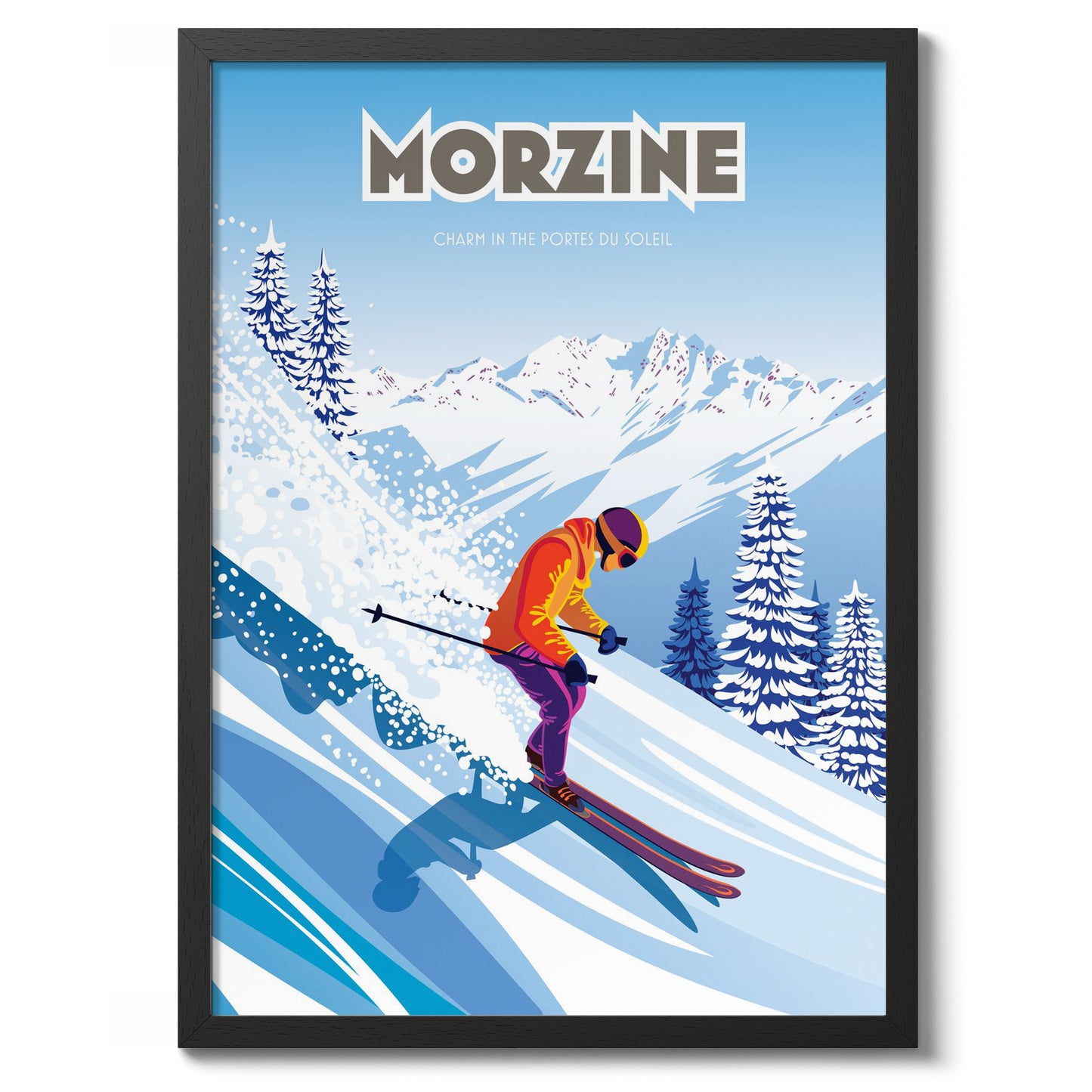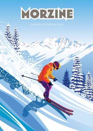 This vibrant Morzine poster captures a skier gracefully descending a snow-covered slope, set against the striking backdrop of the Portes du Soleil mountains. Highlighting the charm of Morzine, France, the scene blends vivid colors and dynamic movement with graphic precision. Perfect for ski enthusiasts, this art print showcases the lively energy of alpine adventure.