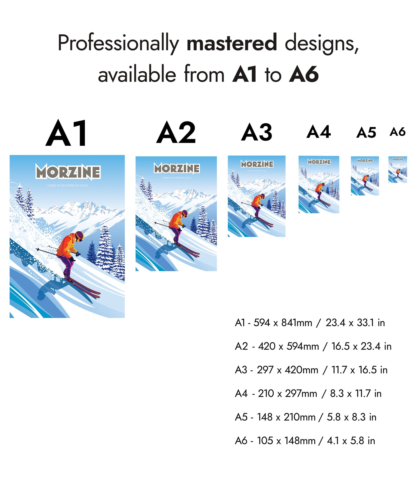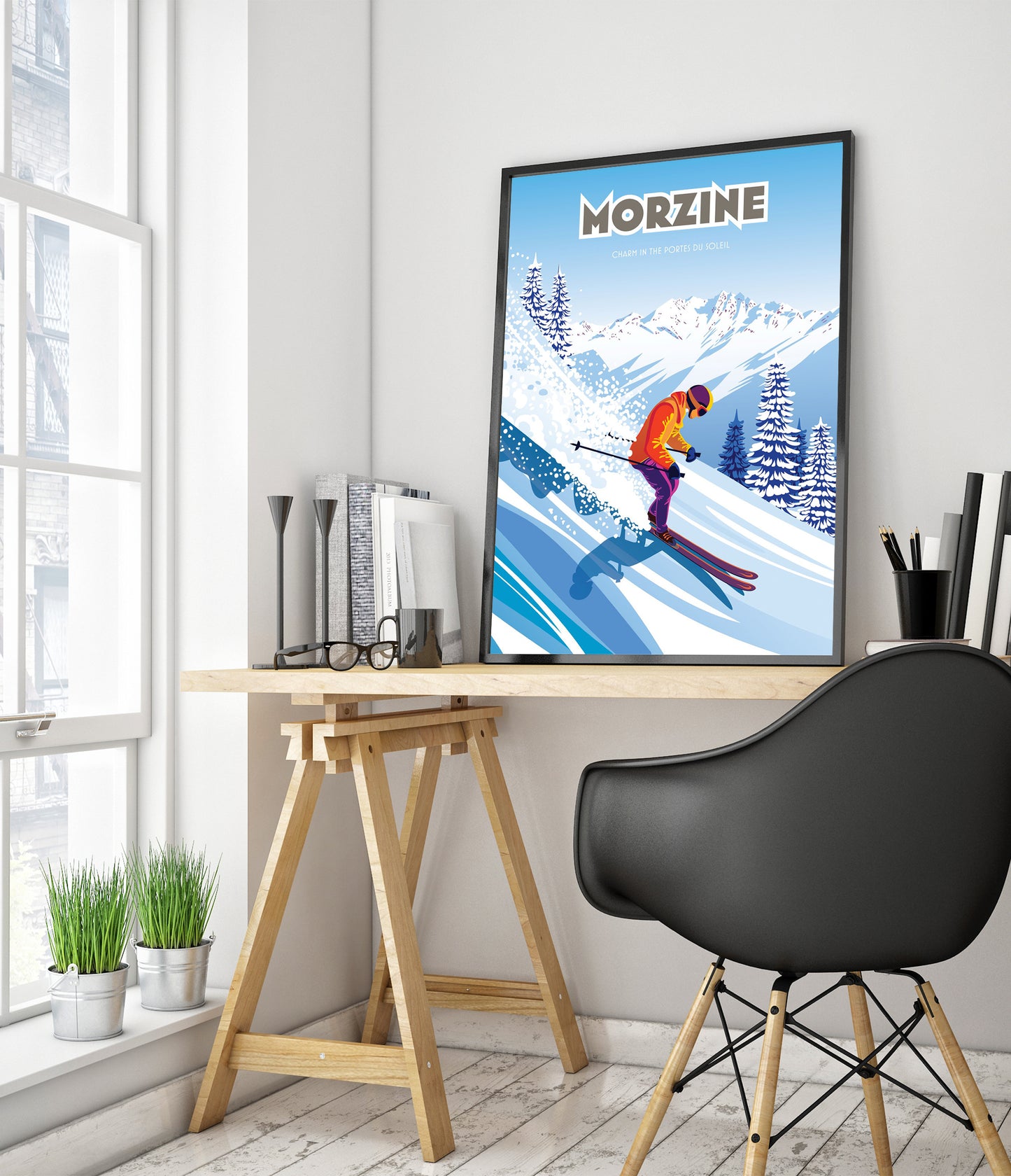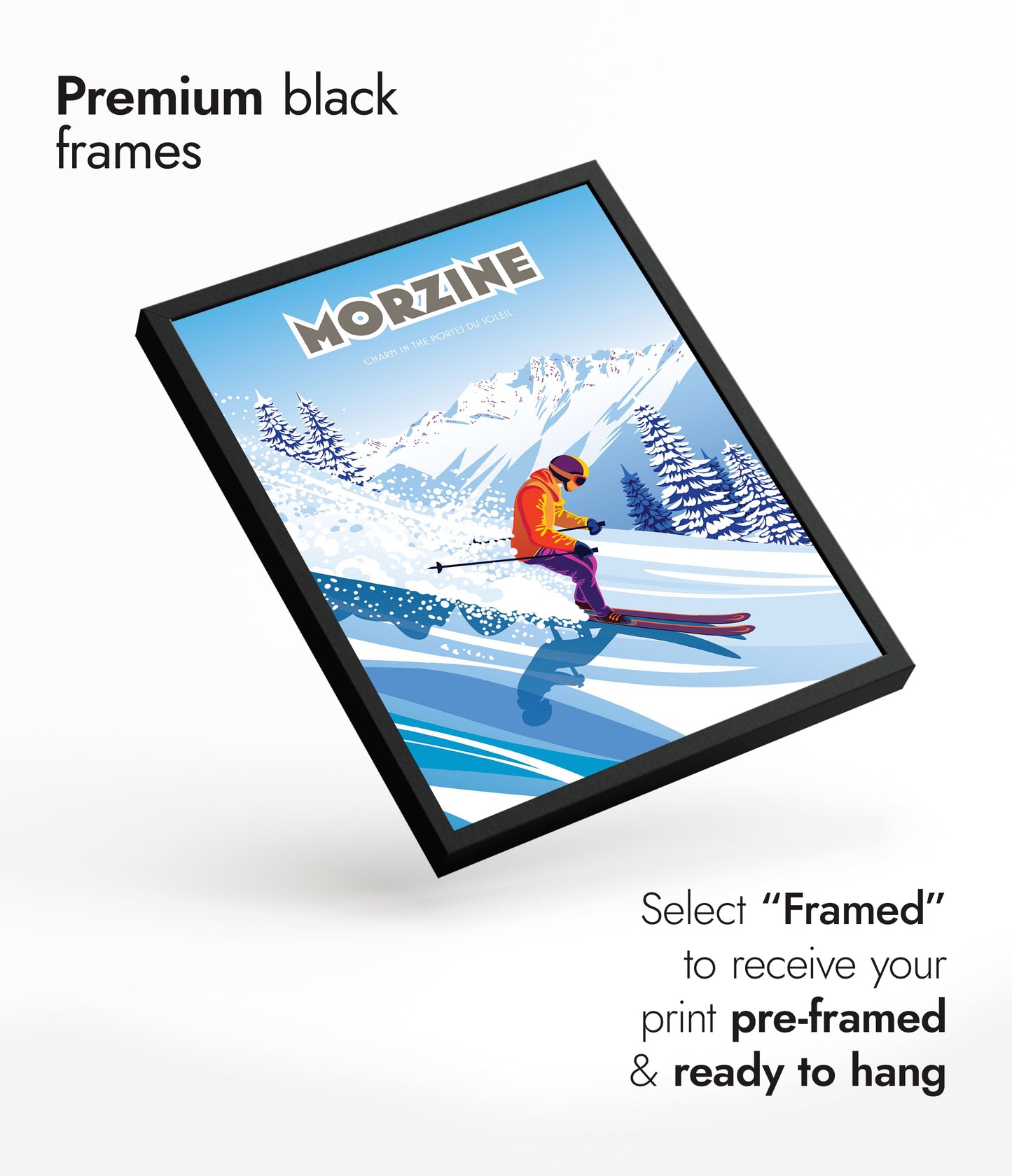 This vibrant Morzine poster captures a skier gracefully descending a snow-covered slope, set against the striking backdrop of the Portes du Soleil mountains. Highlighting the charm of Morzine, France, the scene blends vivid colors and dynamic movement with graphic precision. Perfect for ski enthusiasts, this art print showcases the lively energy of alpine adventure.