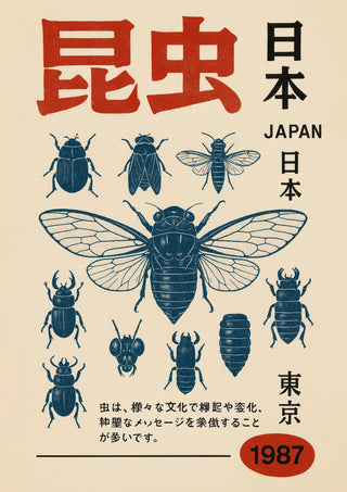 This vintage-style "Moths Japan" poster features an array of intricately detailed insects displayed with a bold, monochrome design. The arrangement highlights Japanese text and symbols, seamlessly blending naturalism with cultural elements. The striking beige background and minimalist composition emphasize entomological diversity, offering a fusion of zoology and Japanese aesthetics. Perfect for nature enthusiasts and art collectors.