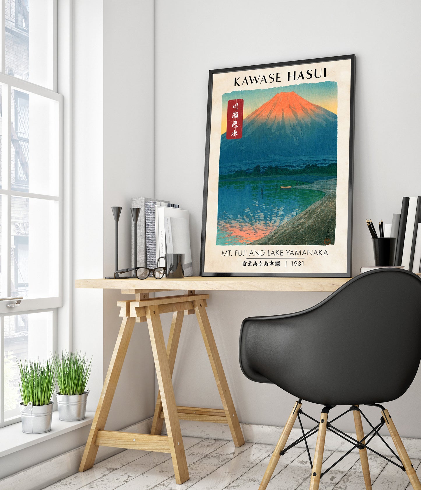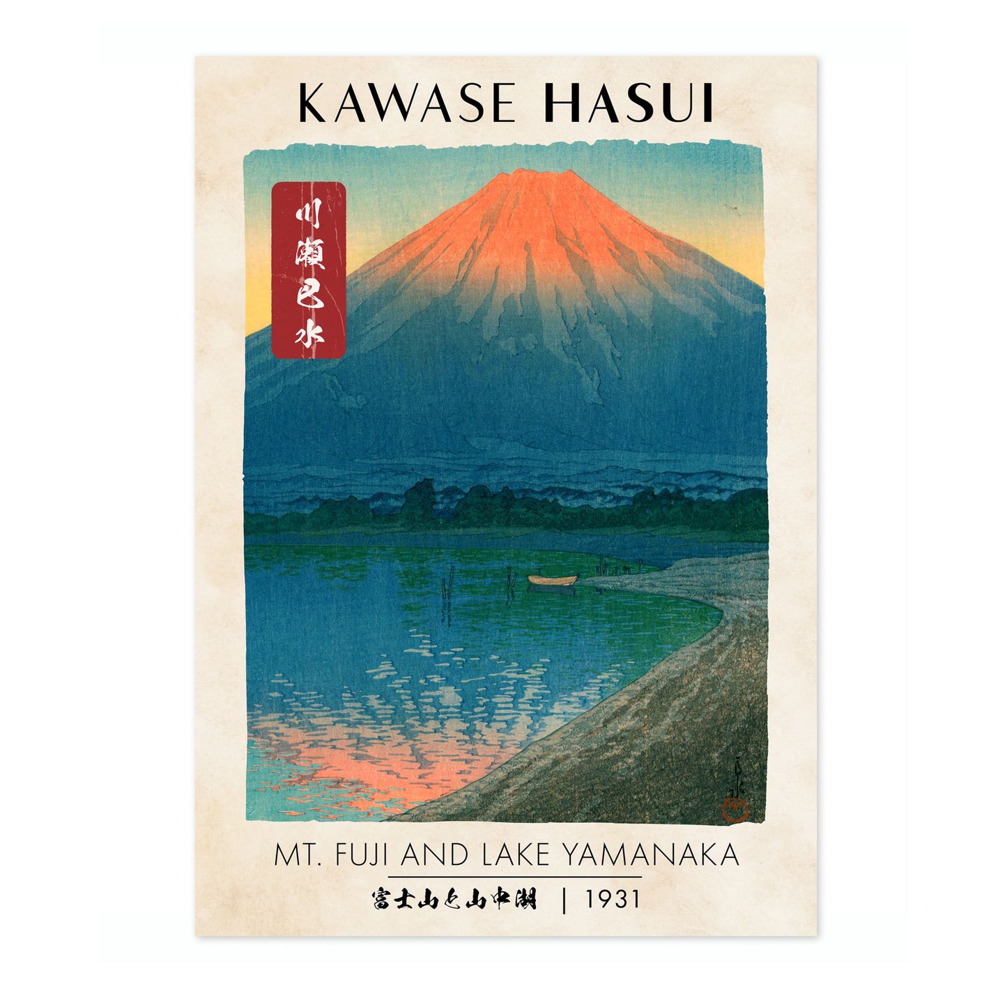 This poster features Kawase Hasui's 1931 woodblock print "Mt. Fuji and Lake Yamanaka." The artwork beautifully captures the serene morning atmosphere with the majestic Mount Fuji bathed in warm sunrise hues, reflected in the tranquil waters of Lake Yamanaka. This traditional Japanese scene offers a captivating glimpse into nature's harmony and elegance, perfect for those seeking calming, scenic artwork for their space.