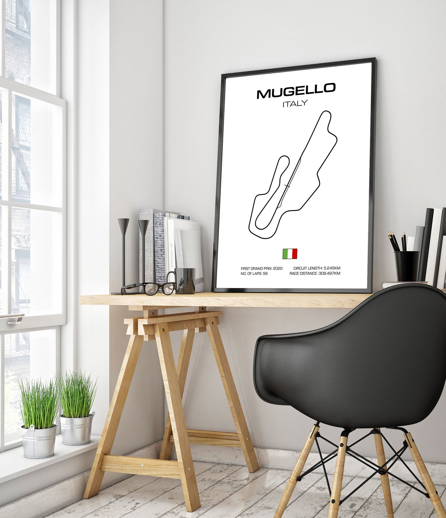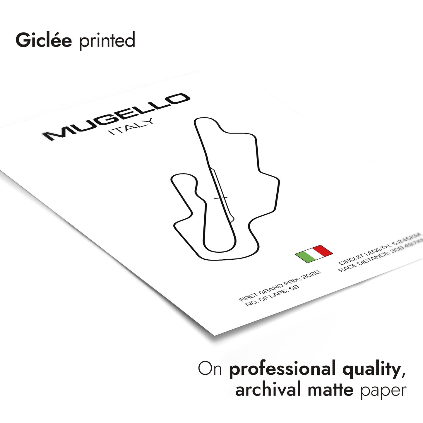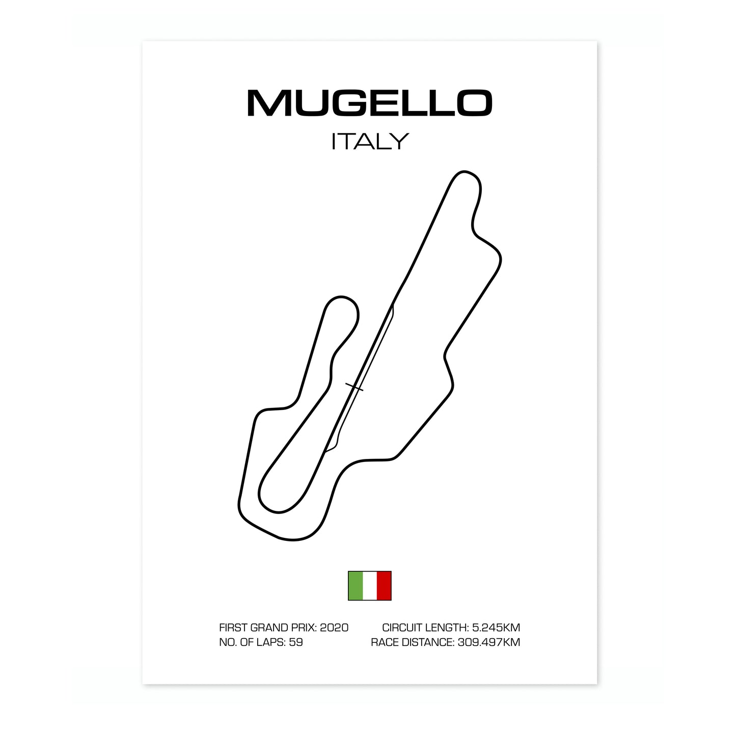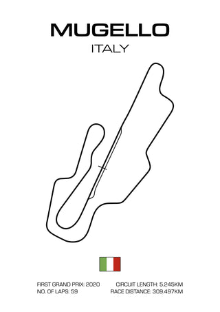This modern Mugello Grand Prix poster features the iconic Mugello circuit layout in a minimalistic line art style. Highlighted with the Italian flag, it's perfect for motorsports enthusiasts and F1 fans. The poster details the circuit's length, number of laps, and race distance, making it a sleek tribute to Italy's premier racing destination. Ideal for contemporary décor.