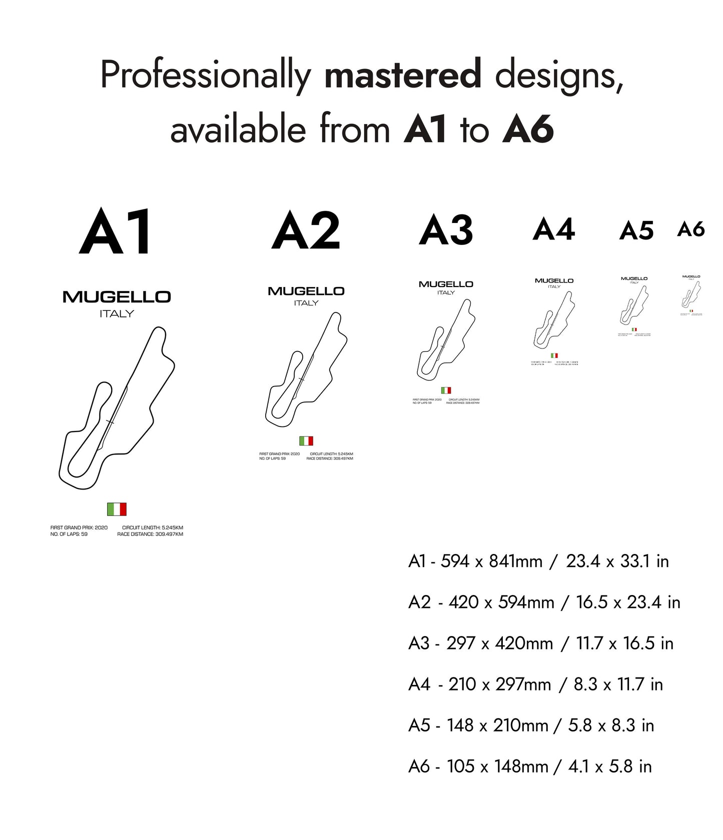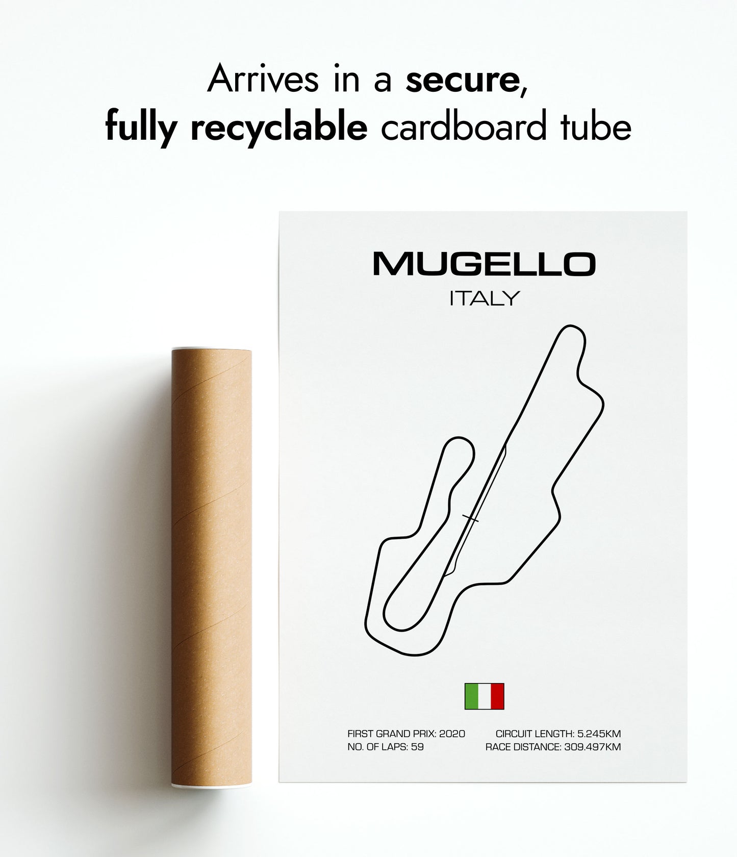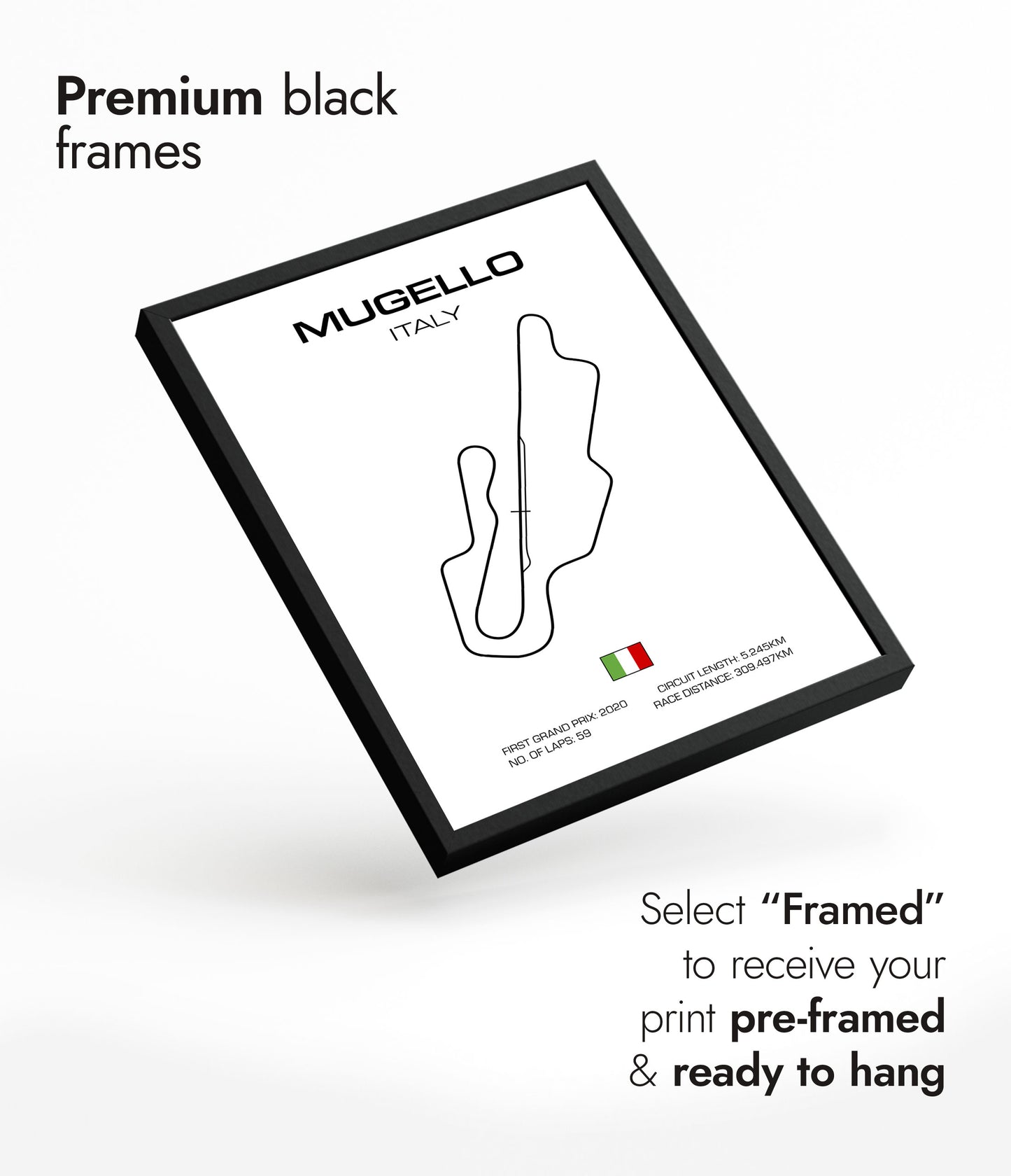 This modern Mugello Grand Prix poster features the iconic Mugello circuit layout in a minimalistic line art style. Highlighted with the Italian flag, it's perfect for motorsports enthusiasts and F1 fans. The poster details the circuit's length, number of laps, and race distance, making it a sleek tribute to Italy's premier racing destination. Ideal for contemporary décor.