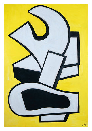 This abstract Cubism poster by Fernand Léger features geometric shapes in black and white against a vibrant yellow background. The dynamic composition showcases bold, interlocking forms, creating a striking visual contrast. Ideal for modern and contemporary spaces, this art print encapsulates Léger's distinct style, emphasizing shapes and structure. Perfect for enthusiasts of abstract and geometric art.