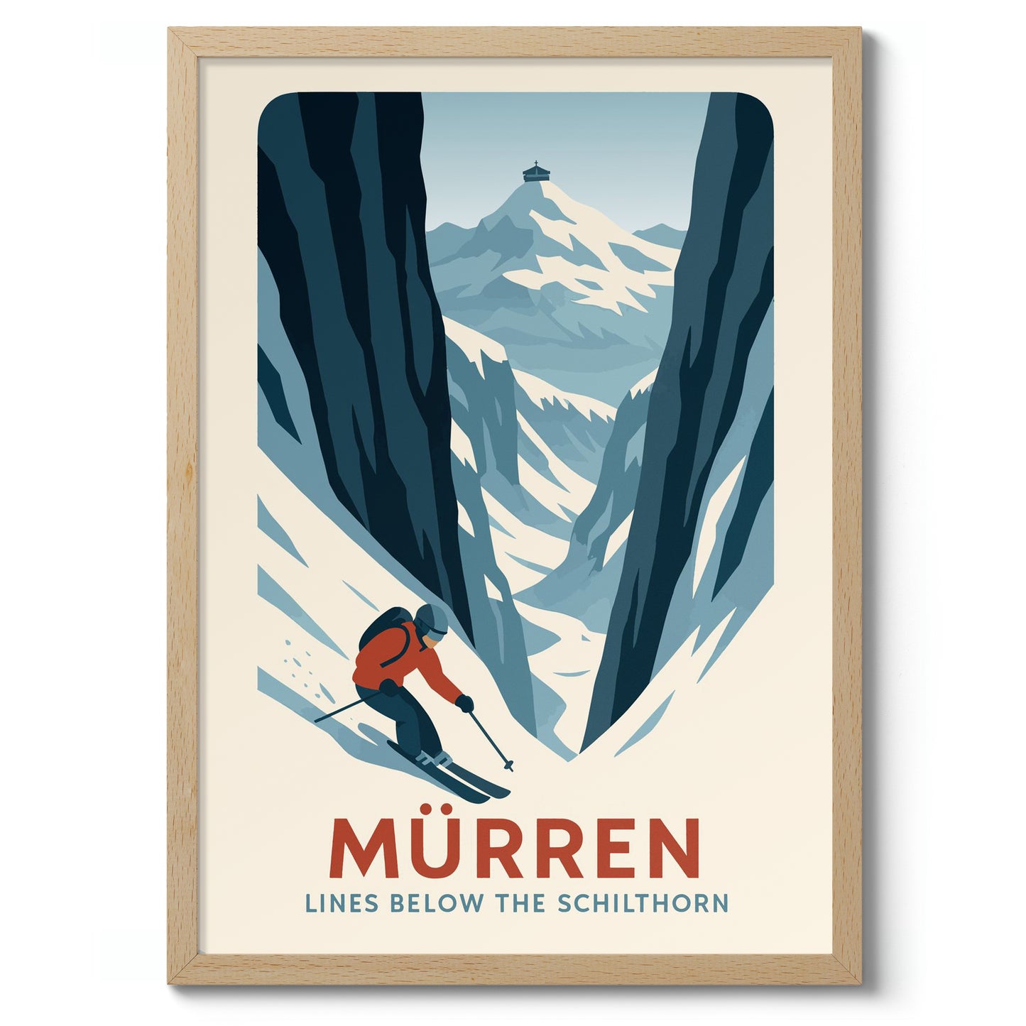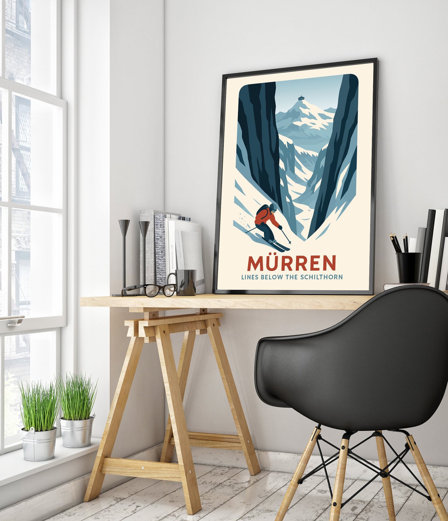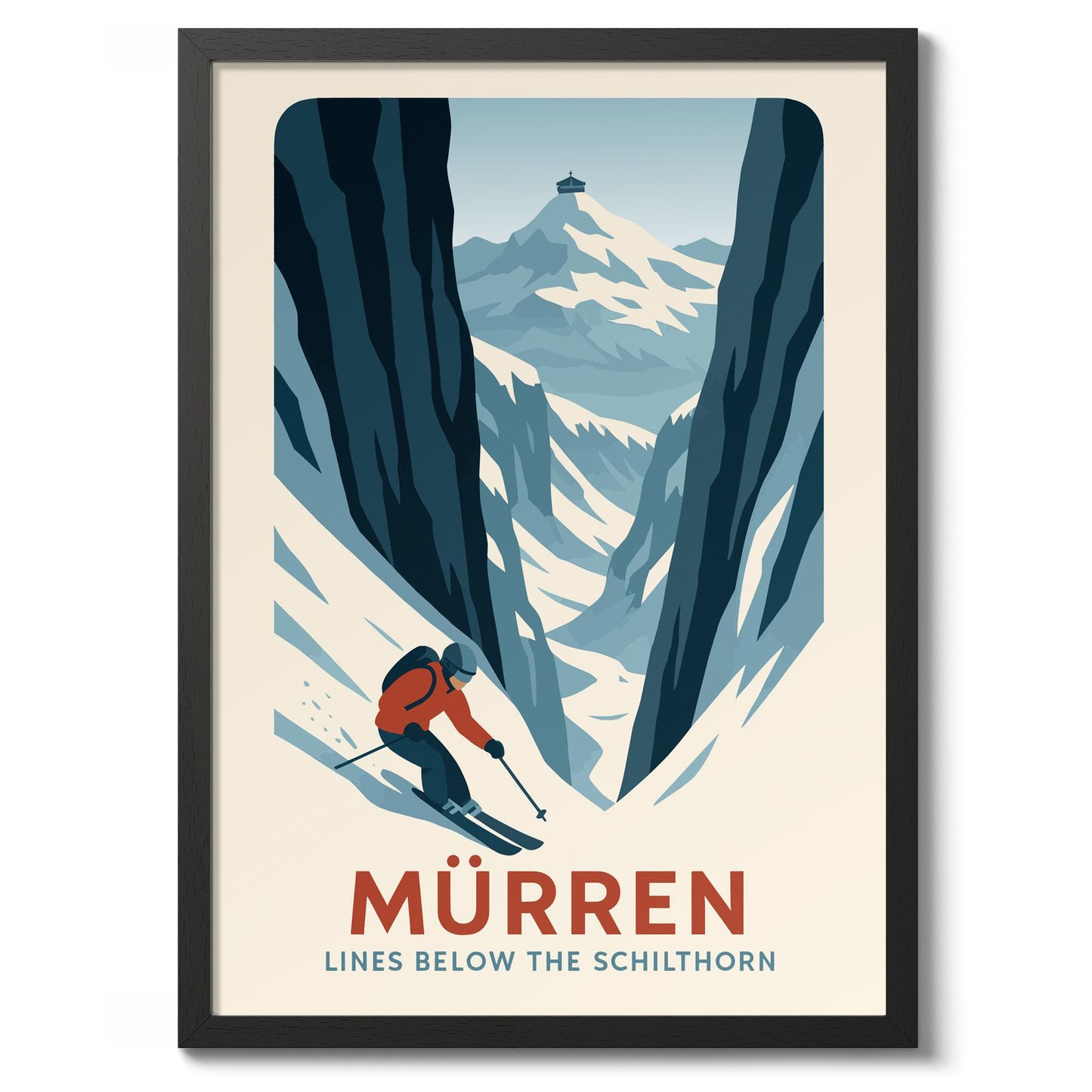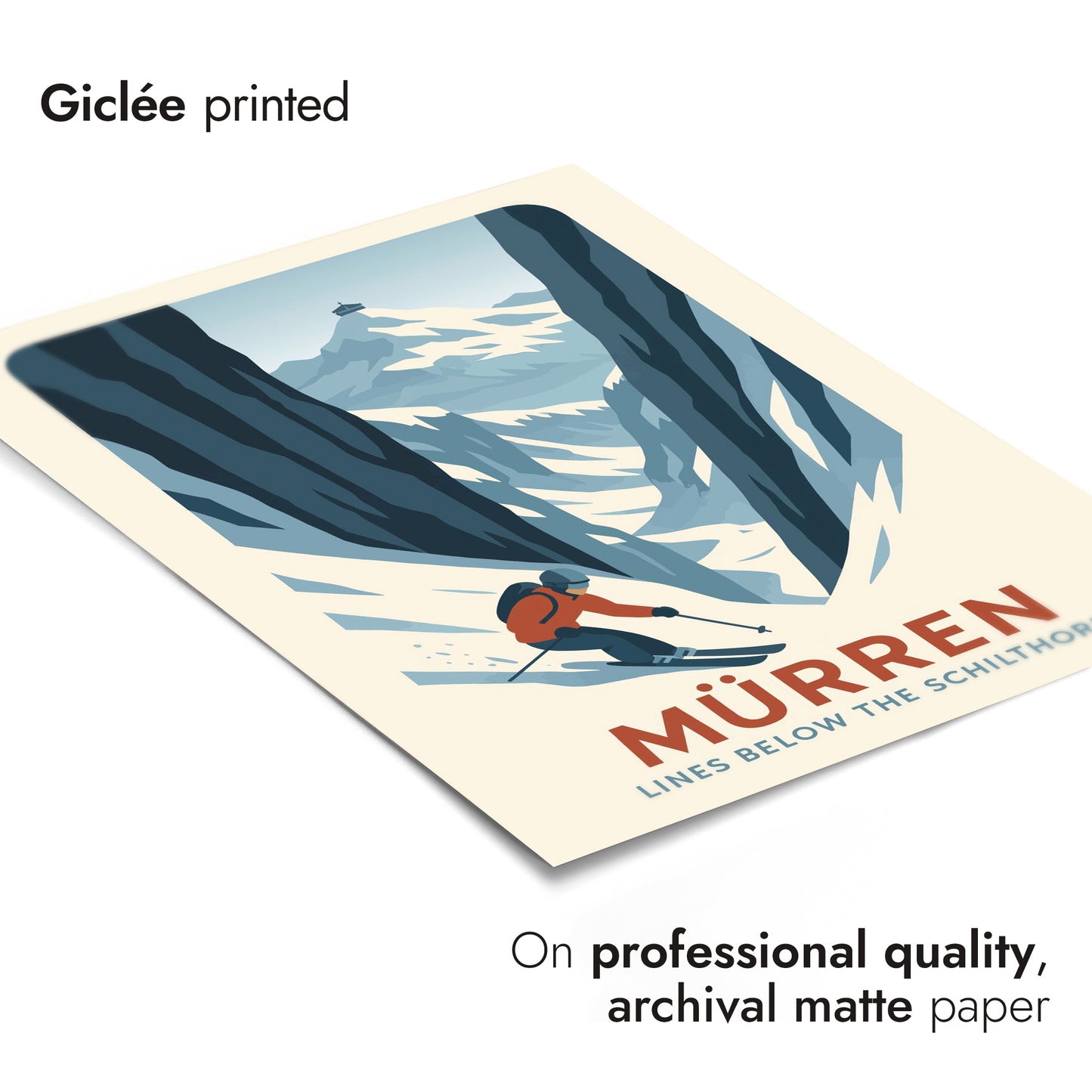 This vibrant Mürren poster captures an exhilarating skiing scene beneath the majestic Schilthorn peak in Switzerland. The artwork features a skier navigating a dramatic, snow-clad mountain backdrop, rendered in a striking graphic style. Ideal for ski enthusiasts, this poster beautifully encapsulates the thrill of alpine sports amidst breathtaking natural landscapes. Perfect for adding a touch of adventure to any space.
