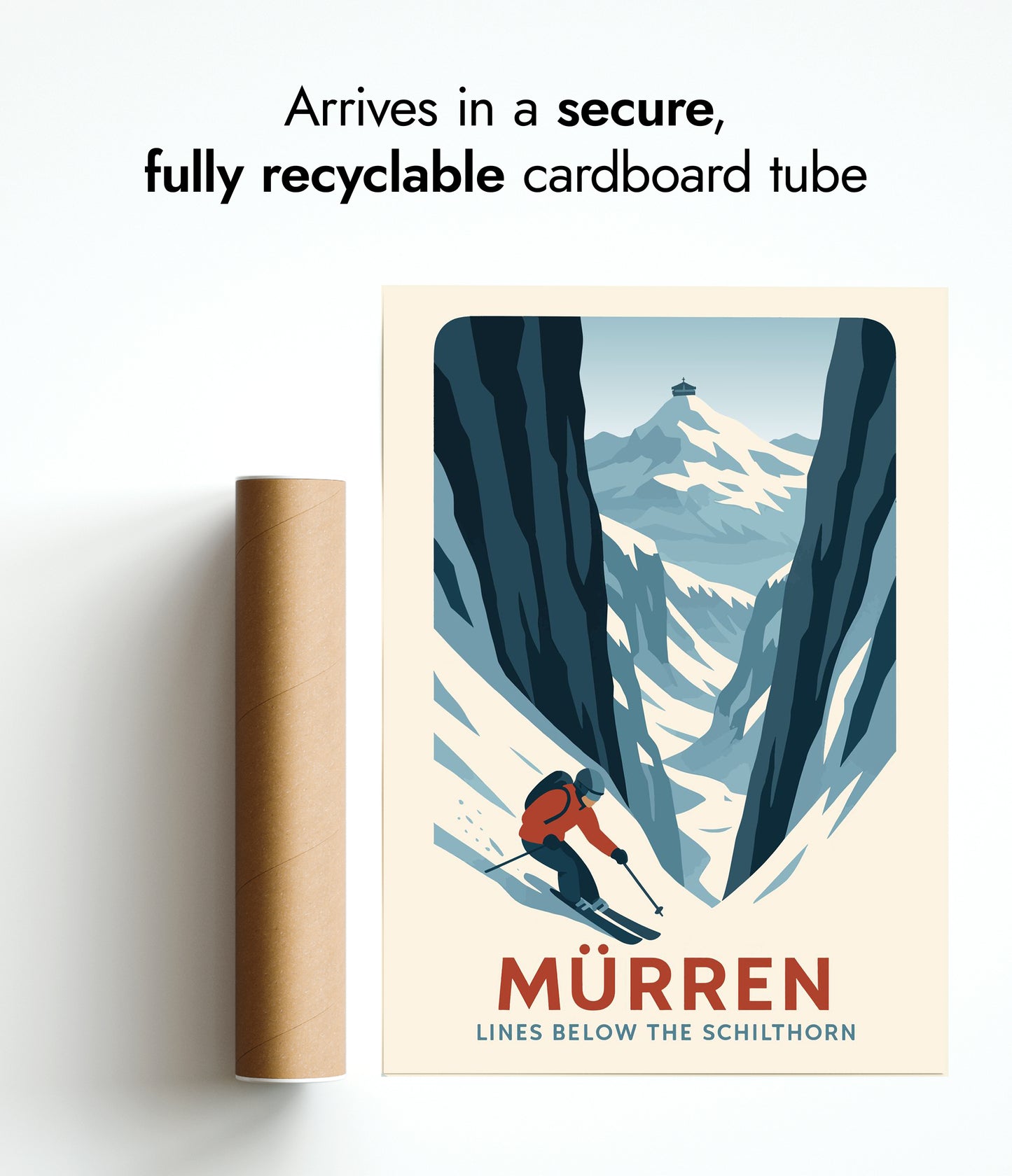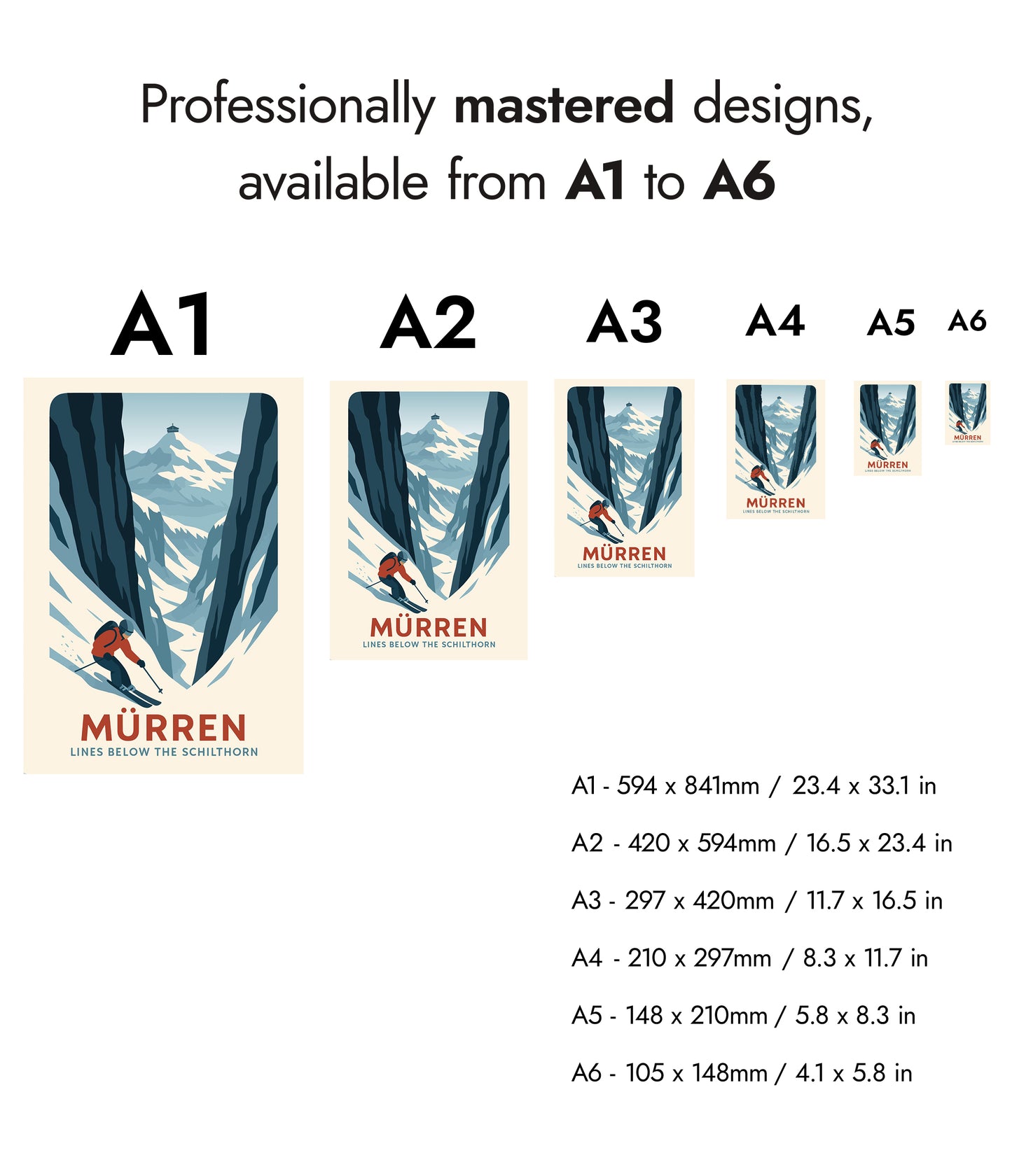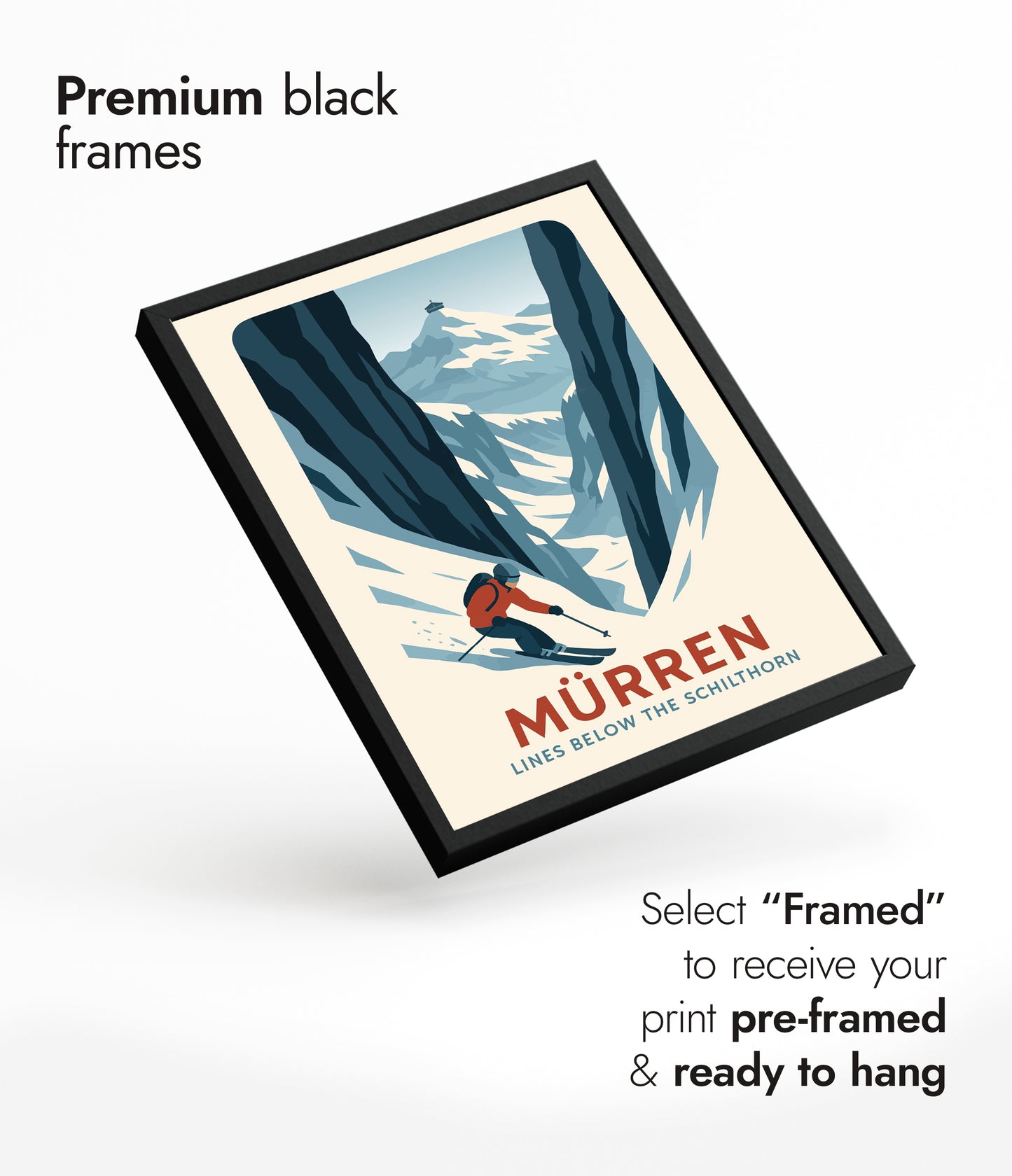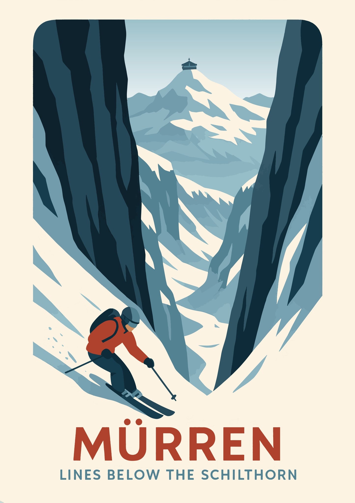 This vibrant Mürren poster captures an exhilarating skiing scene beneath the majestic Schilthorn peak in Switzerland. The artwork features a skier navigating a dramatic, snow-clad mountain backdrop, rendered in a striking graphic style. Ideal for ski enthusiasts, this poster beautifully encapsulates the thrill of alpine sports amidst breathtaking natural landscapes. Perfect for adding a touch of adventure to any space.