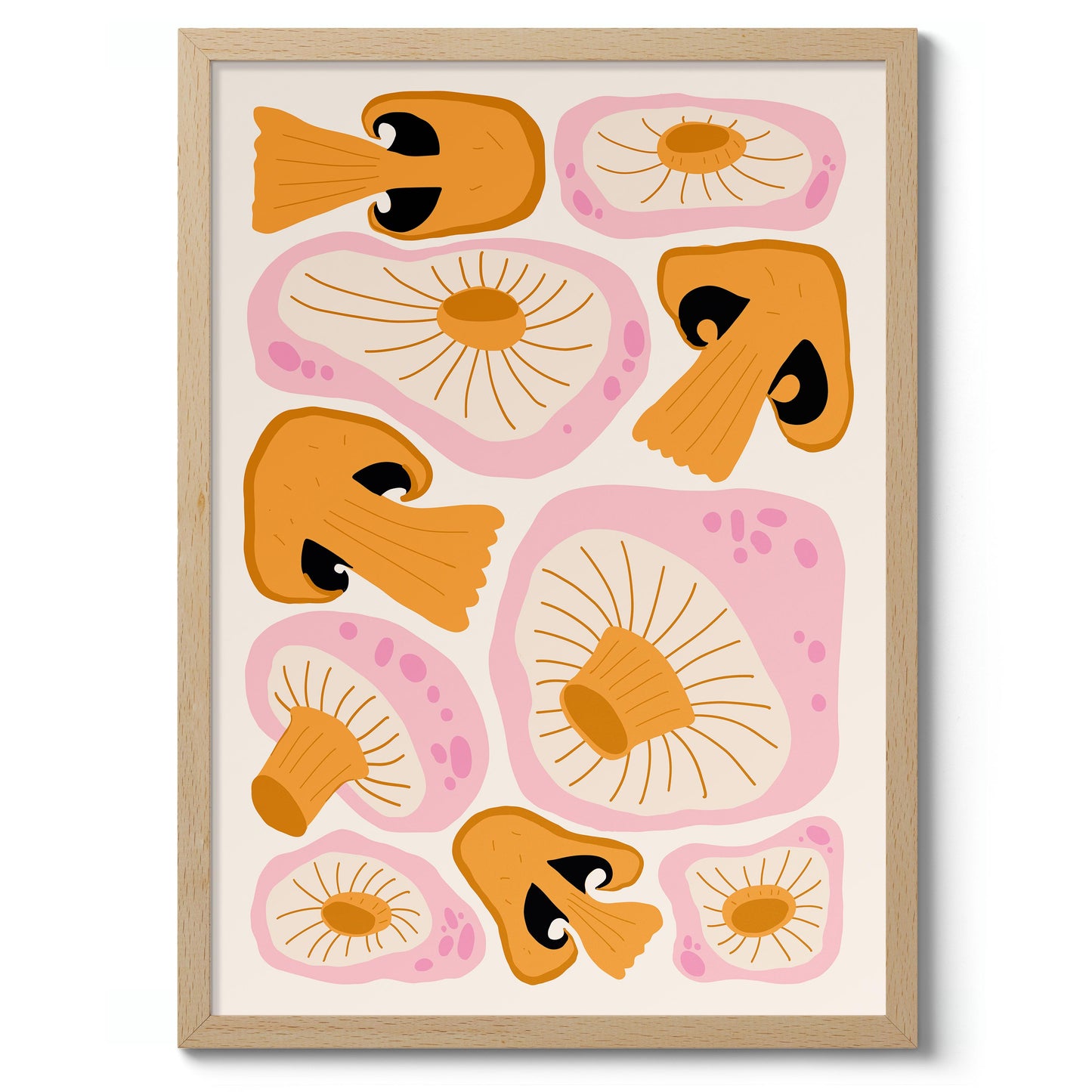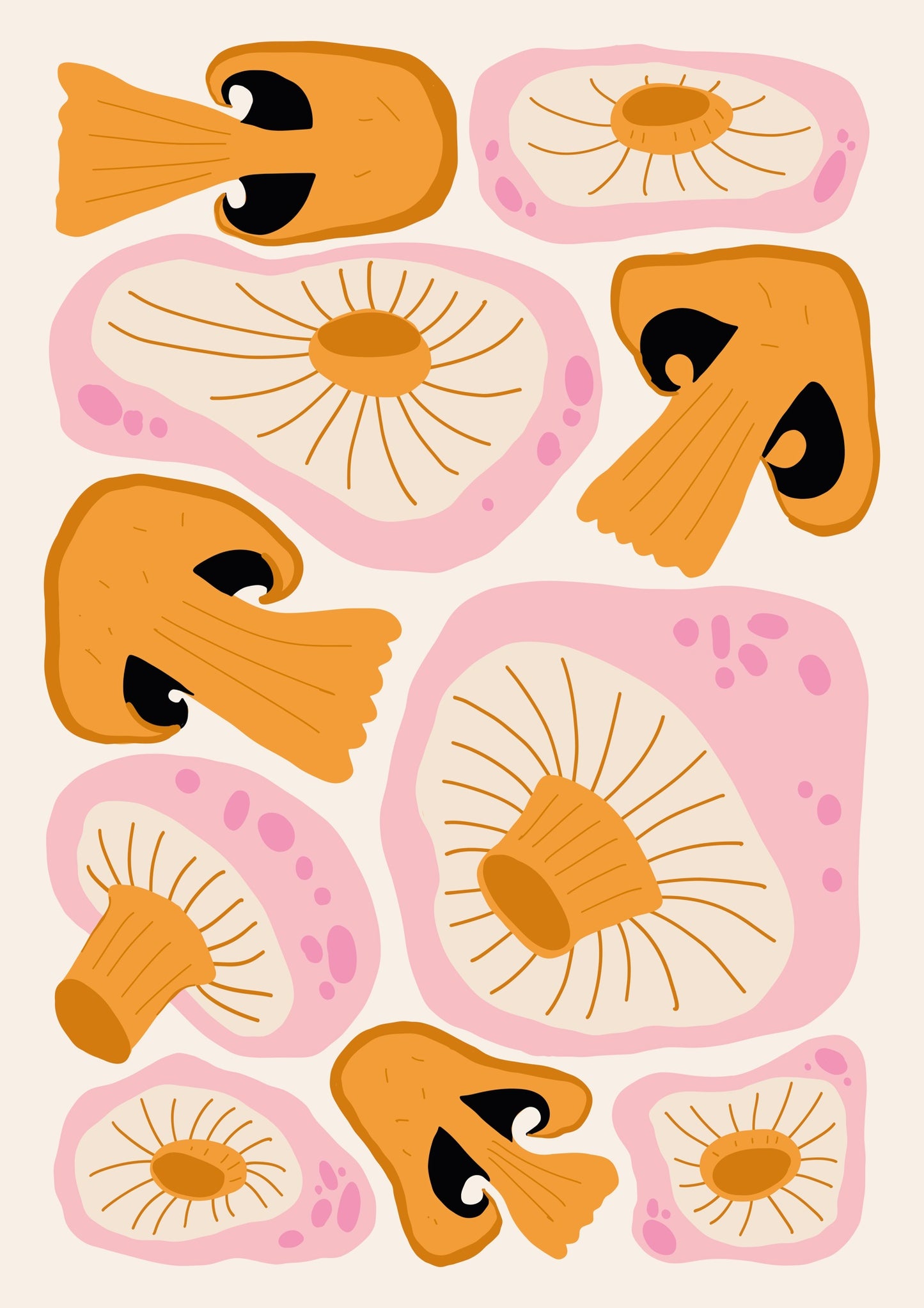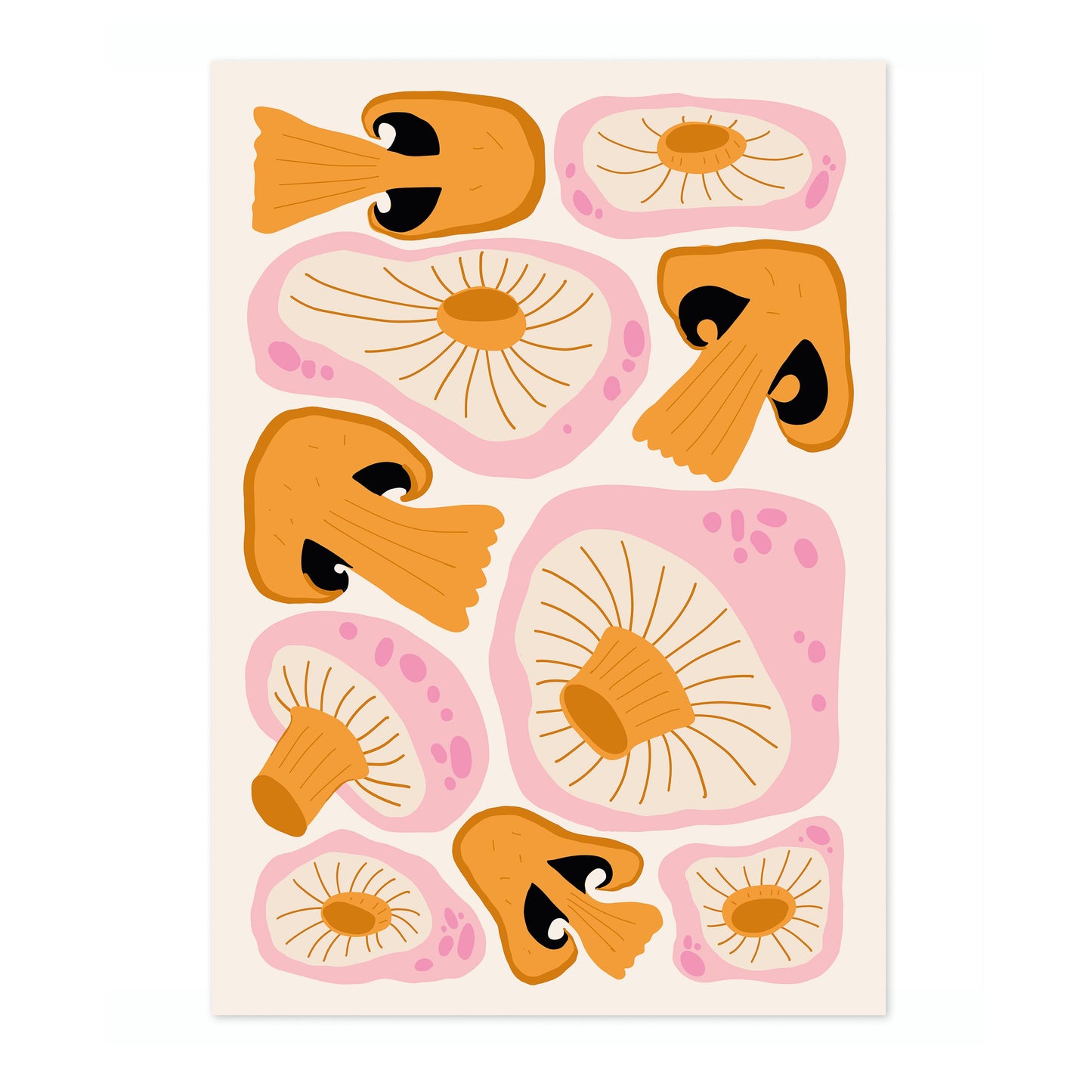 This modern graphic illustration poster features a vibrant array of stylized orange mushrooms against a soft cream background. The detailed caps and gills create an eye-catching pattern, enhanced by subtle pink accents. Ideal for adding a touch of contemporary food-themed art to your space, this portrait poster beautifully captures the fascinating forms of fungal life.