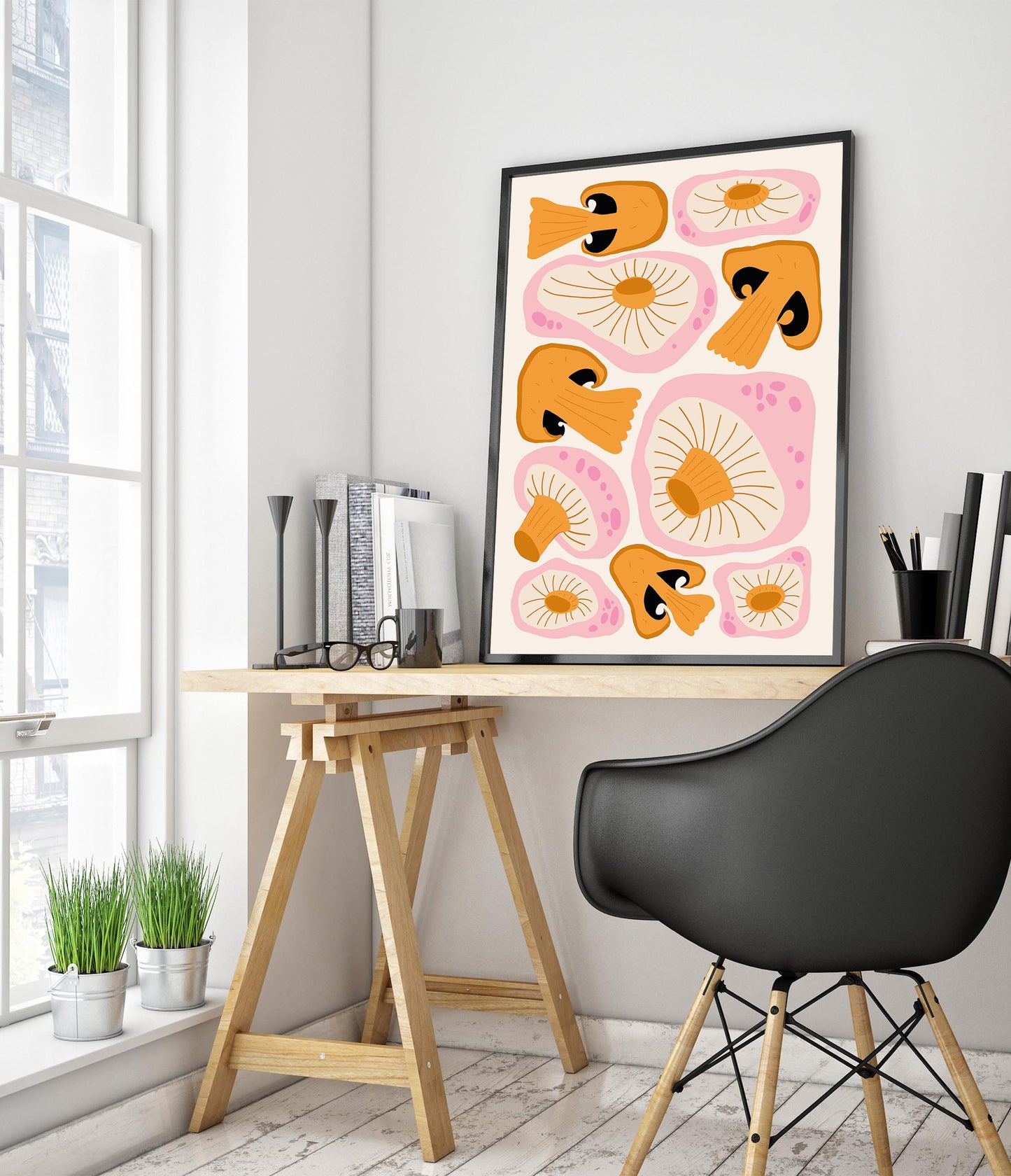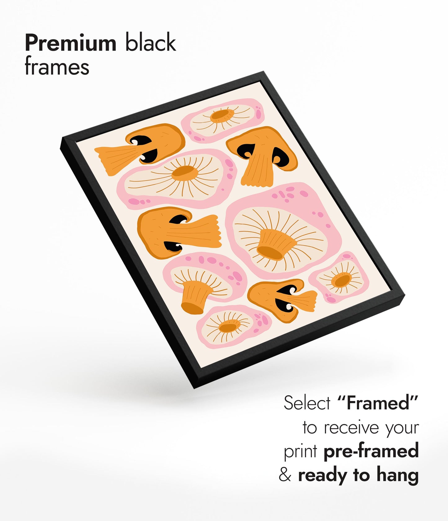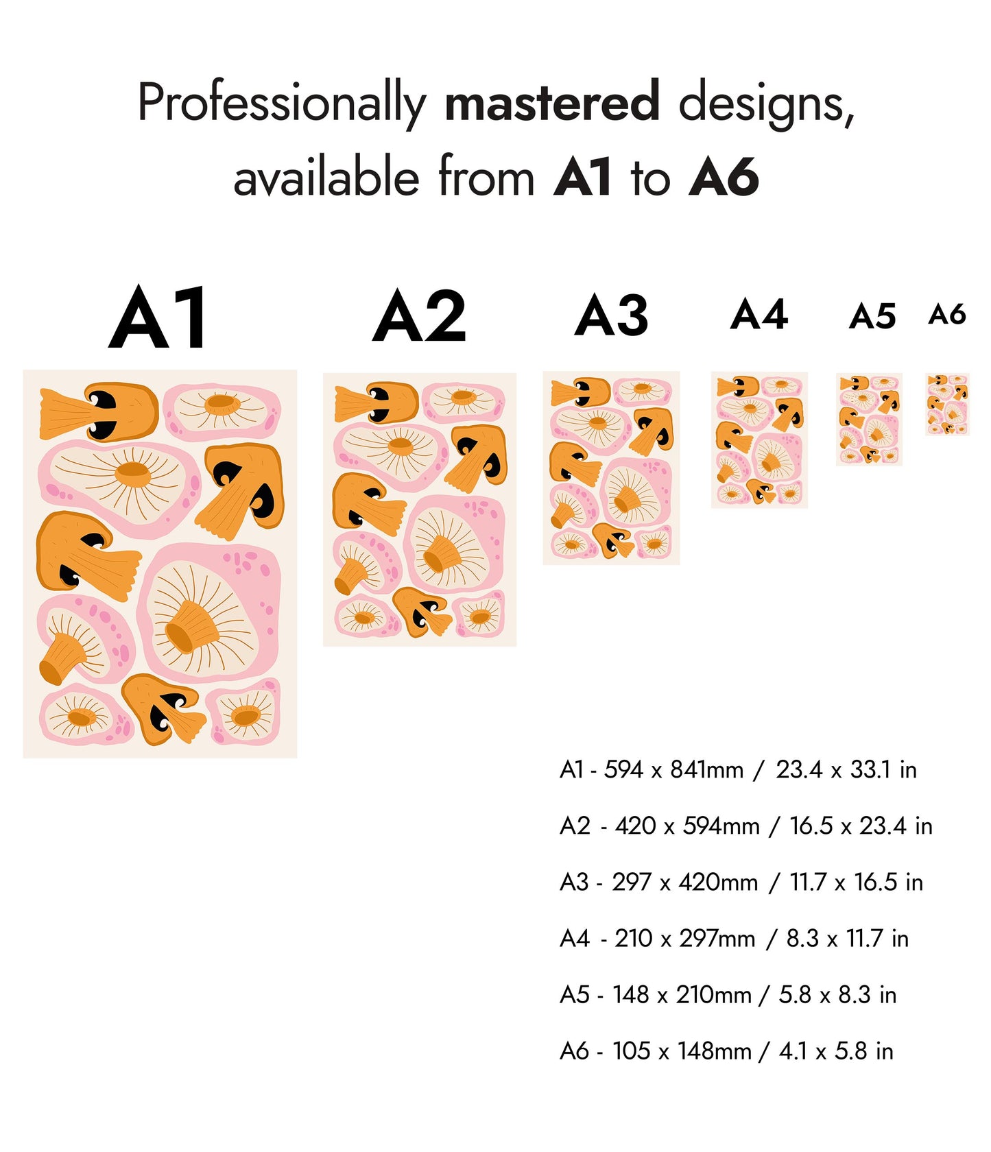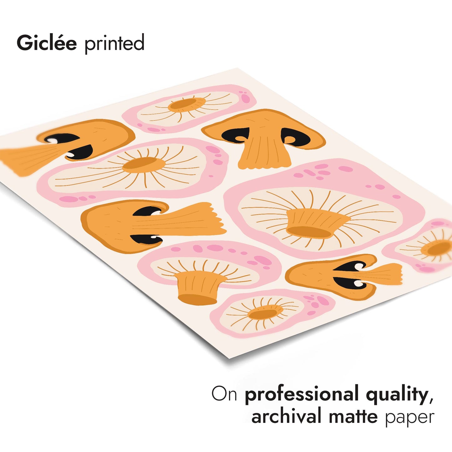 This modern graphic illustration poster features a vibrant array of stylized orange mushrooms against a soft cream background. The detailed caps and gills create an eye-catching pattern, enhanced by subtle pink accents. Ideal for adding a touch of contemporary food-themed art to your space, this portrait poster beautifully captures the fascinating forms of fungal life.