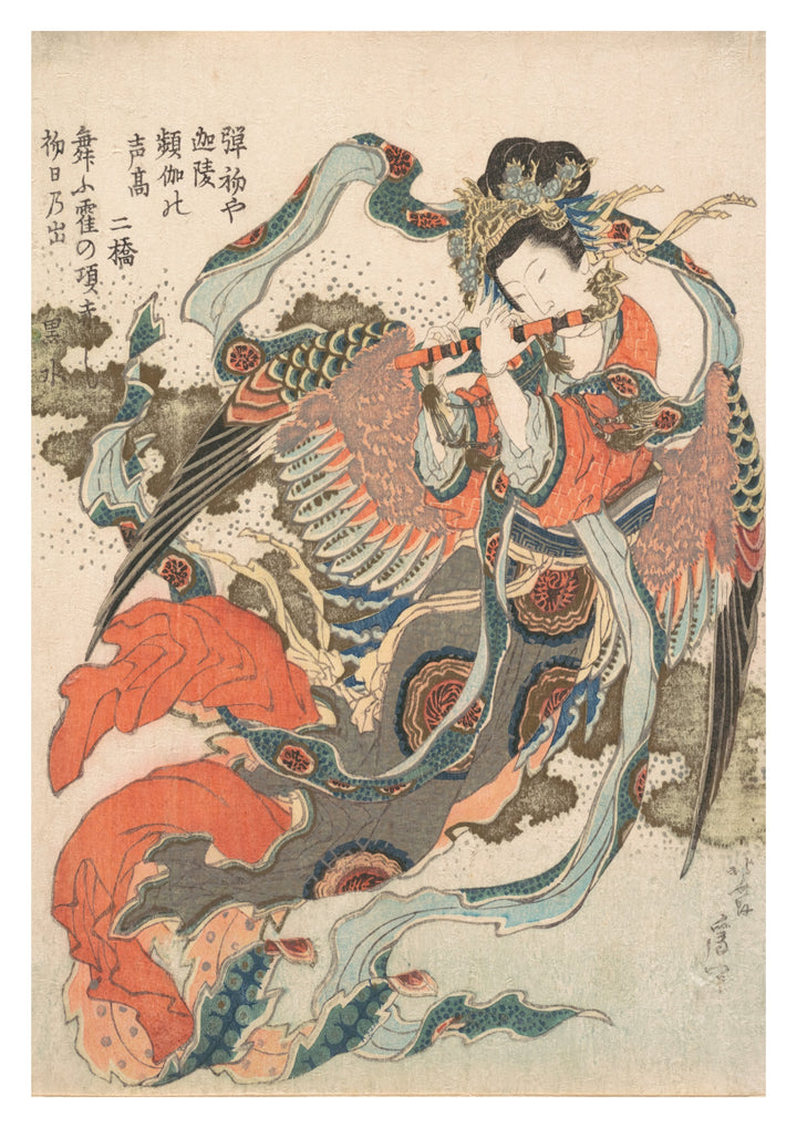 "Mystical Bird (Karyōbinga)" poster, an exquisite woodblock print by Katsushika Hokusai, depicts a mythical bird-woman playing a musical instrument. This traditional Japanese ukiyo-e artwork features vibrant colours and intricate details, capturing the essence of fantasy and mythology. Ideal for lovers of Japanese art and mythology enthusiasts. Perfect for adding a touch of cultural elegance to any space.