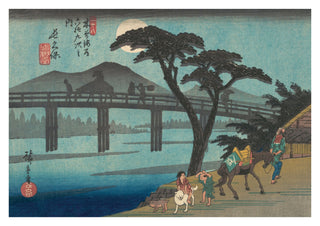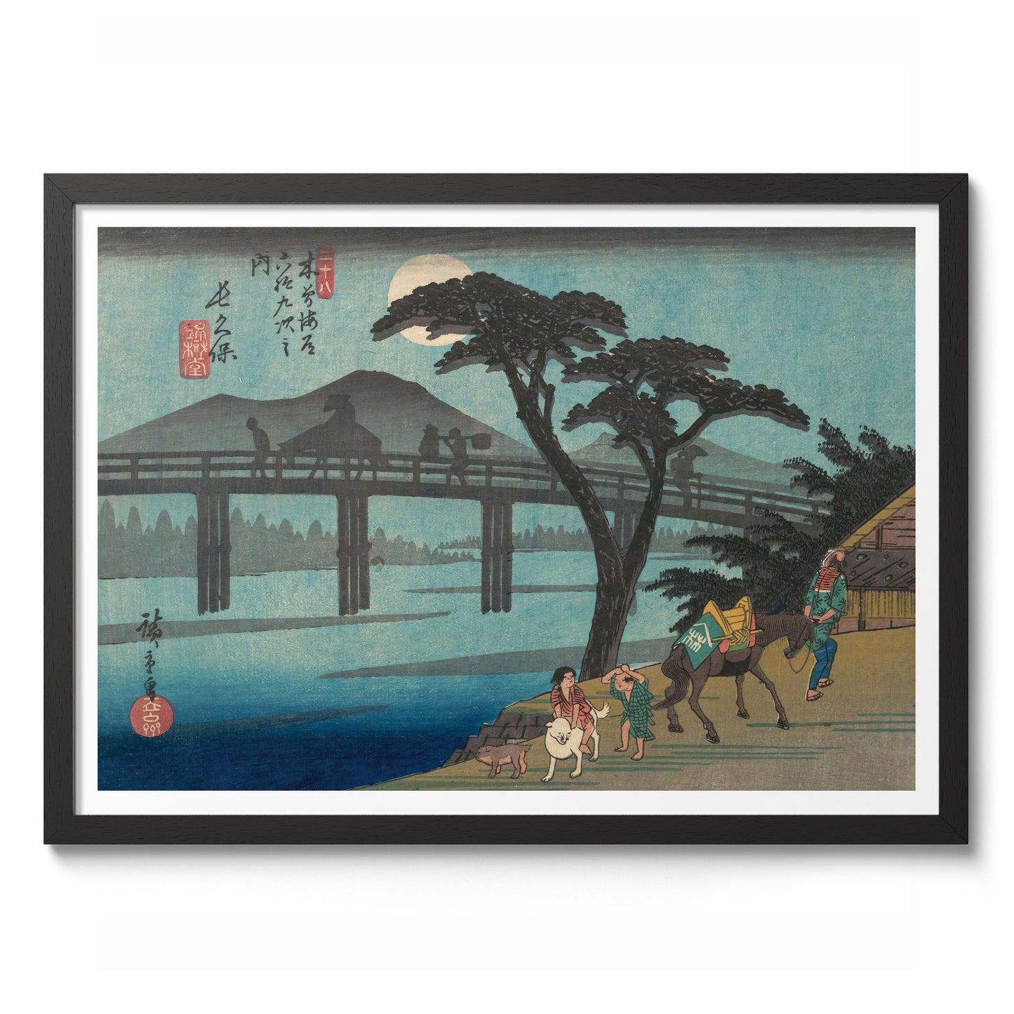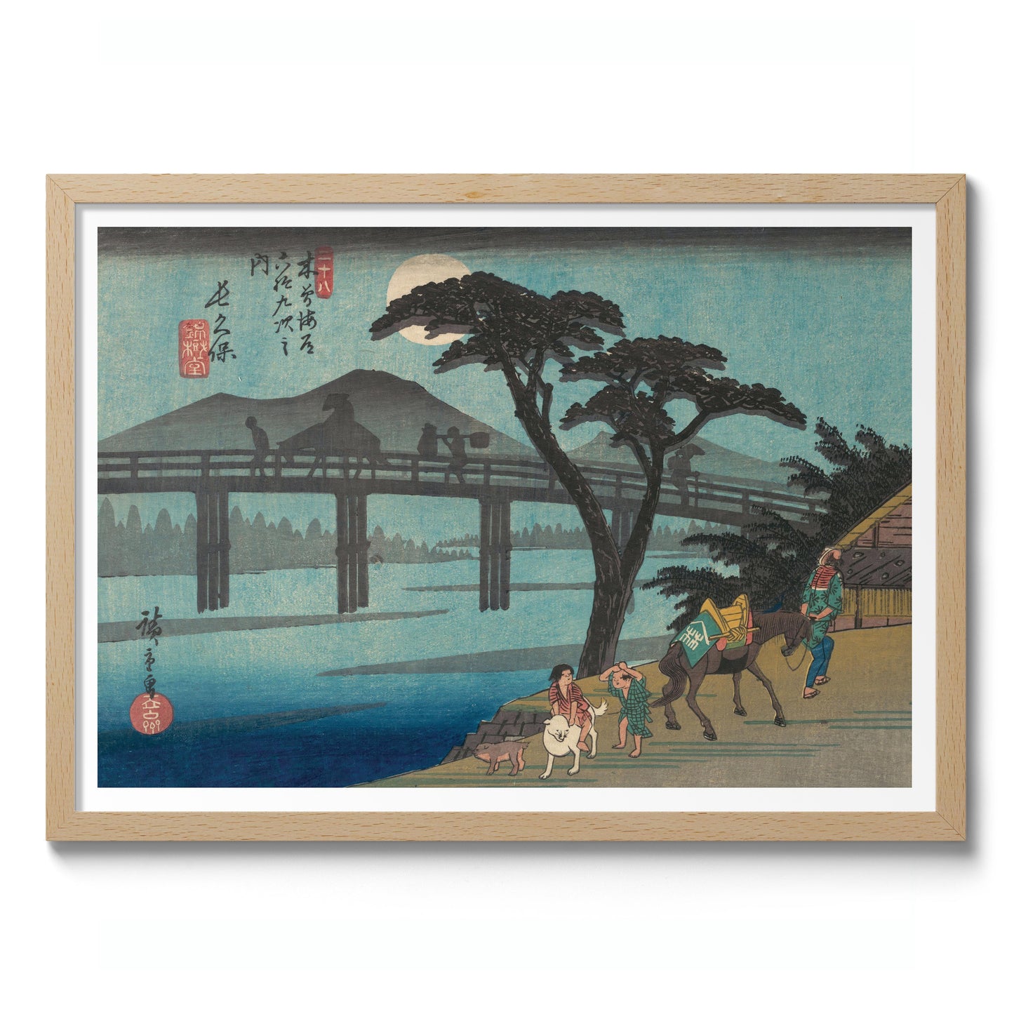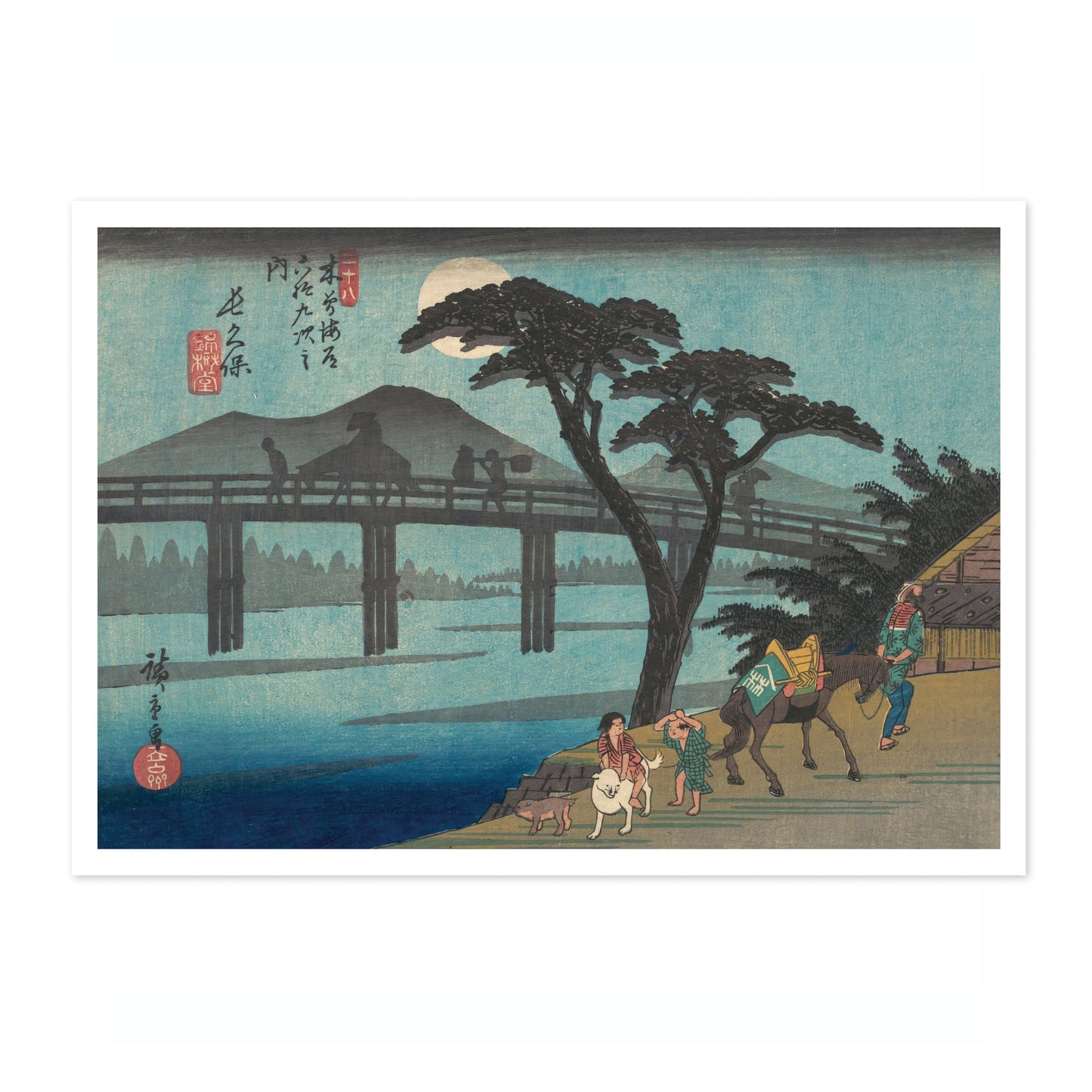 This traditional woodblock print titled "Nagakubo" by Katsushika Hokusai depicts a serene night scene in a Japanese village. A full moon illuminates a bridge spanning a tranquil river, with villagers and a horse passing by. This Ukiyo-e style poster beautifully captures the essence of rural Japan, combining natural and human elements in a harmonious composition.
