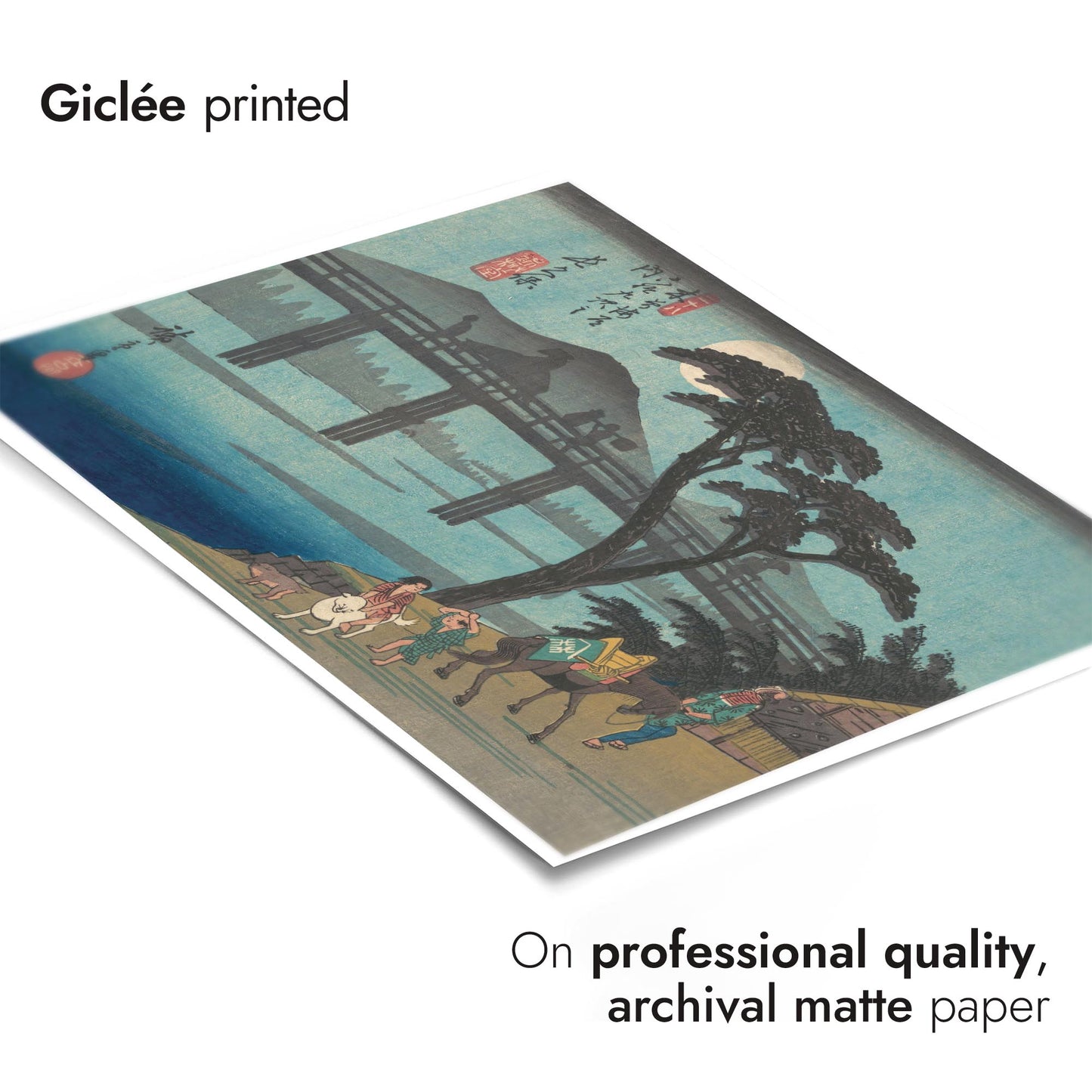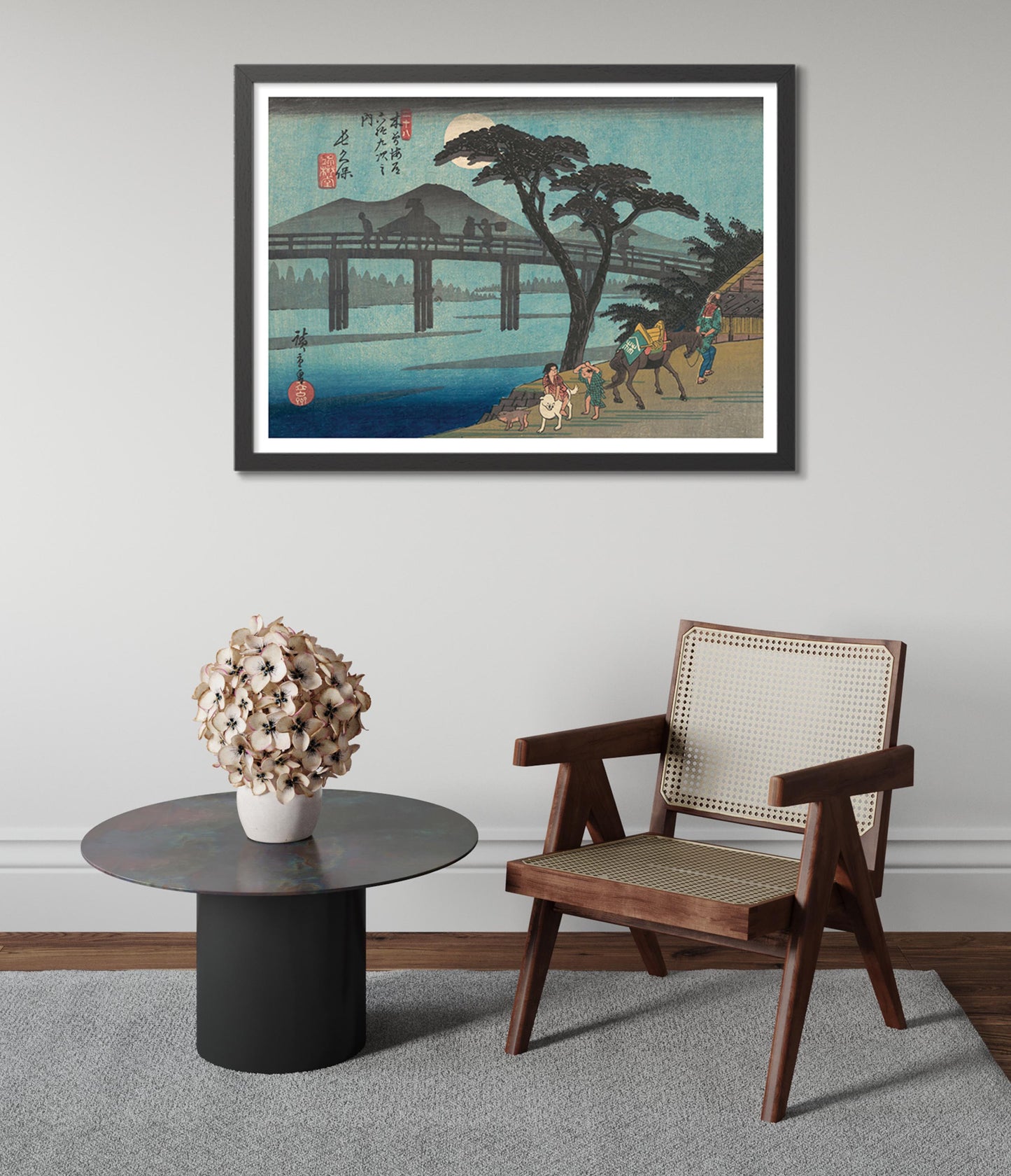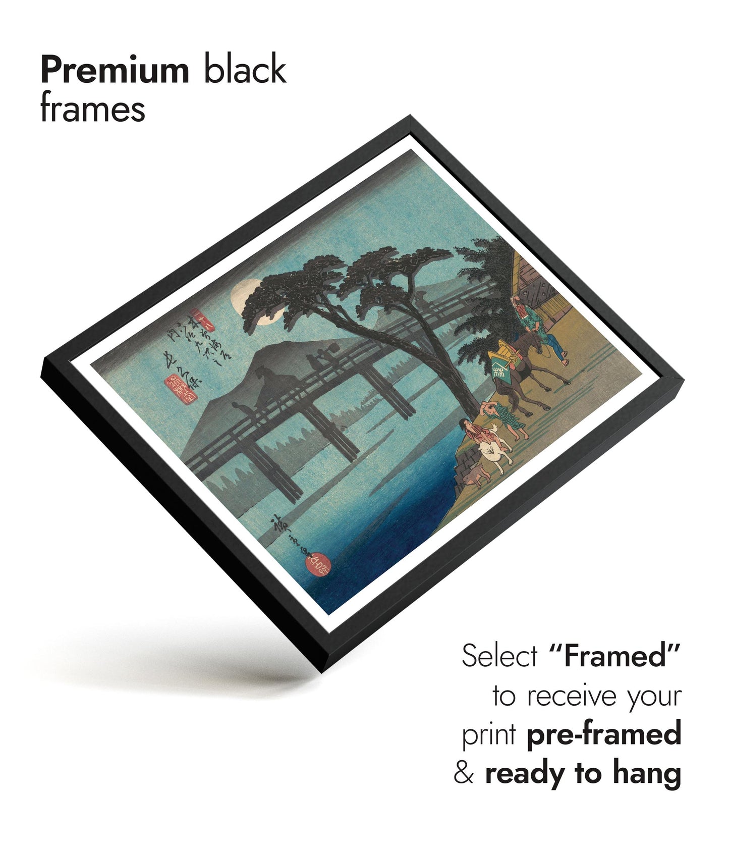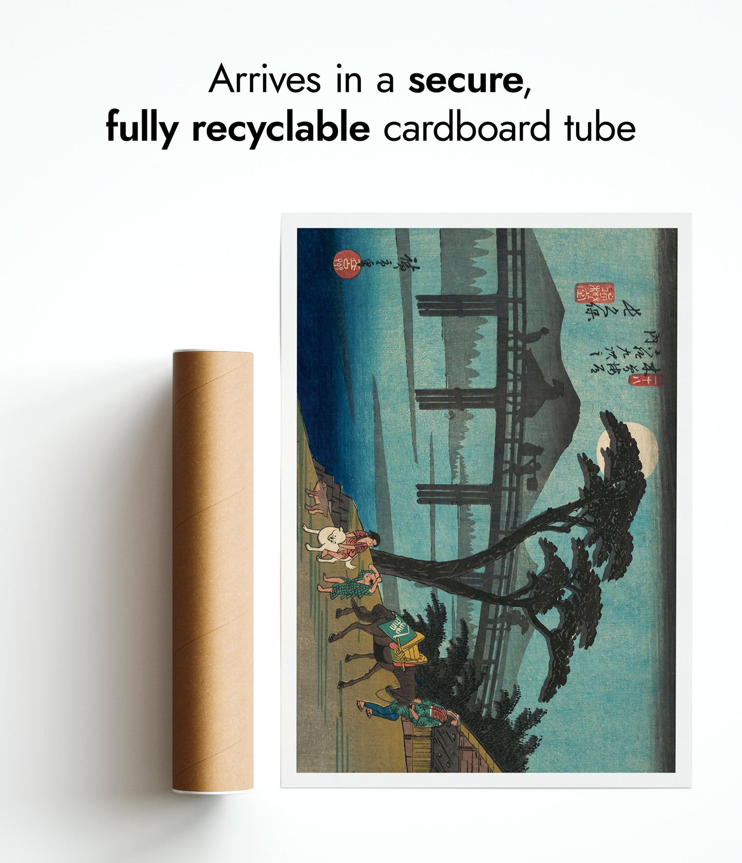This traditional woodblock print titled "Nagakubo" by Katsushika Hokusai depicts a serene night scene in a Japanese village. A full moon illuminates a bridge spanning a tranquil river, with villagers and a horse passing by. This Ukiyo-e style poster beautifully captures the essence of rural Japan, combining natural and human elements in a harmonious composition.