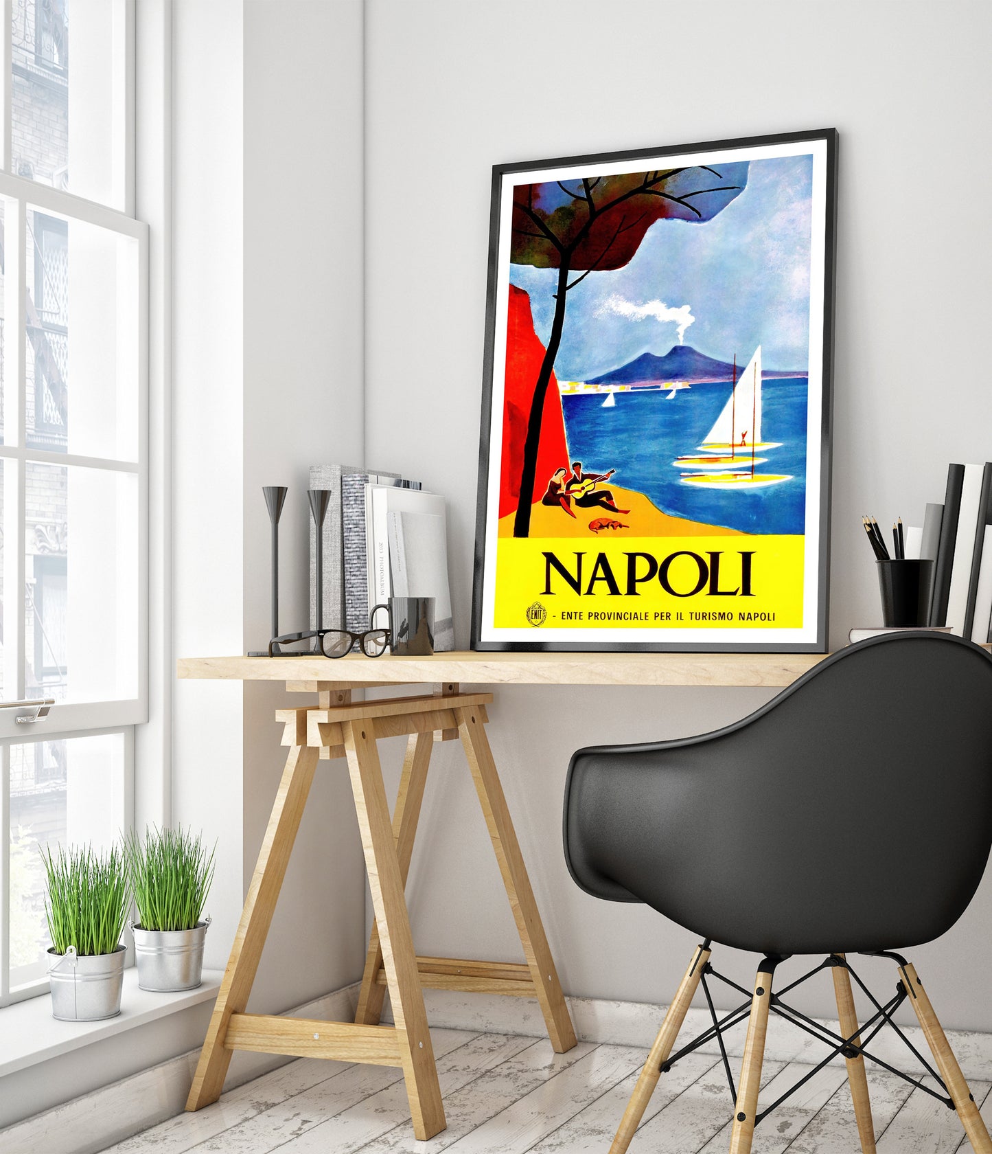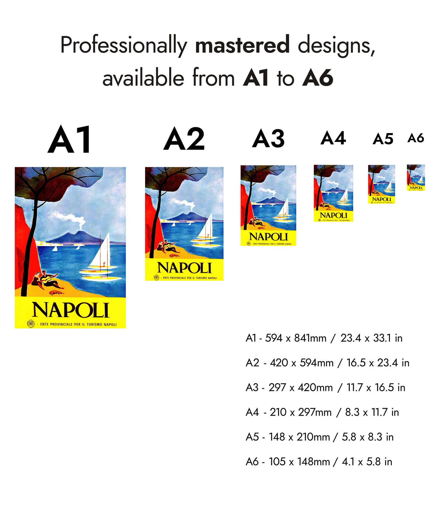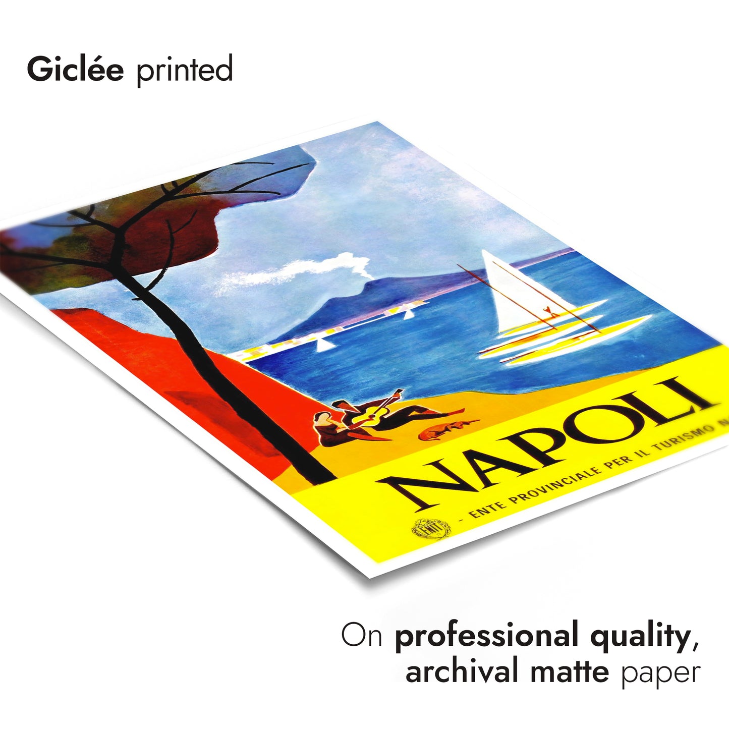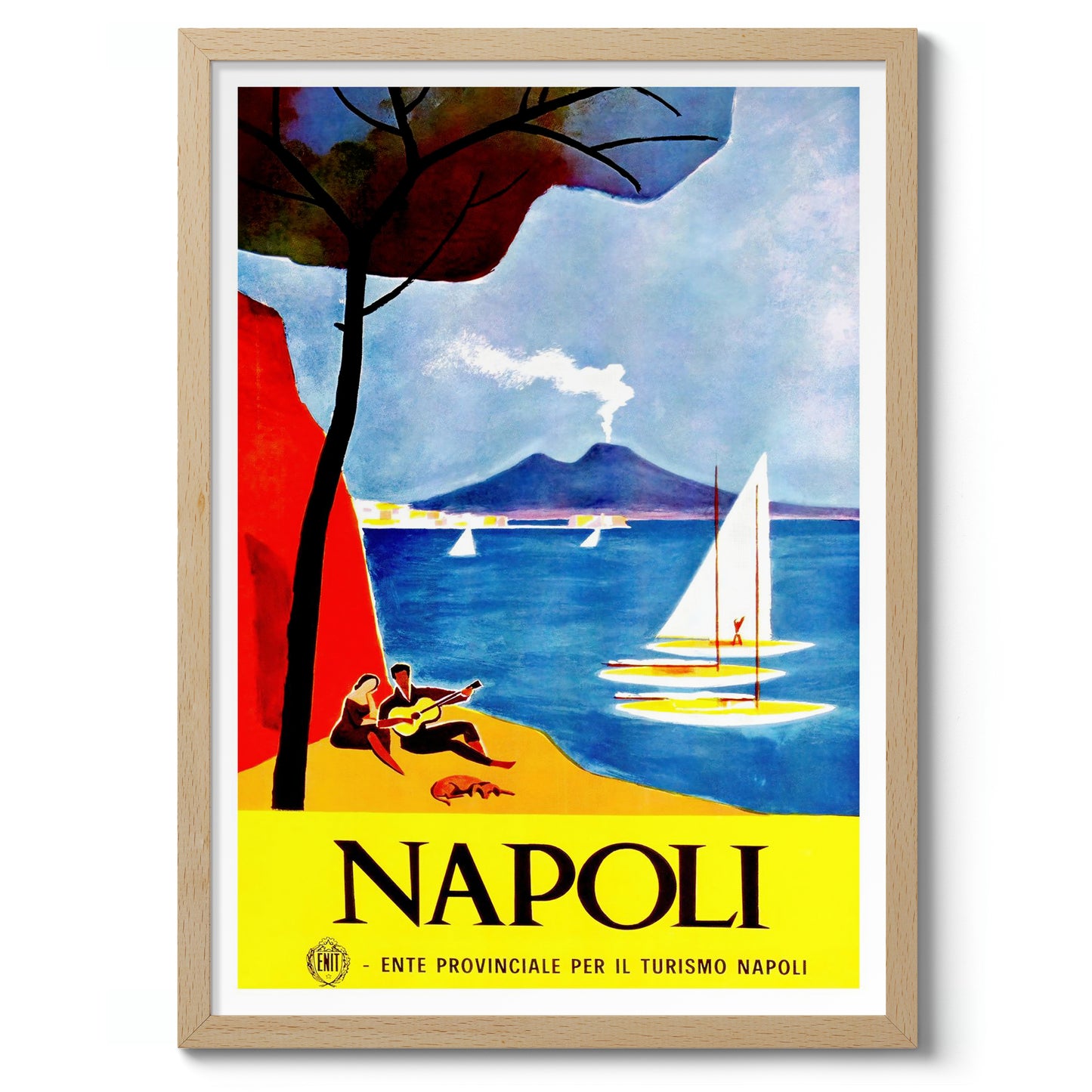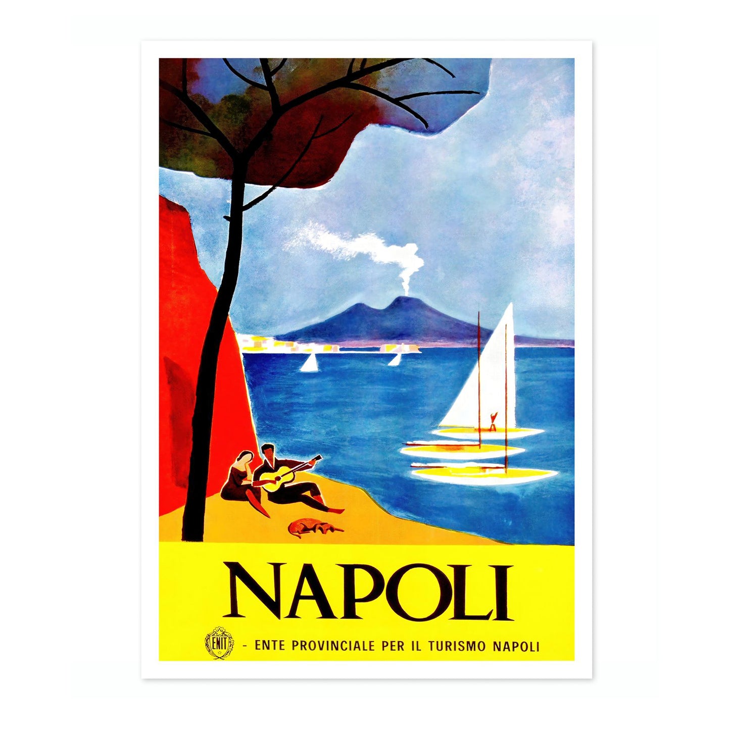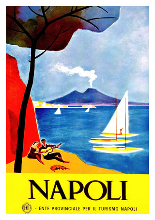 This vintage Napoli poster beautifully captures the allure of Italy's coastal charm. It features a vibrant scene with a smoking volcano in the backdrop, tranquil sailboats on glistening blue waters, and a serene beach setting with a couple basking in the Mediterranean ambiance. Dominant hues of blue and yellow contrast elegantly, evoking a sense of warmth and nostalgia. Ideal for travel enthusiasts and art collectors.