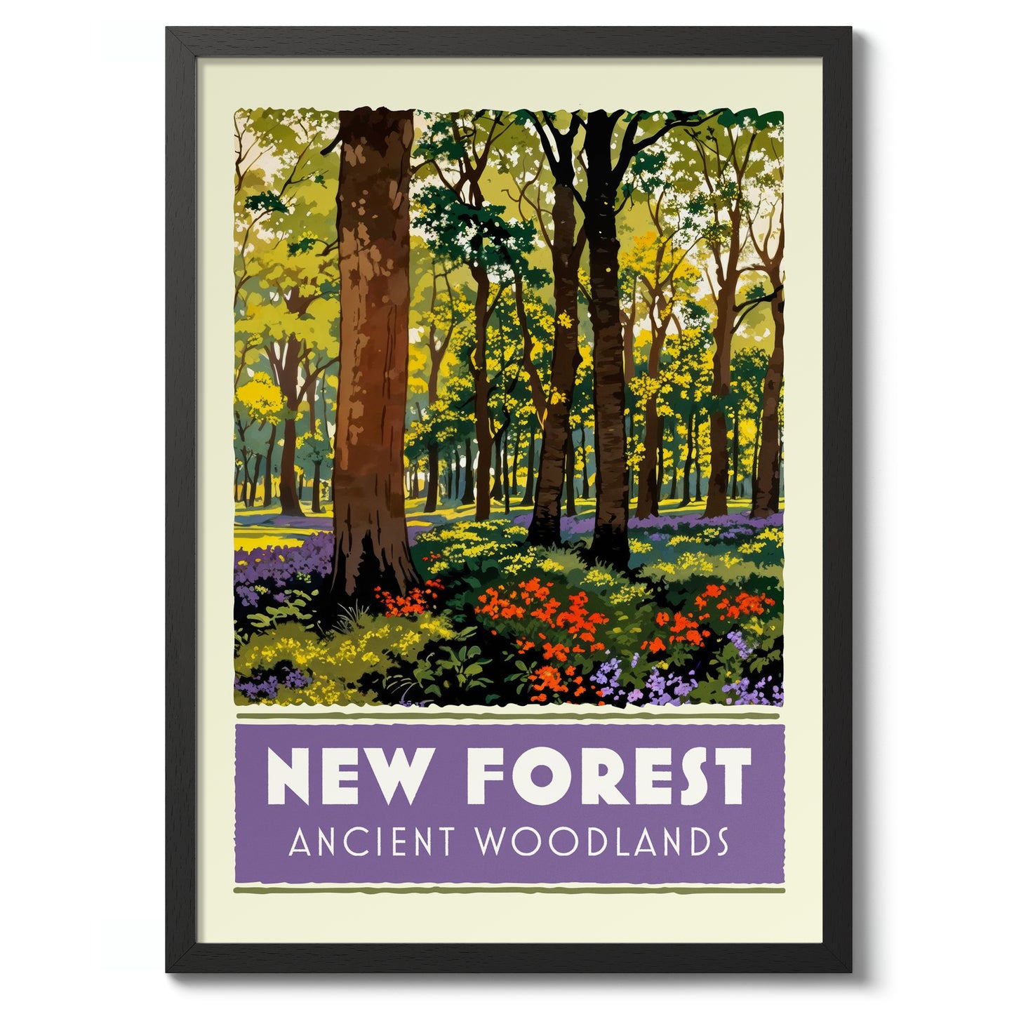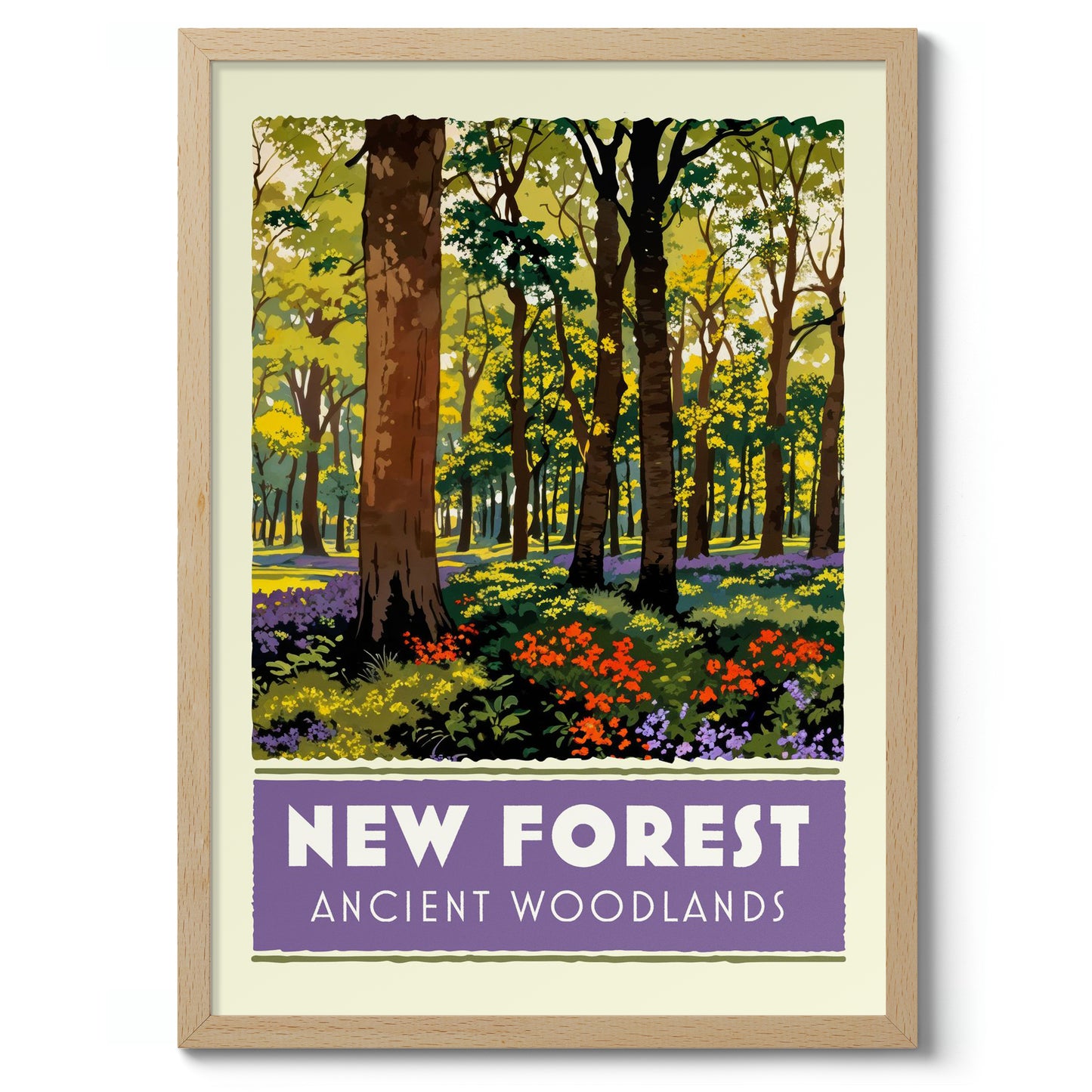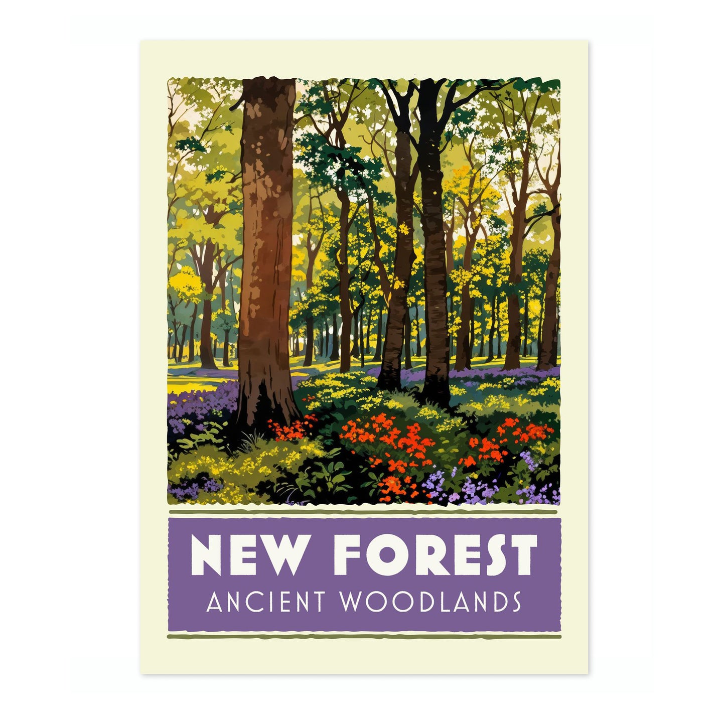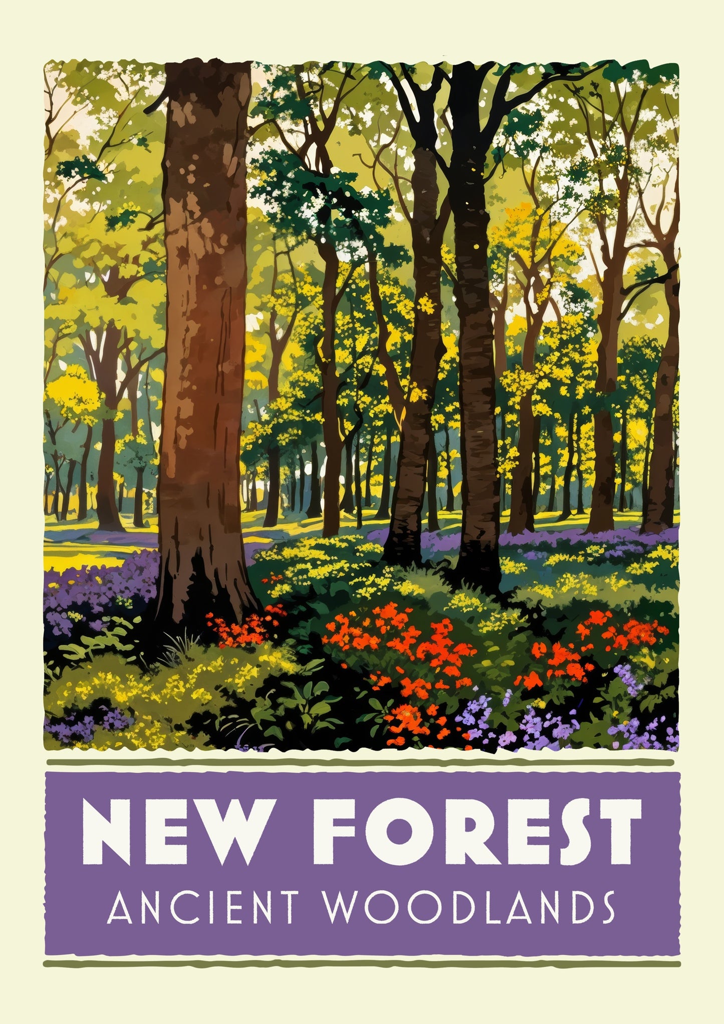 Experience the serene beauty of the "New Forest, Ancient Woodlands" poster, a vintage-style illustration capturing the lush greenery and vibrant wildflowers of England's storied forest. Bathed in dappled sunlight, this artwork evokes a tranquil spring or summer day, ideal for nature enthusiasts and admirers of Britain's picturesque landscapes. Featuring bold purples and greens, it’s a perfect decorative piece.