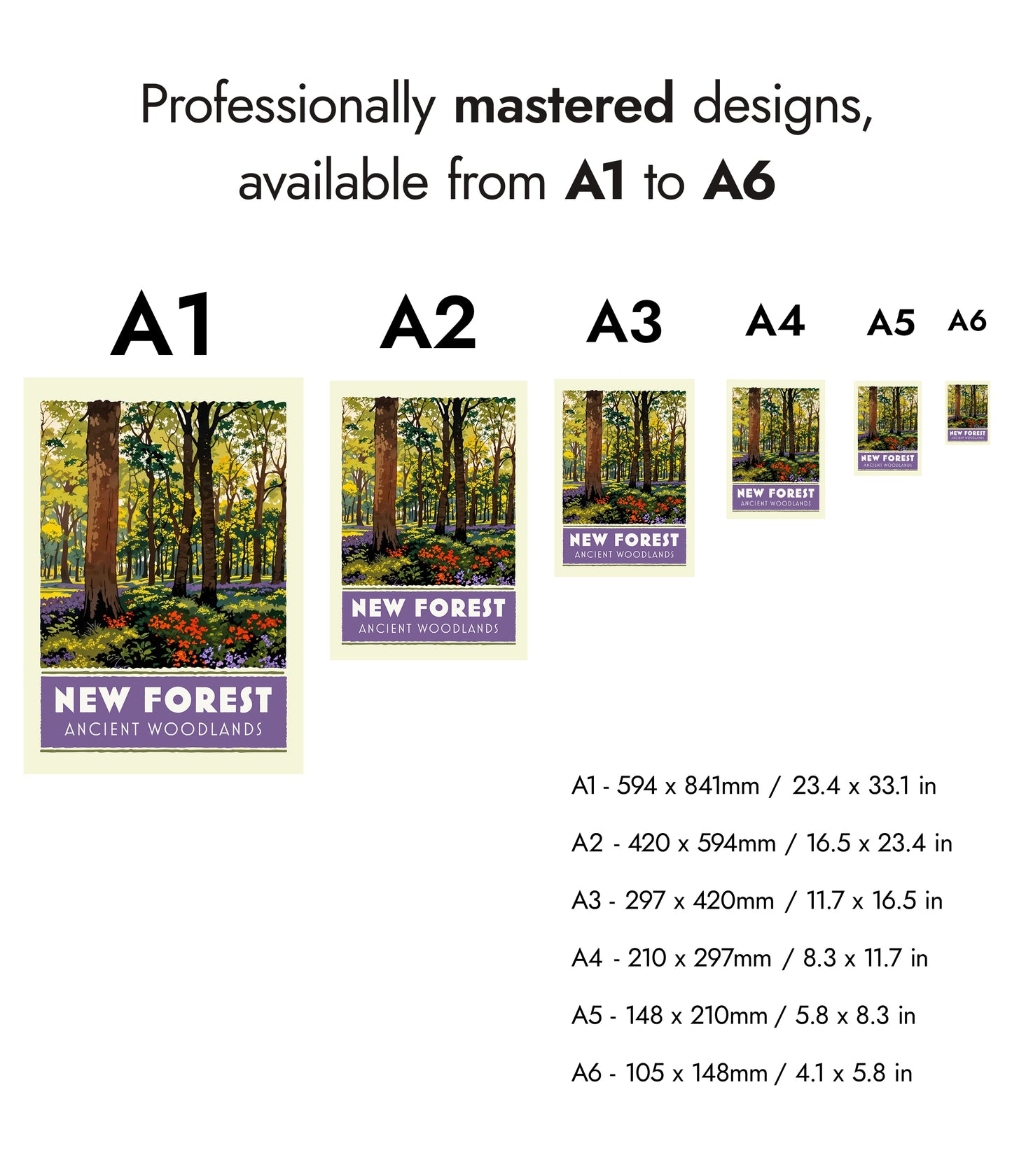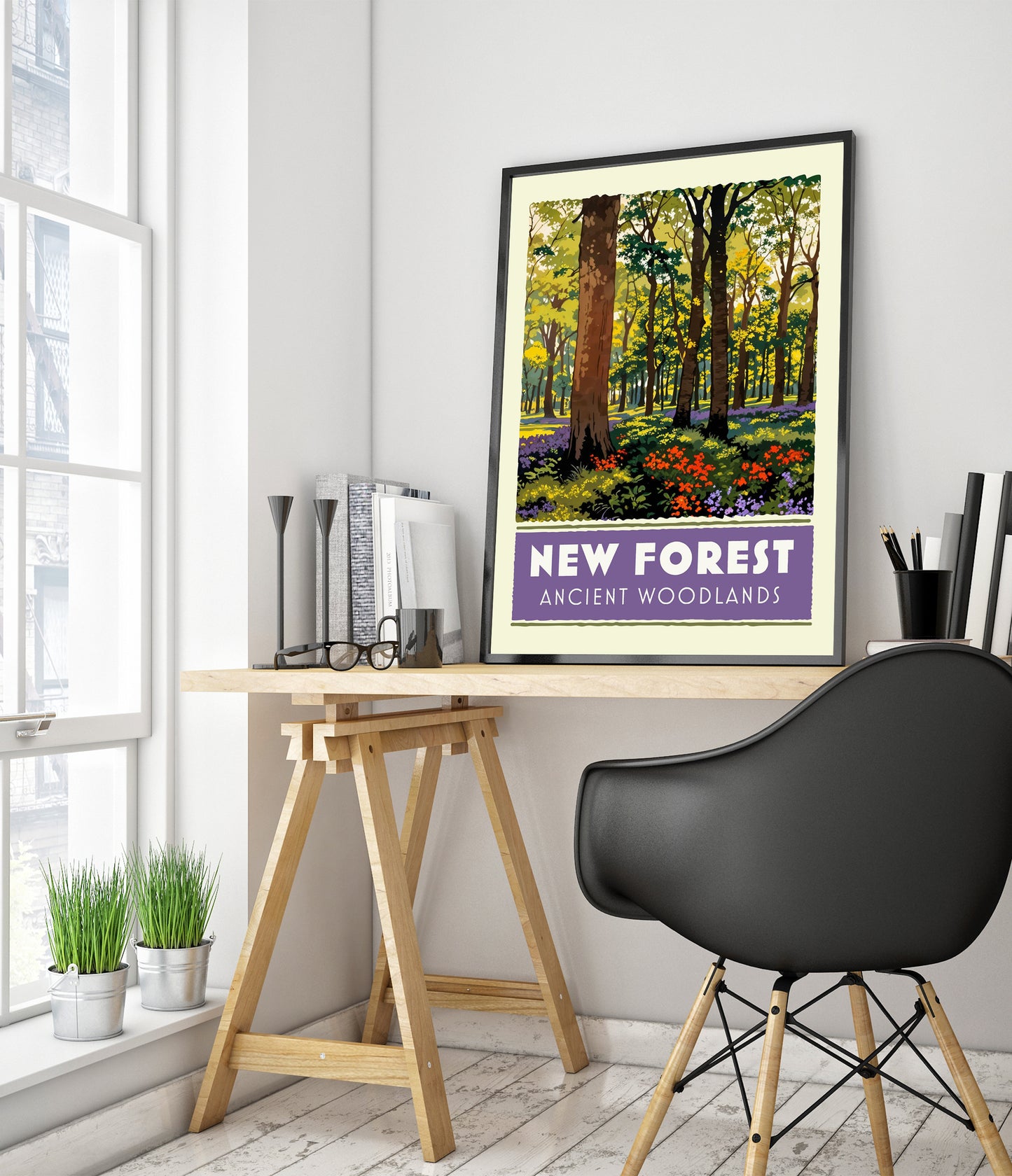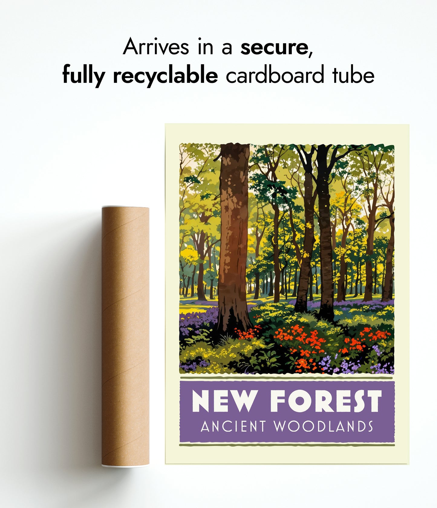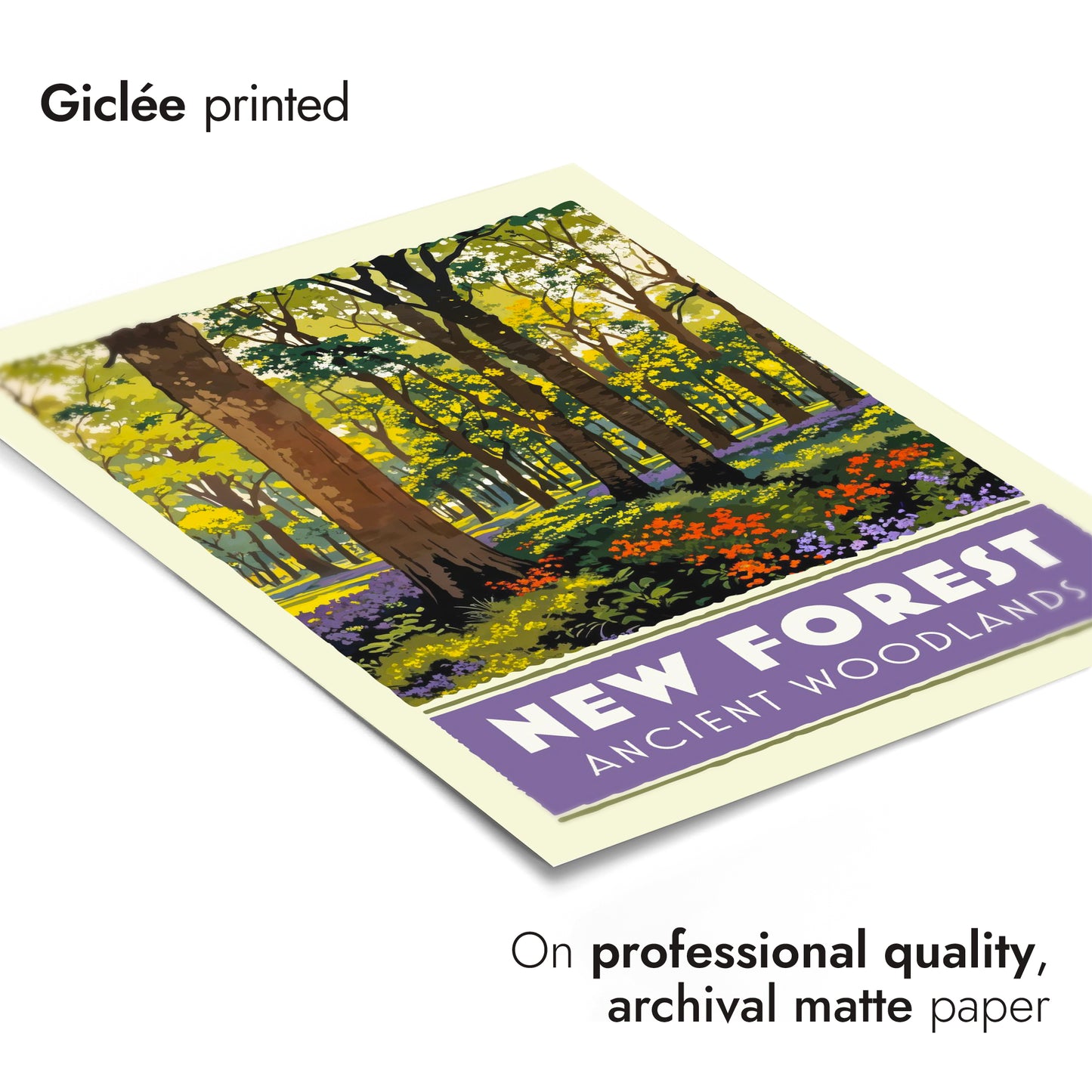 Experience the serene beauty of the "New Forest, Ancient Woodlands" poster, a vintage-style illustration capturing the lush greenery and vibrant wildflowers of England's storied forest. Bathed in dappled sunlight, this artwork evokes a tranquil spring or summer day, ideal for nature enthusiasts and admirers of Britain's picturesque landscapes. Featuring bold purples and greens, it’s a perfect decorative piece.