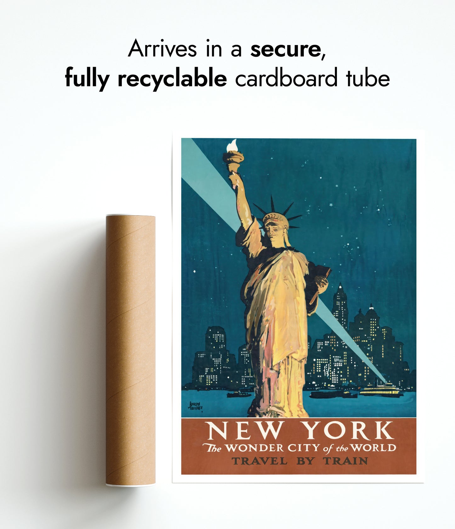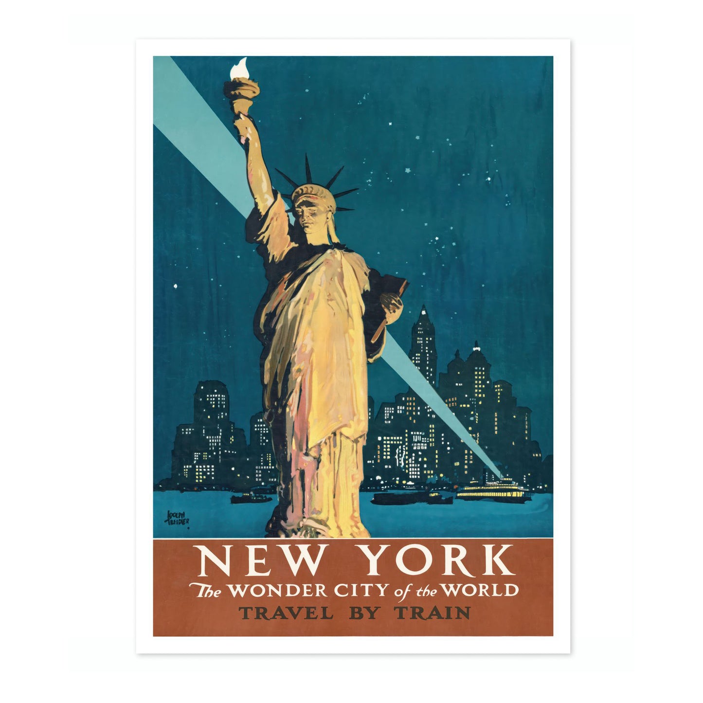 This vintage illustration poster captures the Statue of Liberty illuminated against a nighttime New York City skyline. A radiant spotlight highlights the iconic figure, symbolizing hope and freedom. The artwork's deep blue tones contrast with the statue's warm hues, evoking travel nostalgia. "New York: The Wonder City of the World" promotes railway journeys, offering a glimpse into the city's allure by train.