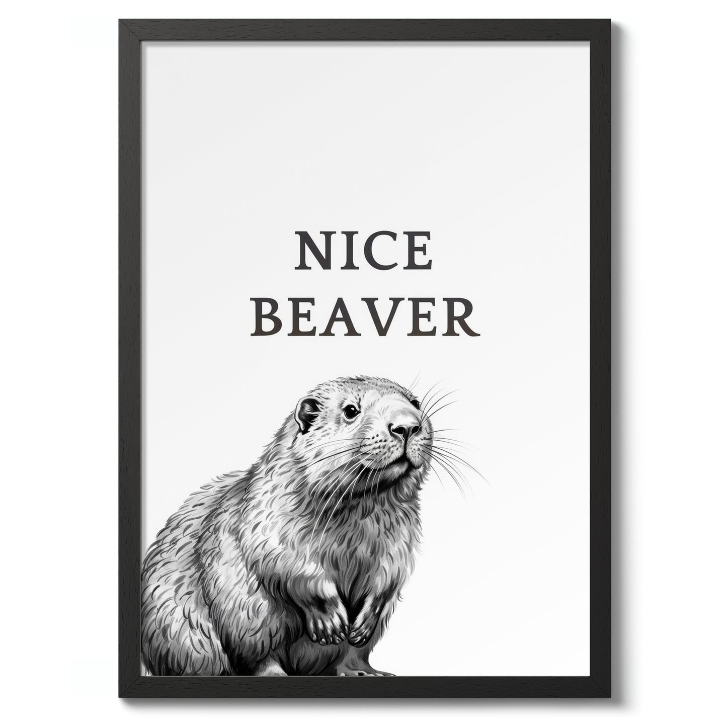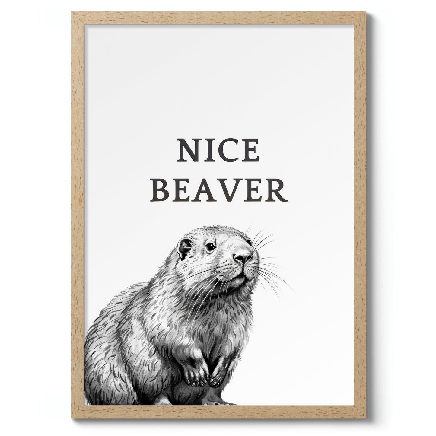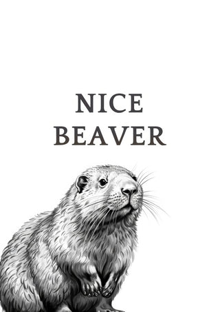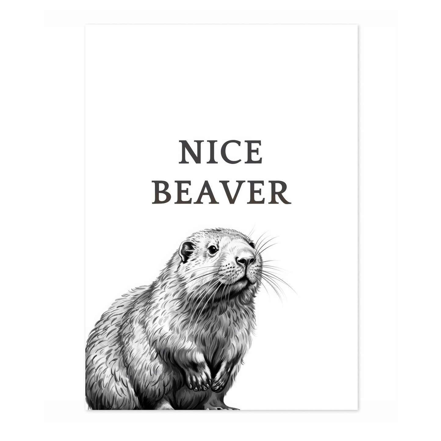 This black and white poster features a detailed illustration of an endearing beaver, accompanied by the humorous phrase "Nice Beaver." Perfect for adding a playful touch to bathroom decor, this typographic artwork combines clever text with skilled animal illustration. Its minimalist color palette ensures it complements various interior styles. Ideal for those seeking a unique and humorous wall feature.