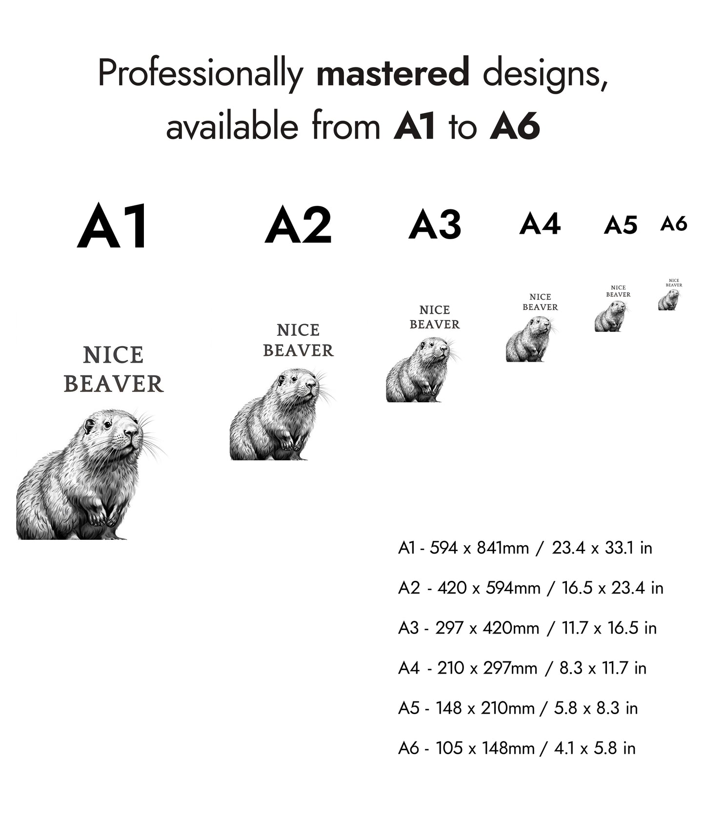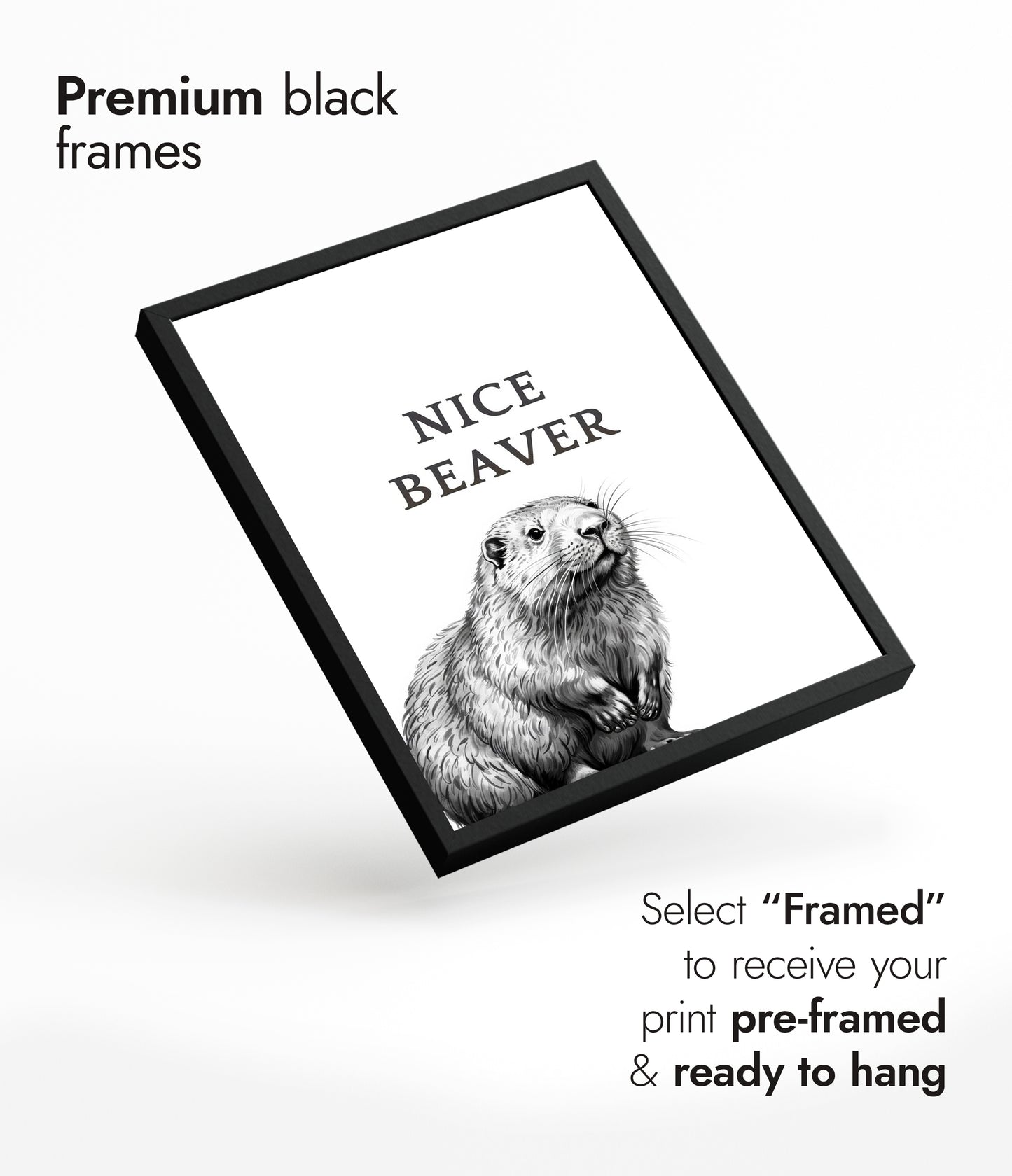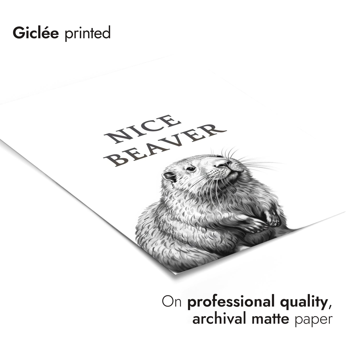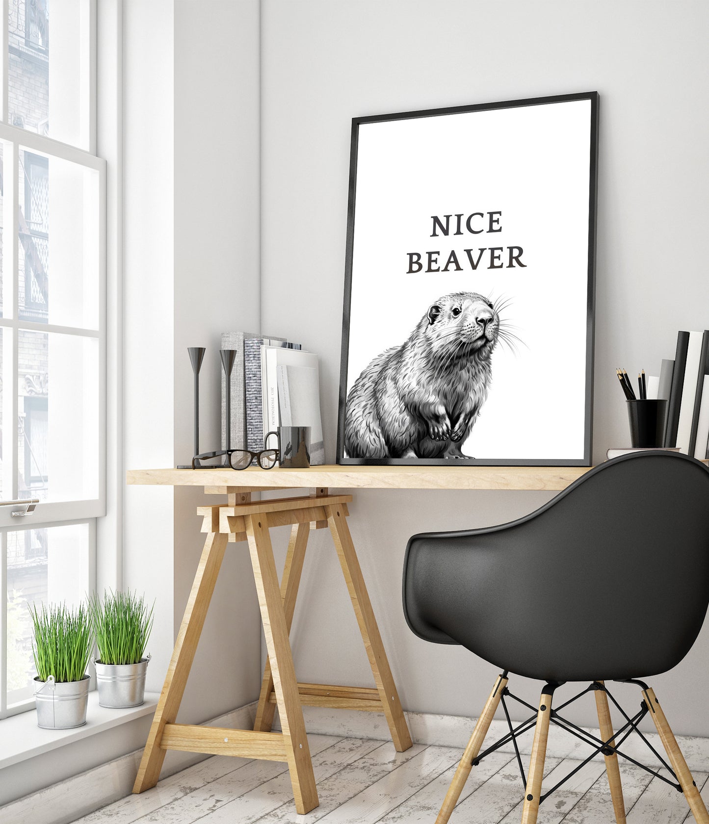 This black and white poster features a detailed illustration of an endearing beaver, accompanied by the humorous phrase "Nice Beaver." Perfect for adding a playful touch to bathroom decor, this typographic artwork combines clever text with skilled animal illustration. Its minimalist color palette ensures it complements various interior styles. Ideal for those seeking a unique and humorous wall feature.