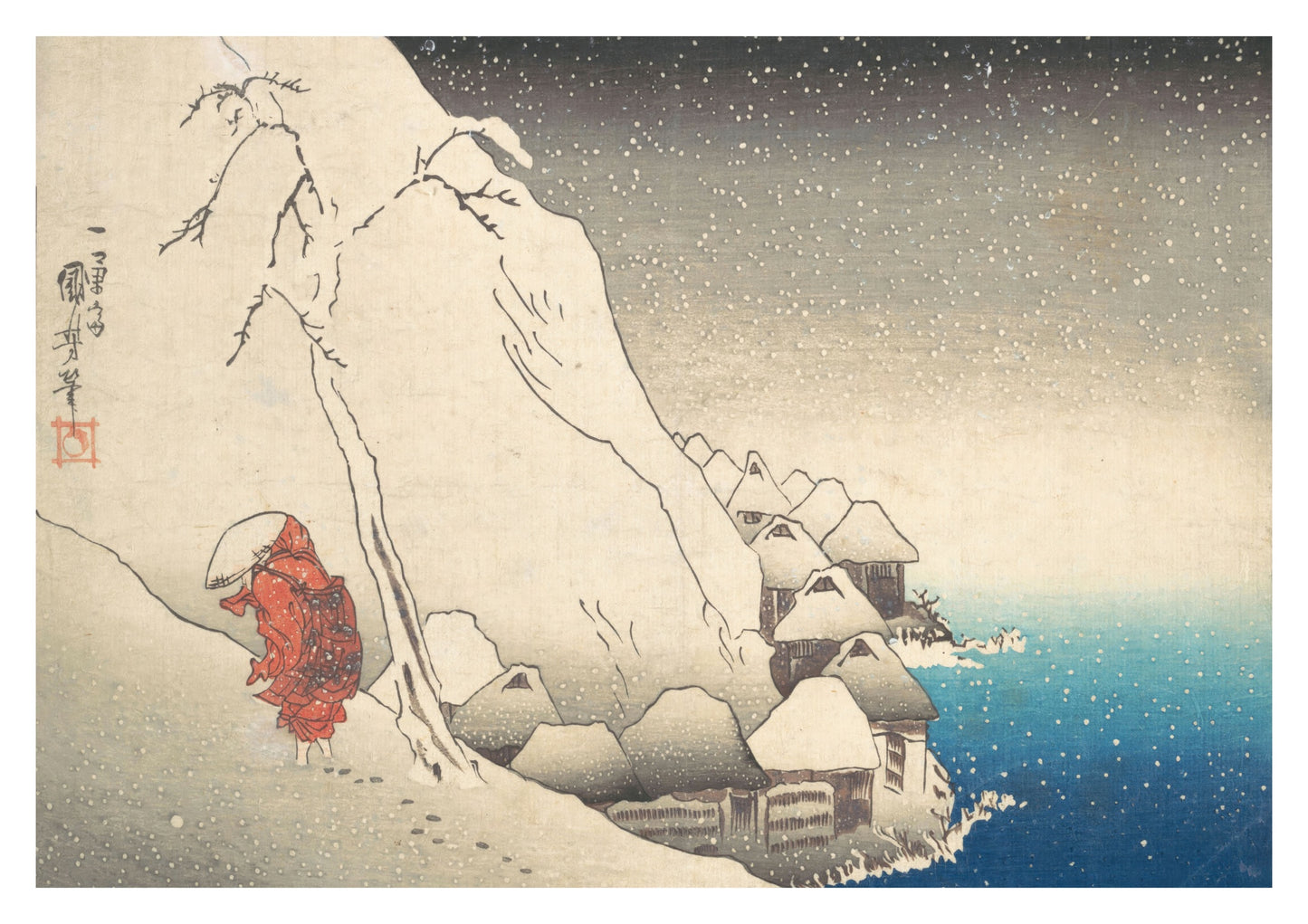 This poster features "Nichiren in Snow at Tsukahara, Sodo Province" by Utagawa Kuniyoshi. The traditional woodblock Ukiyo-E illustration captures a serene winter landscape, with a solitary figure in red against a backdrop of snow-covered village houses and a tranquil icy bay. Ideal for adding a touch of classic Japanese art to your space.