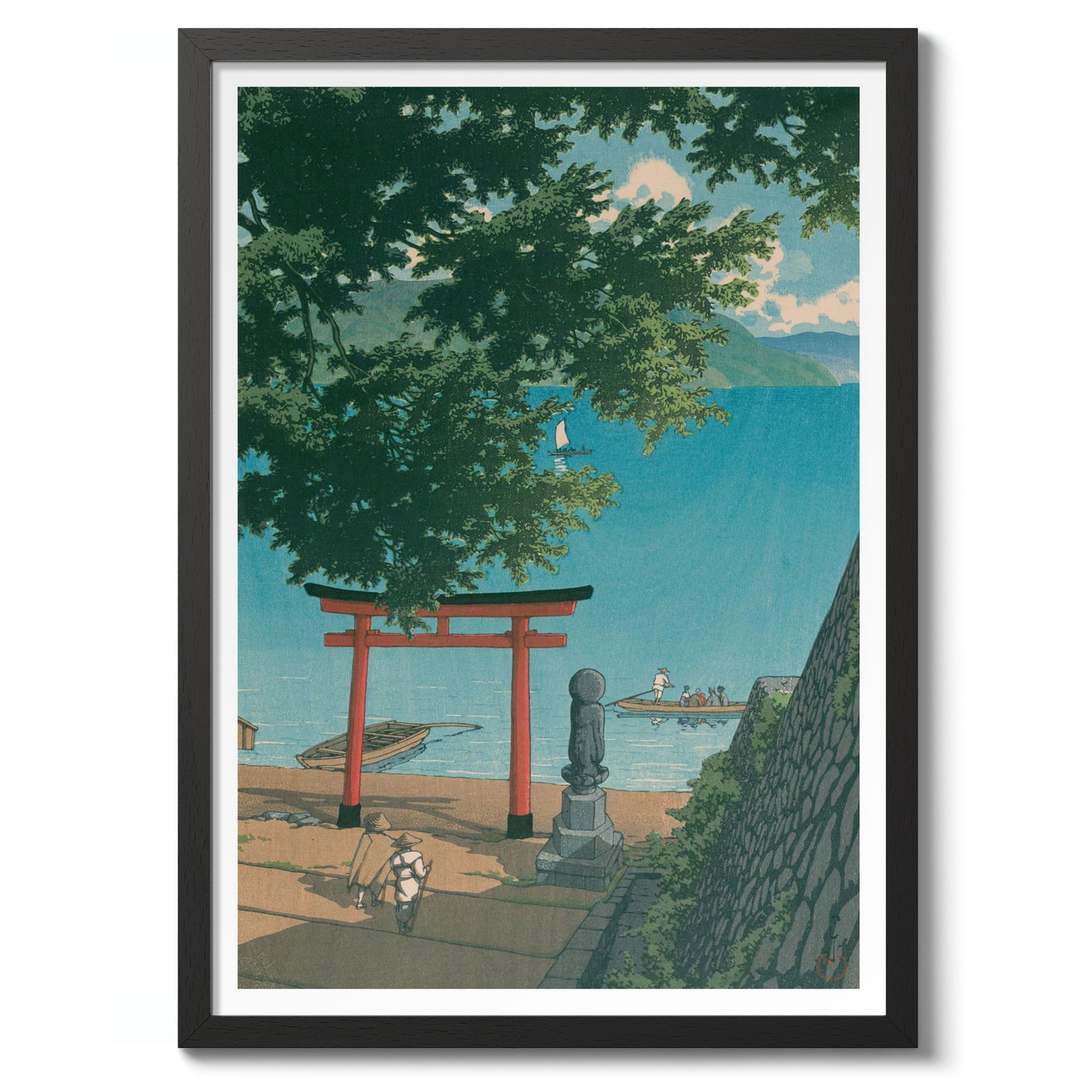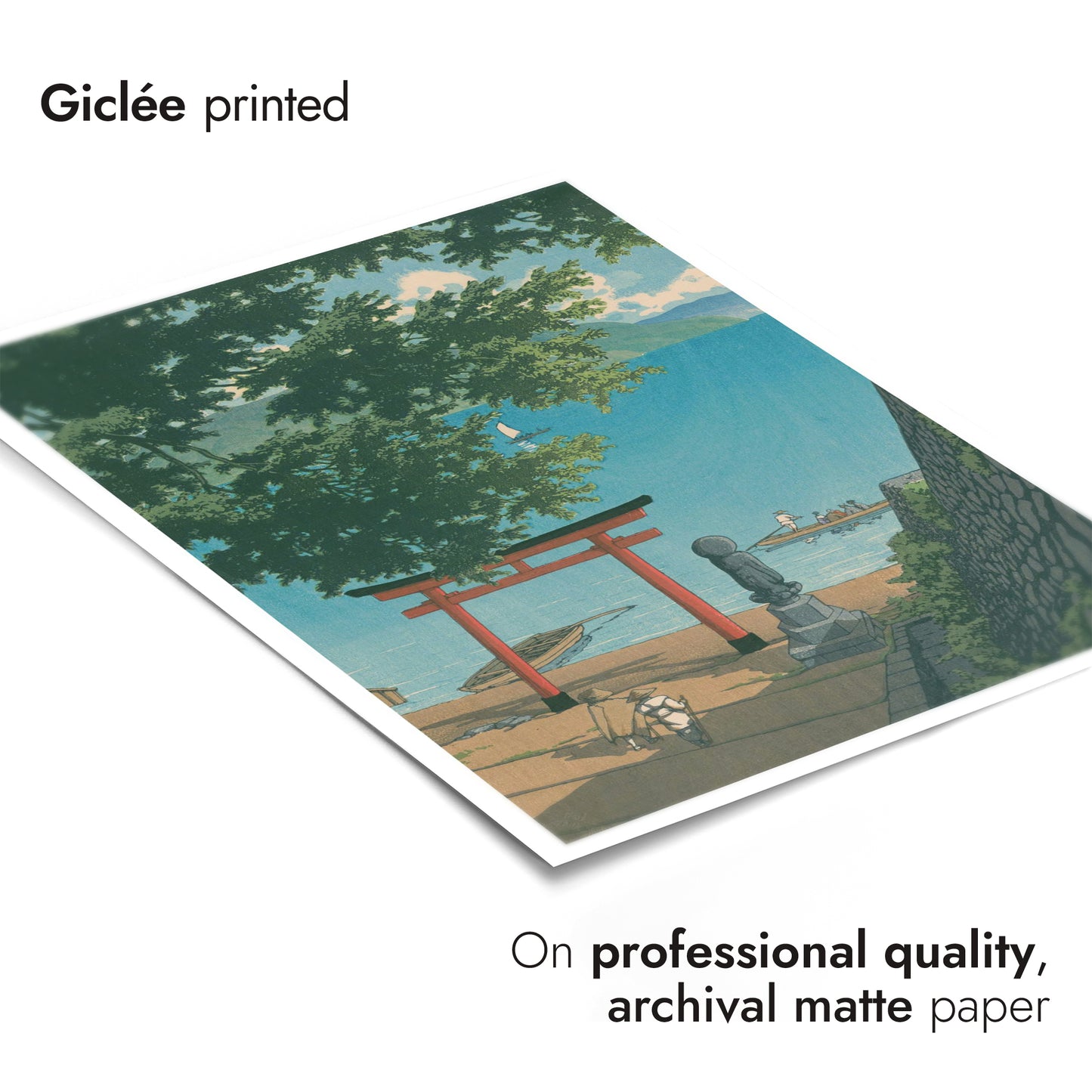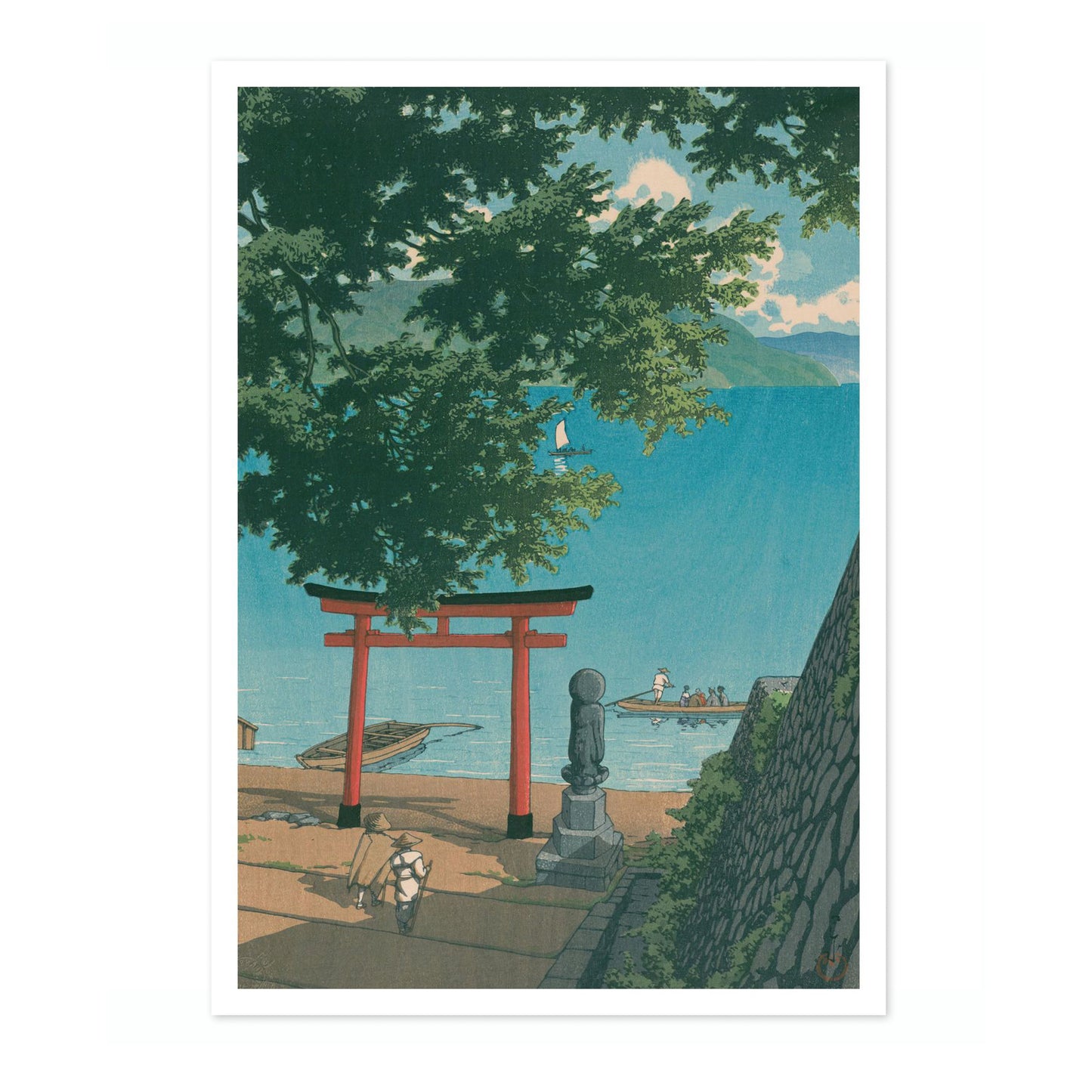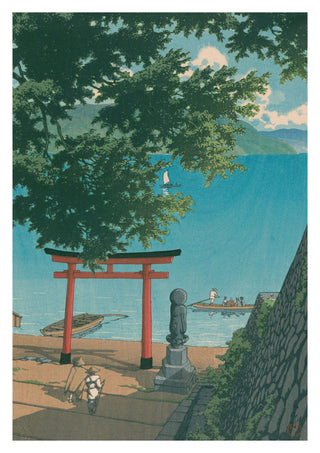 This poster captures Kawase Hasui's "Nikko Chuzenji Lake Utagahama," featuring a serene lakeside scene. A vibrant red torii gate and lush greenery frame the tranquil blue waters. The descending path leads to a boat and figures by the lake, embodying traditional Japanese woodblock art. This depiction of nature and cultural symbols offers a calming visual experience.