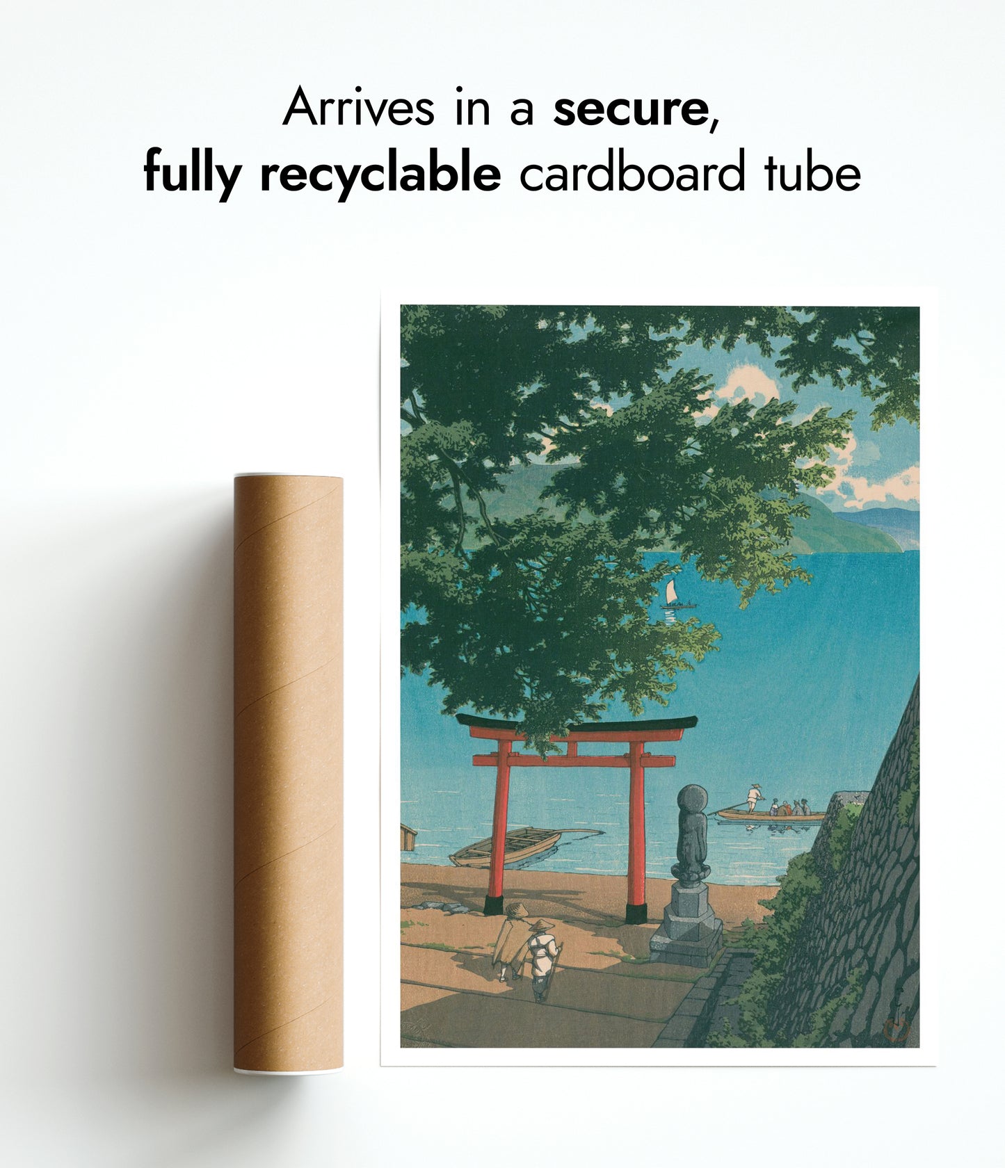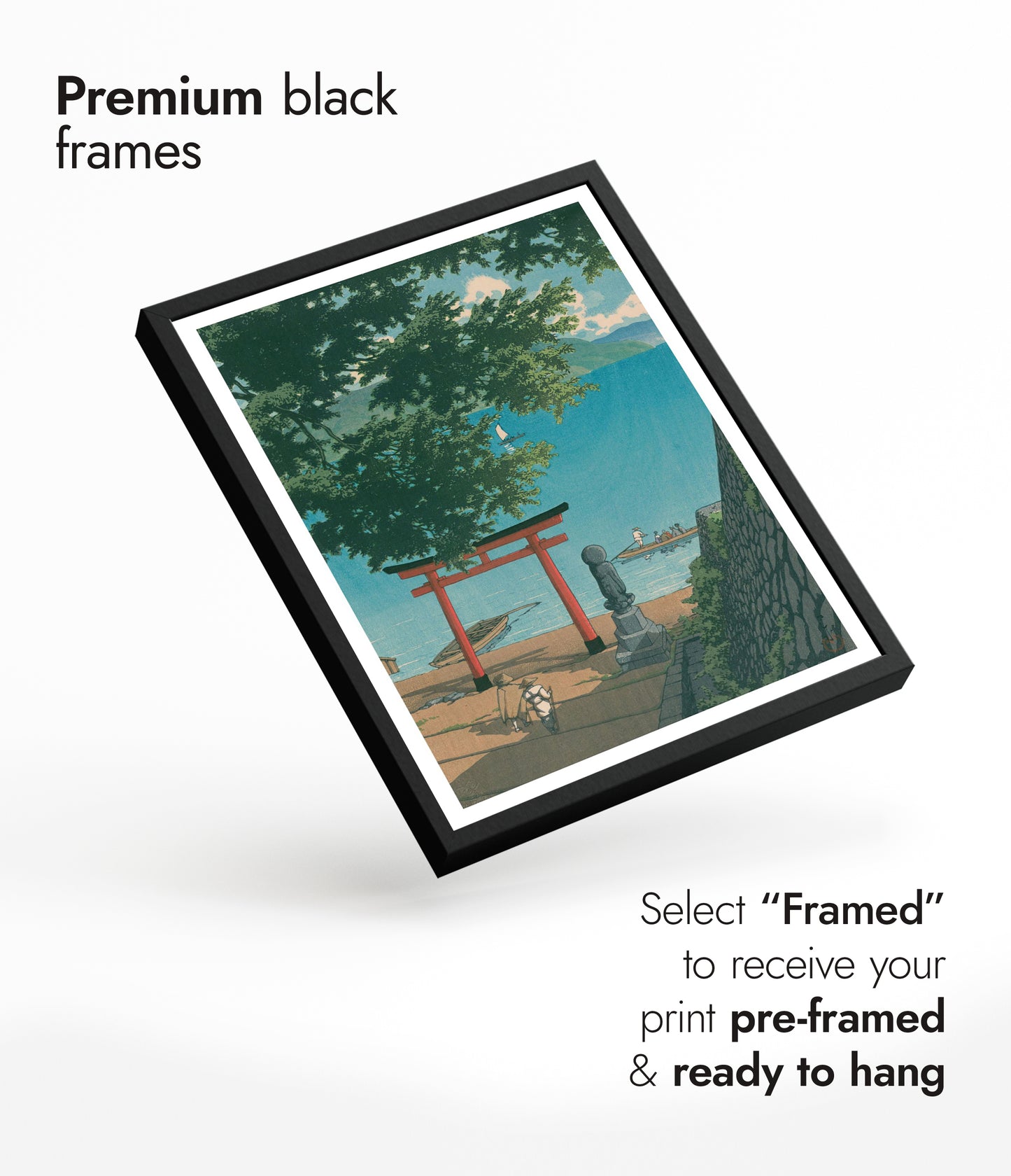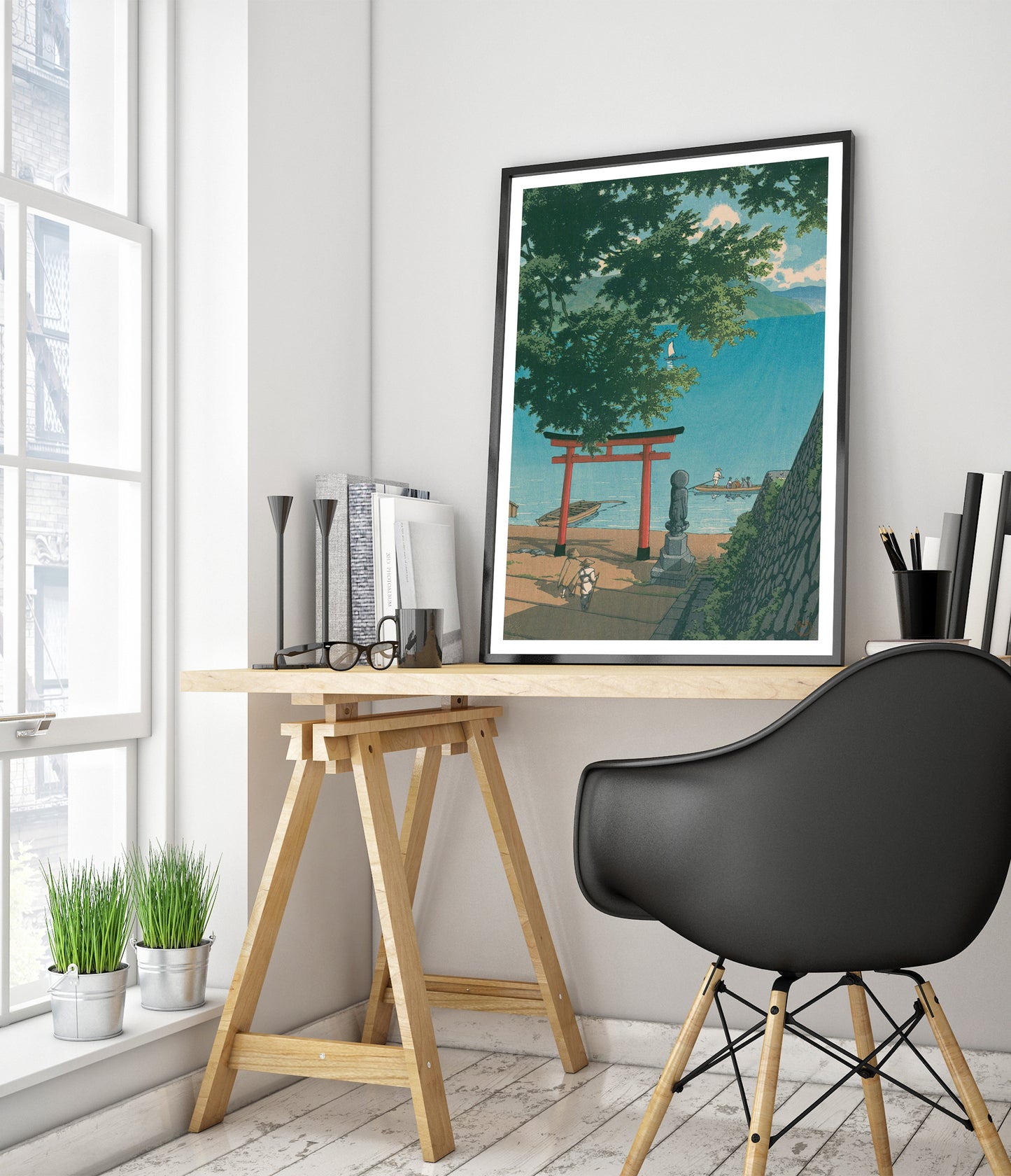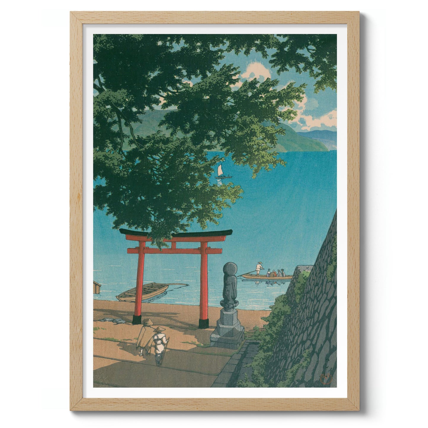This poster captures Kawase Hasui's "Nikko Chuzenji Lake Utagahama," featuring a serene lakeside scene. A vibrant red torii gate and lush greenery frame the tranquil blue waters. The descending path leads to a boat and figures by the lake, embodying traditional Japanese woodblock art. This depiction of nature and cultural symbols offers a calming visual experience.