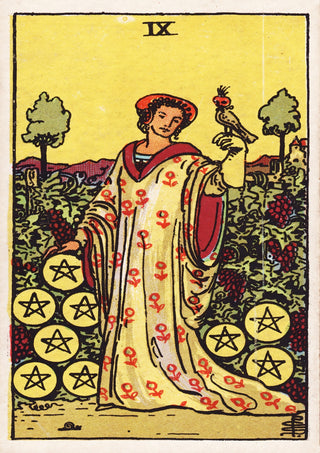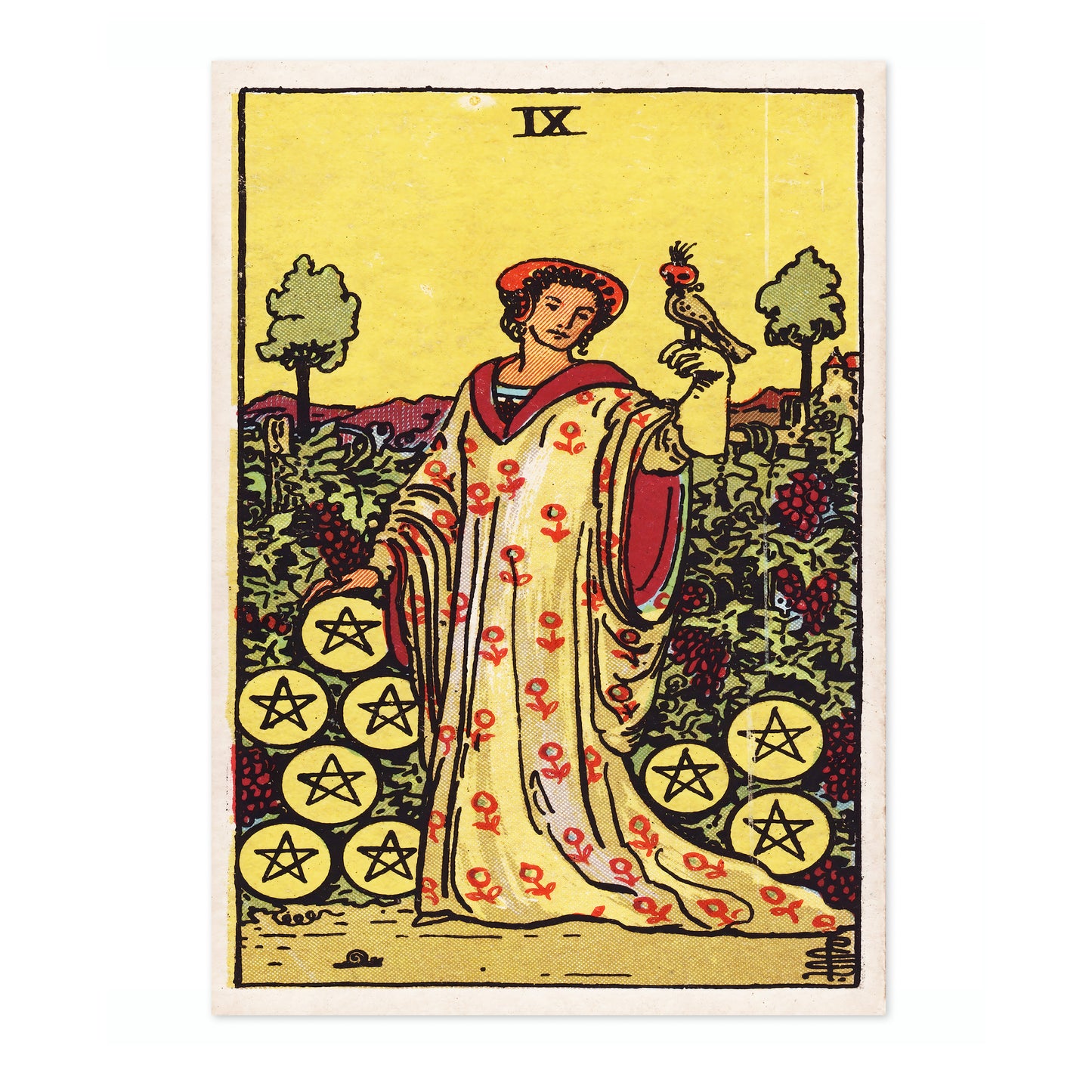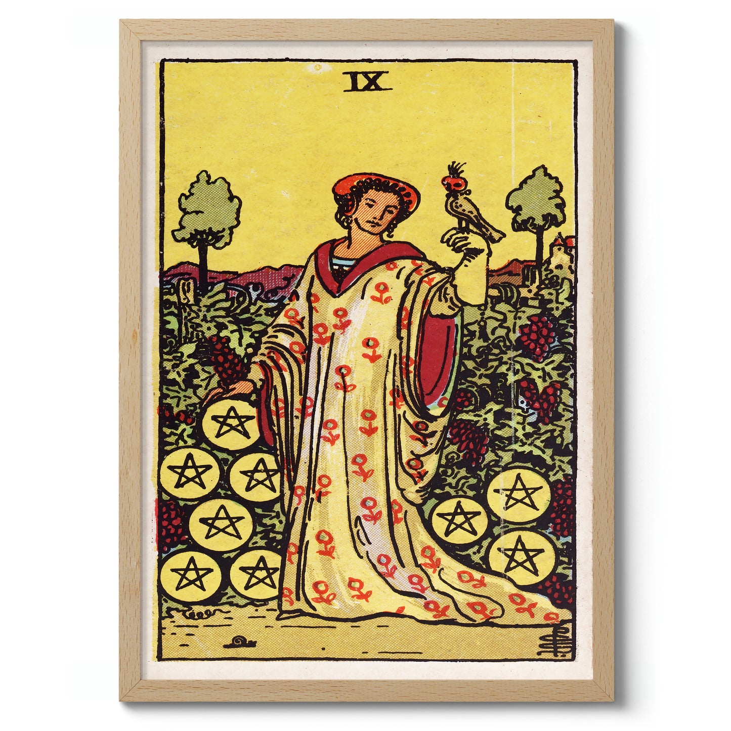 This vintage-inspired "Nine of Pentacles" tarot card poster features an intricate illustration of a poised woman amidst lush grapevines, holding a bird. Adorned with pentacle symbols, this artwork embodies themes of wealth and self-sufficiency. Its detailed, classic design and rich colours make it perfect for fans of tarot, fantasy, or mystical art.