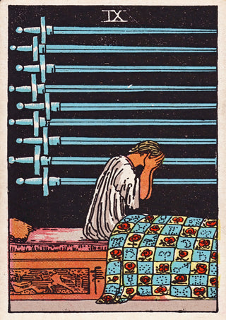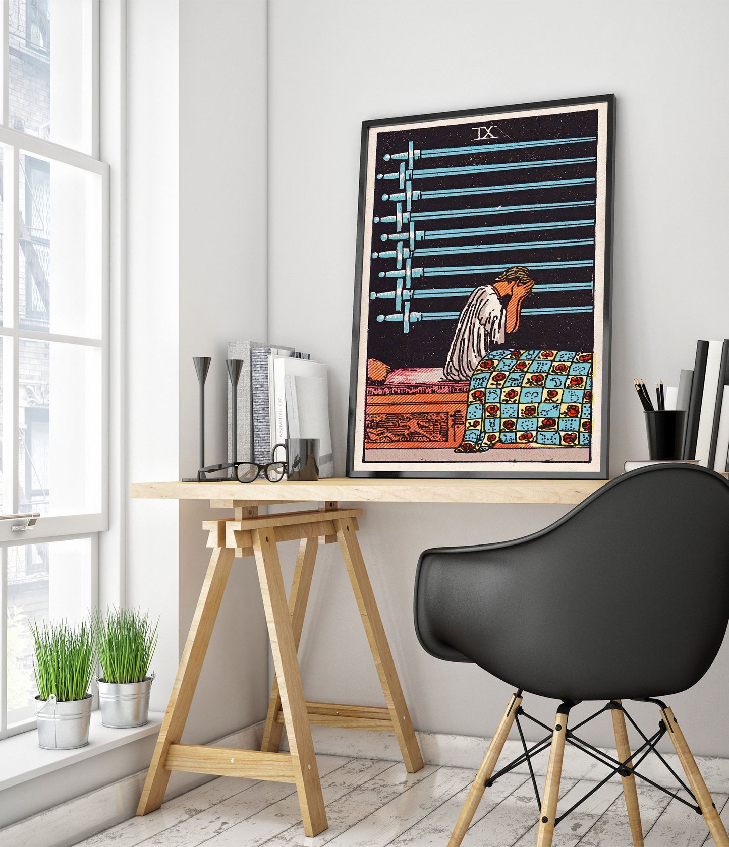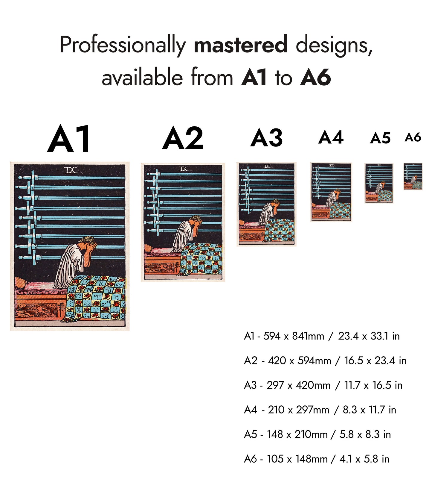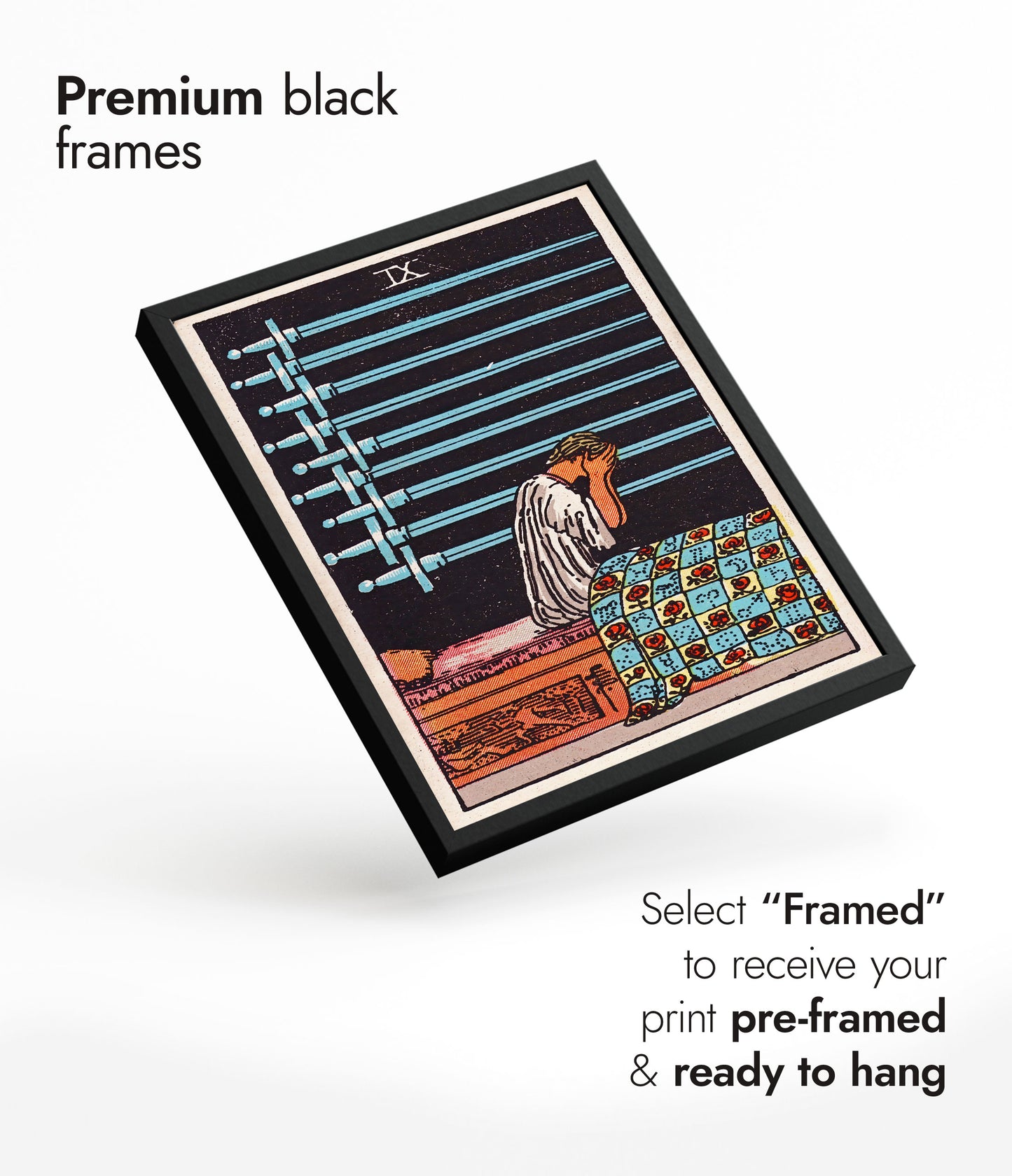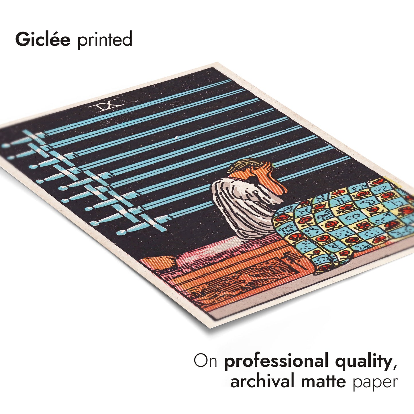 This Nine of Swords poster from the vintage tarot collection captures the poignant imagery of despair and introspection. Featuring a distressed figure seated in bed, surrounded by nine hovering swords, it evokes themes of anxiety and contemplation. The illustrative style adds a classic touch, making it a compelling piece for fans of spirituality and fantasy art.