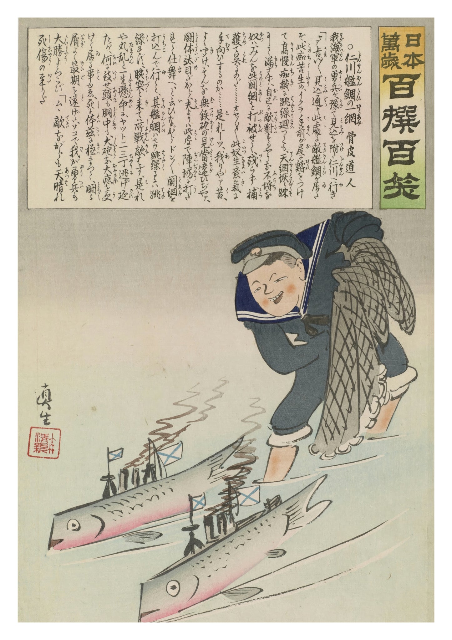 "Ninsenkan Koi no Hito-Ami" poster by Kobayashi Kiyochika features a playful scene of a boy dressed as a sailor engaged with carp-shaped toy boats at sea. This traditional woodblock Ukiyo-E illustration captures the charm of Japanese artistry with detailed linework and muted colours. Ideal for those who appreciate cultural heritage and classic woodblock techniques.