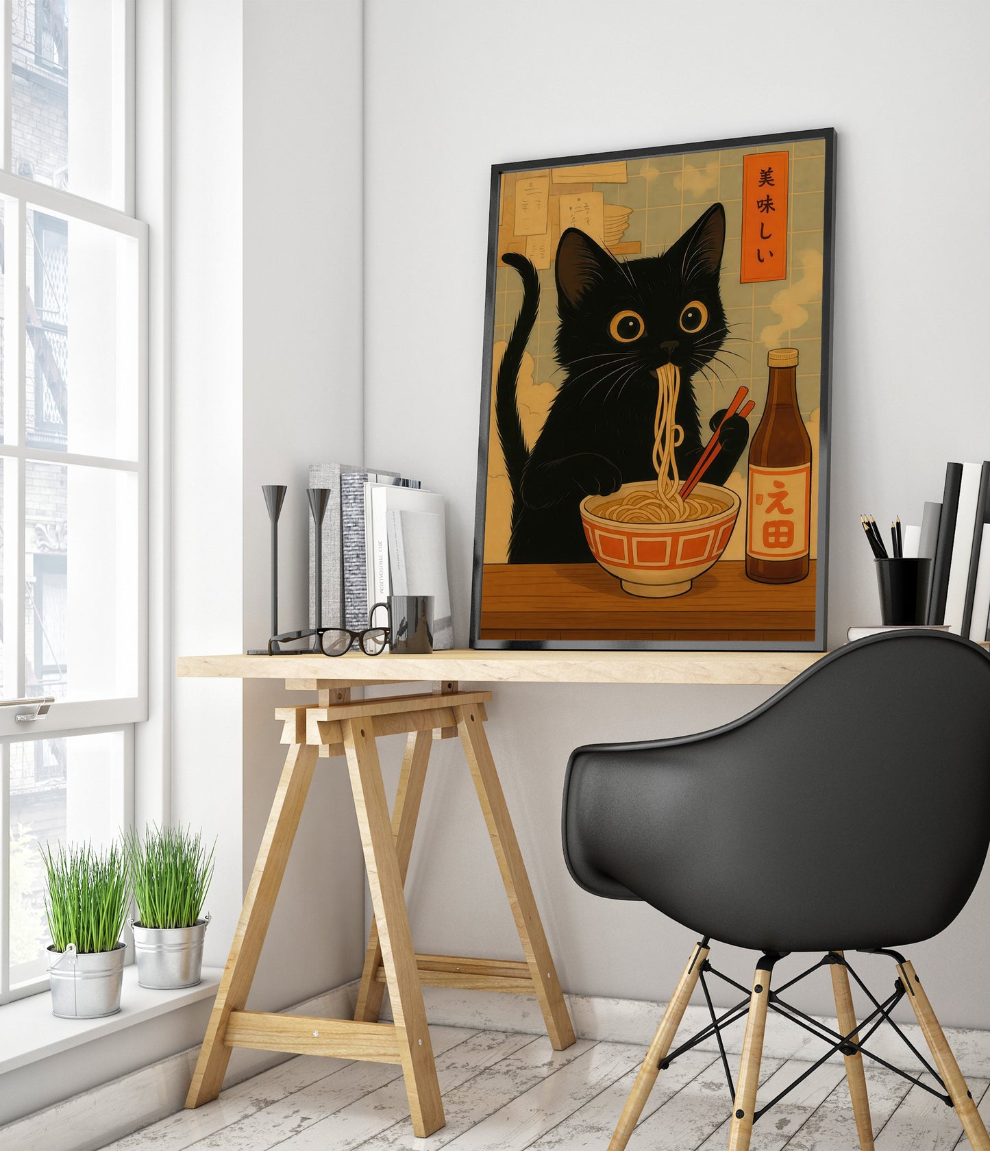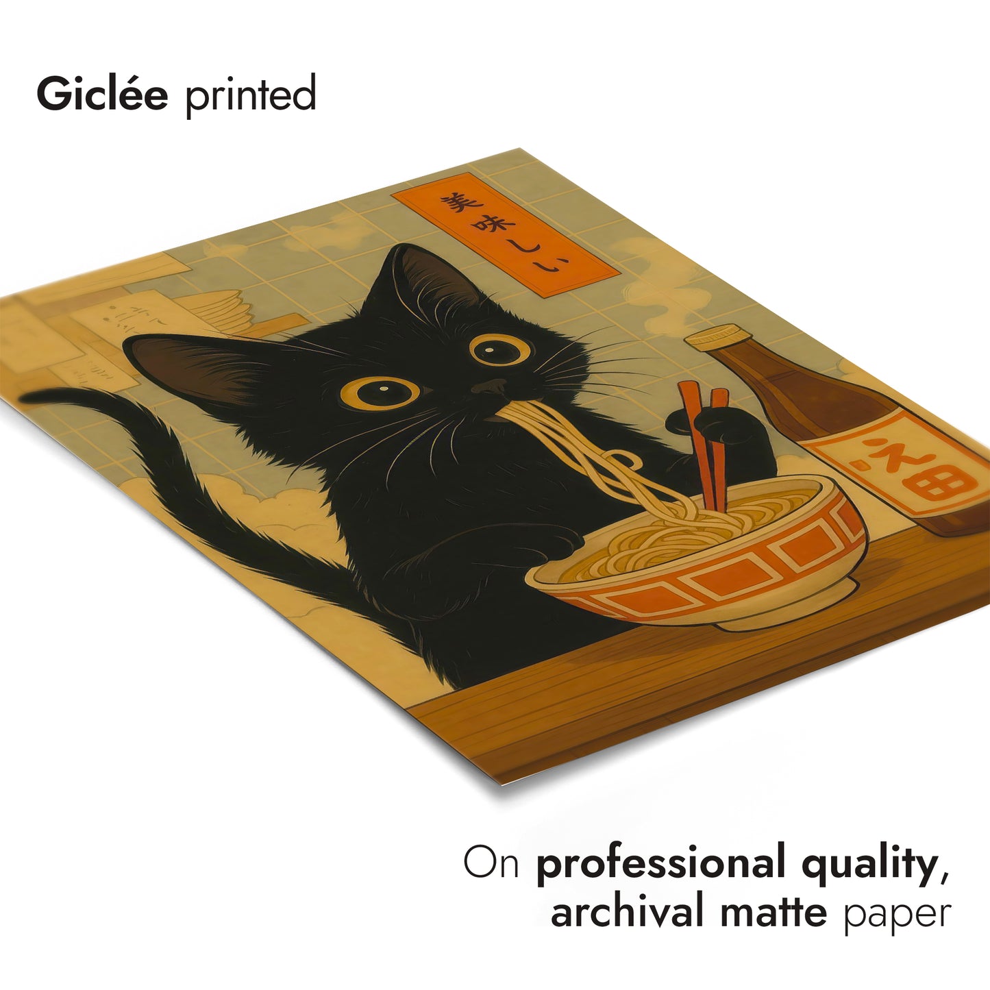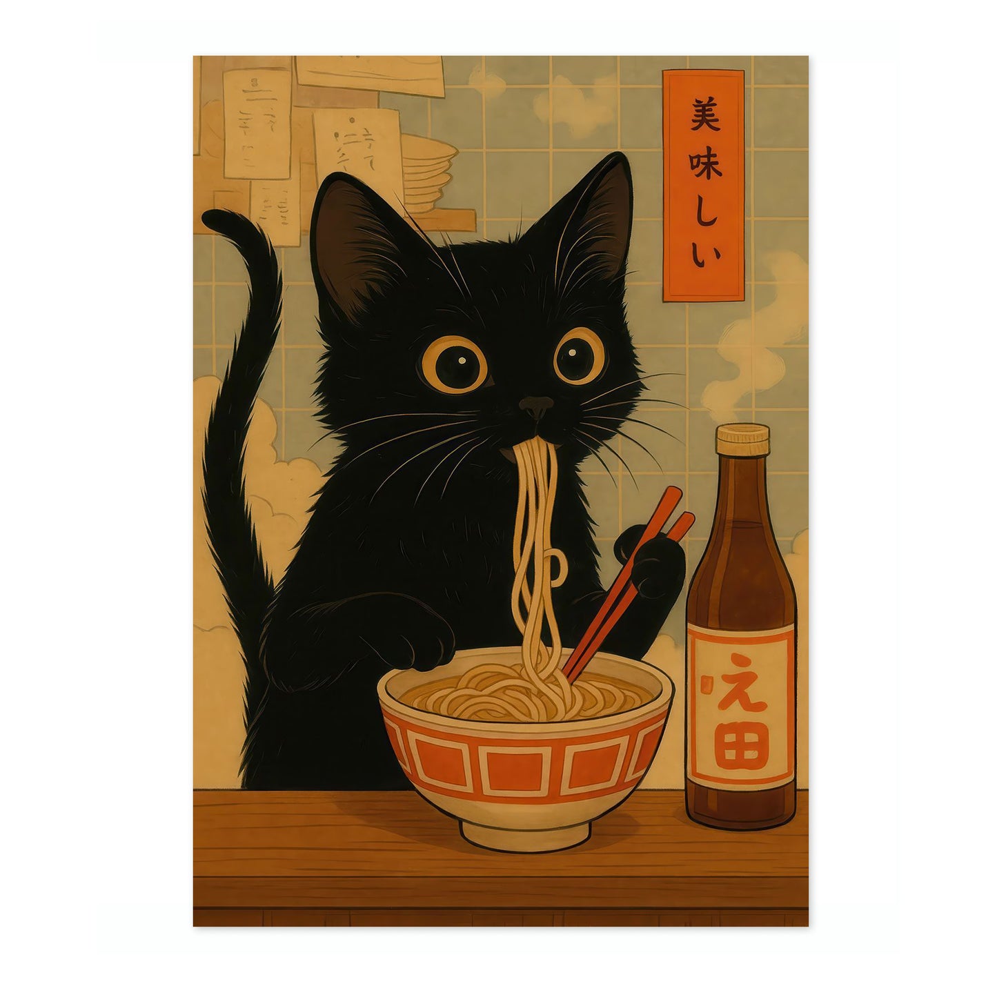 The "Noodle Cat Thief" poster captures an endearing black cat stealing a taste from a bowl of ramen noodles with chopsticks. Set against a Japanese kitchen backdrop, the scene includes a soy sauce bottle and charming Japanese script, conveying whimsical anime charm. Perfect for cat lovers and ramen enthusiasts, this piece brings a touch of humor and Japanese culture to any space.