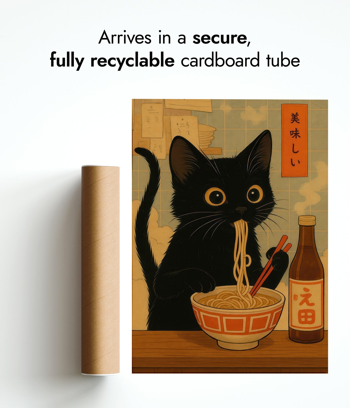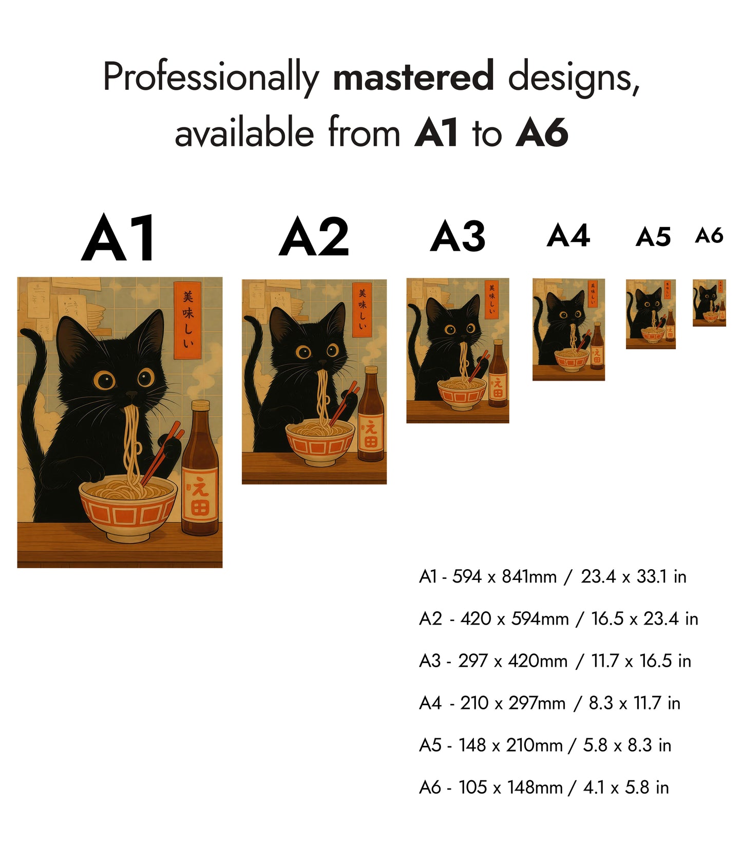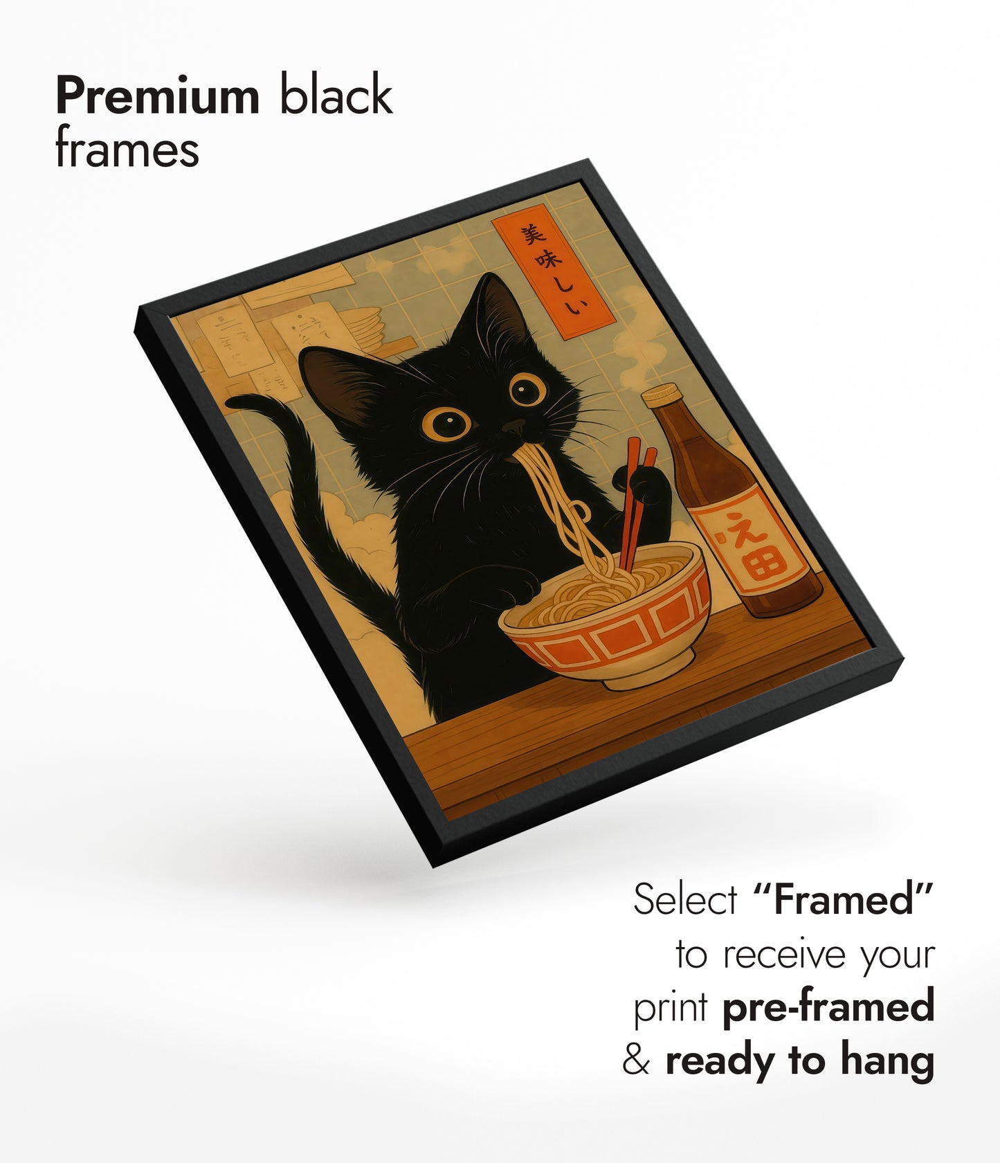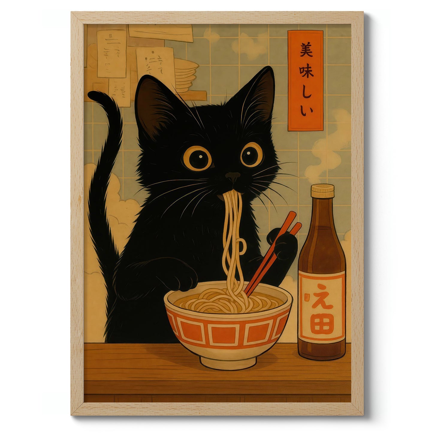 The "Noodle Cat Thief" poster captures an endearing black cat stealing a taste from a bowl of ramen noodles with chopsticks. Set against a Japanese kitchen backdrop, the scene includes a soy sauce bottle and charming Japanese script, conveying whimsical anime charm. Perfect for cat lovers and ramen enthusiasts, this piece brings a touch of humor and Japanese culture to any space.