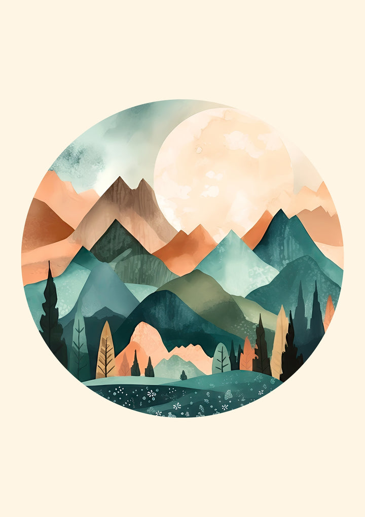 Explore the tranquility of nature with the "Noon" poster from the Boho collection. This minimalist watercolour landscape features a serene mountain range and dense forest, bathed in soft, warm hues. The sun overhead illuminates the scene, creating a balanced and calming composition. Perfect for adding a touch of nature-inspired elegance to any space.