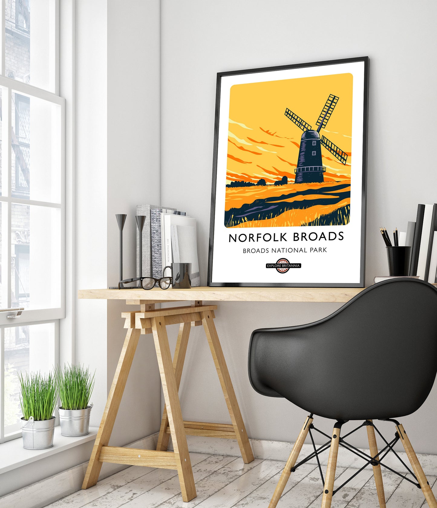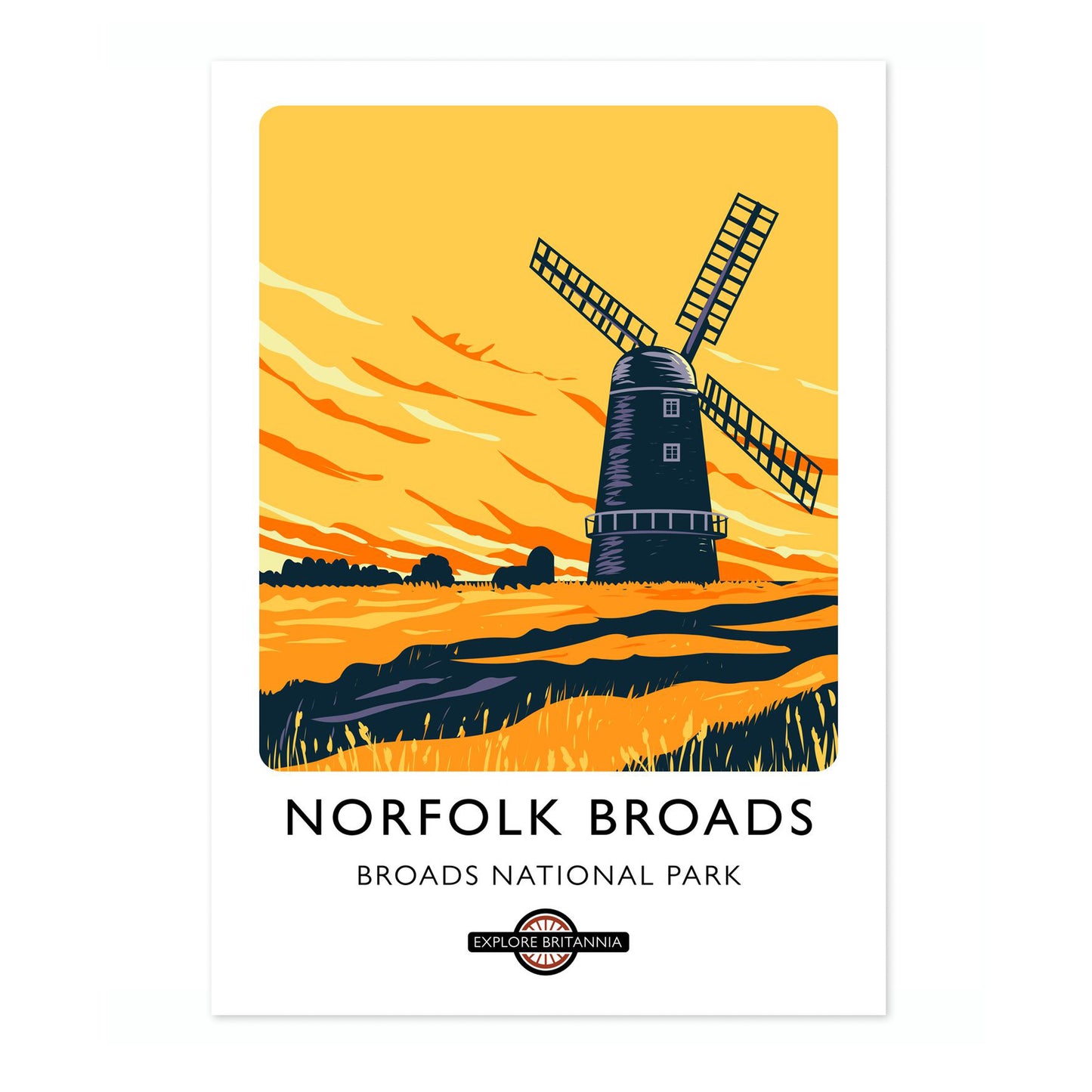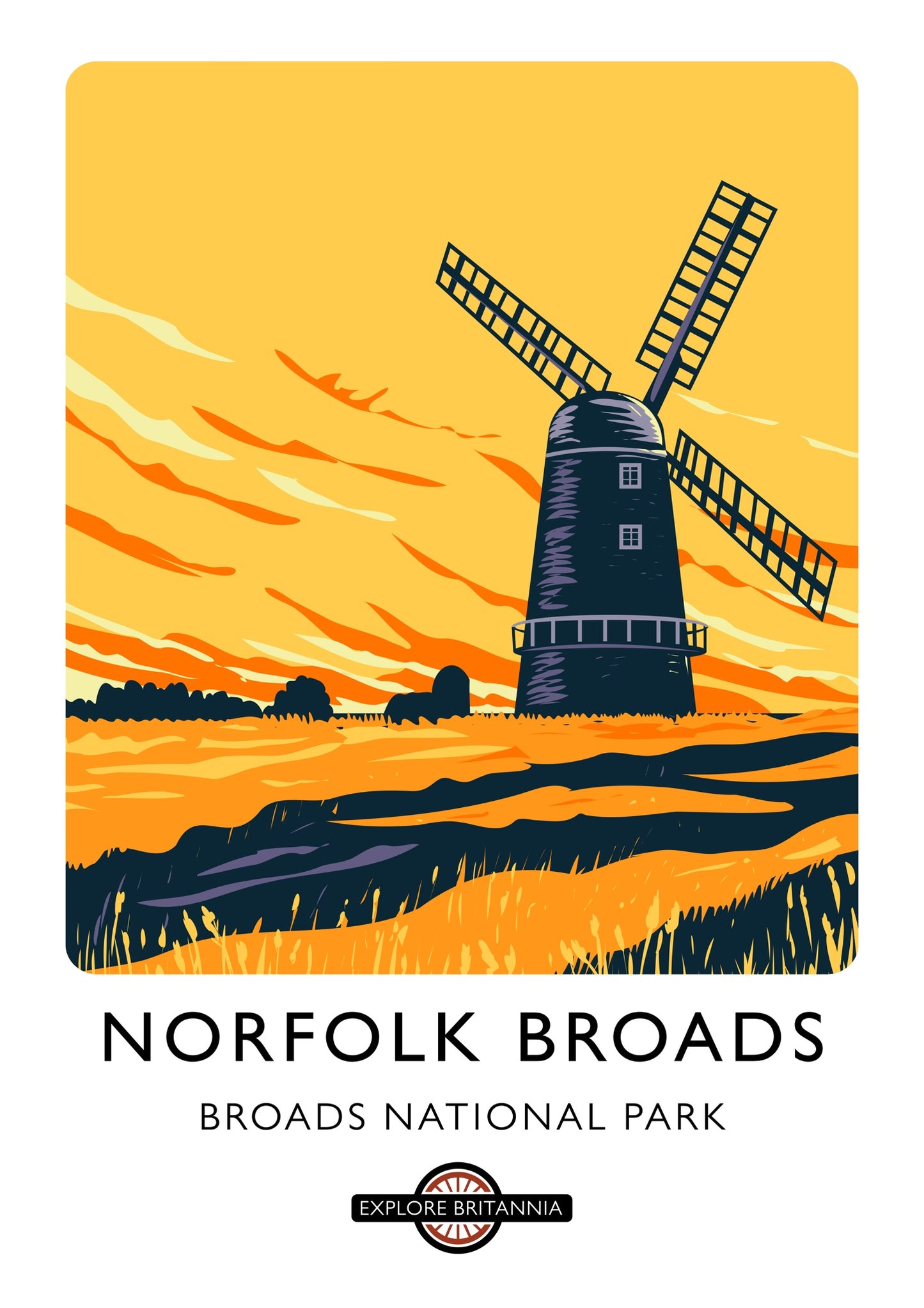 Capture the vibrant essence of the Norfolk Broads with this striking poster. Featuring a bold illustration of a windmill against an orange sunset sky, the graphic design highlights the serene fields of Broads National Park. This artwork beautifully embodies travel and exploration themes, making it an ideal piece for celebrating the natural beauty of Britain.