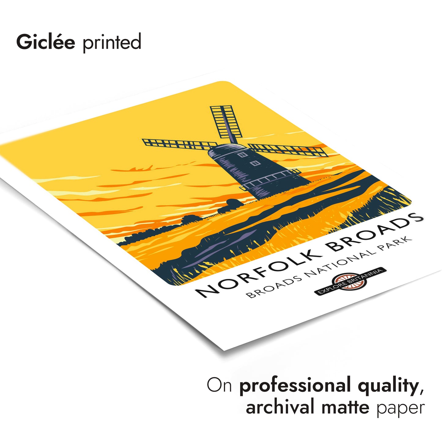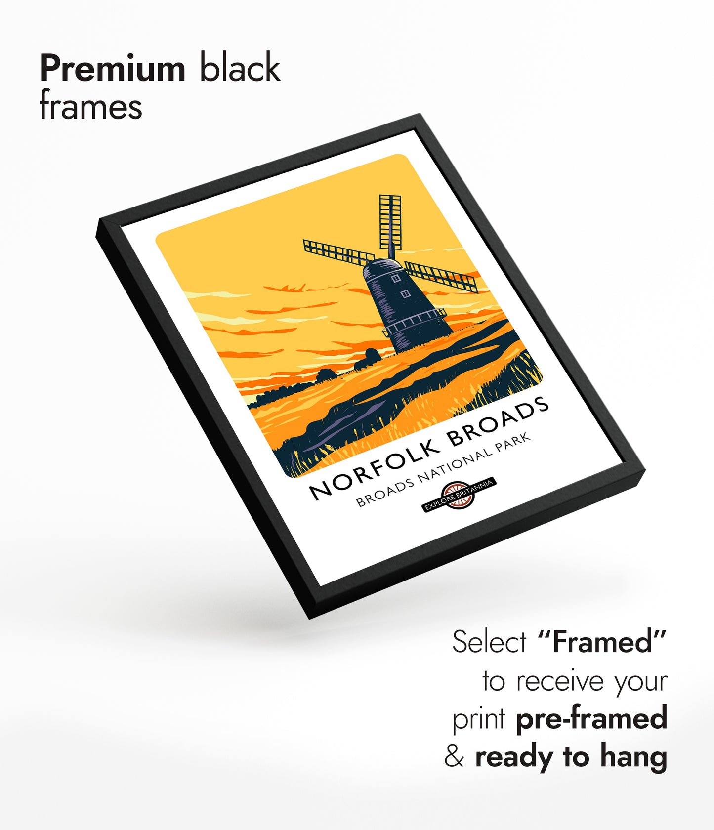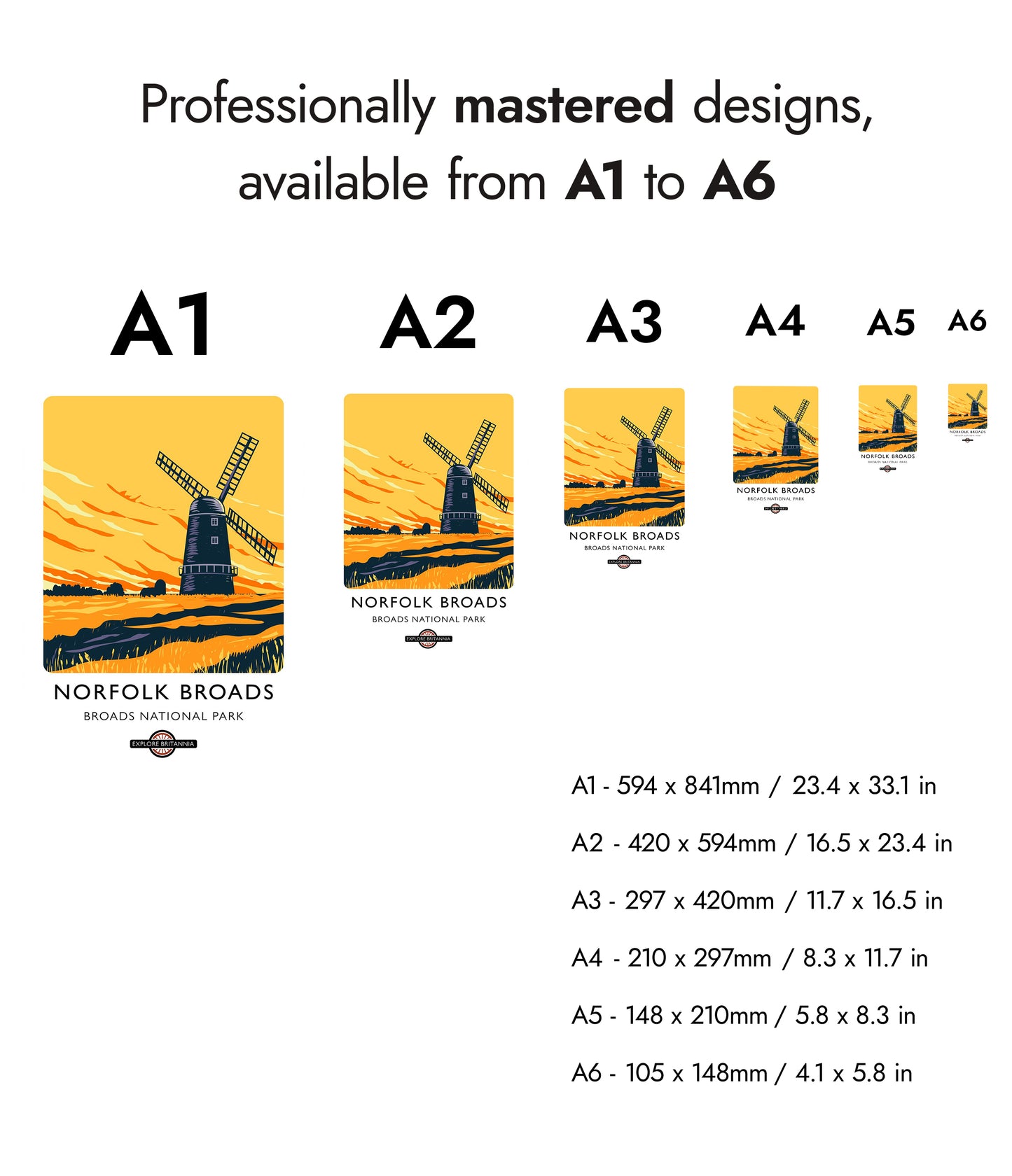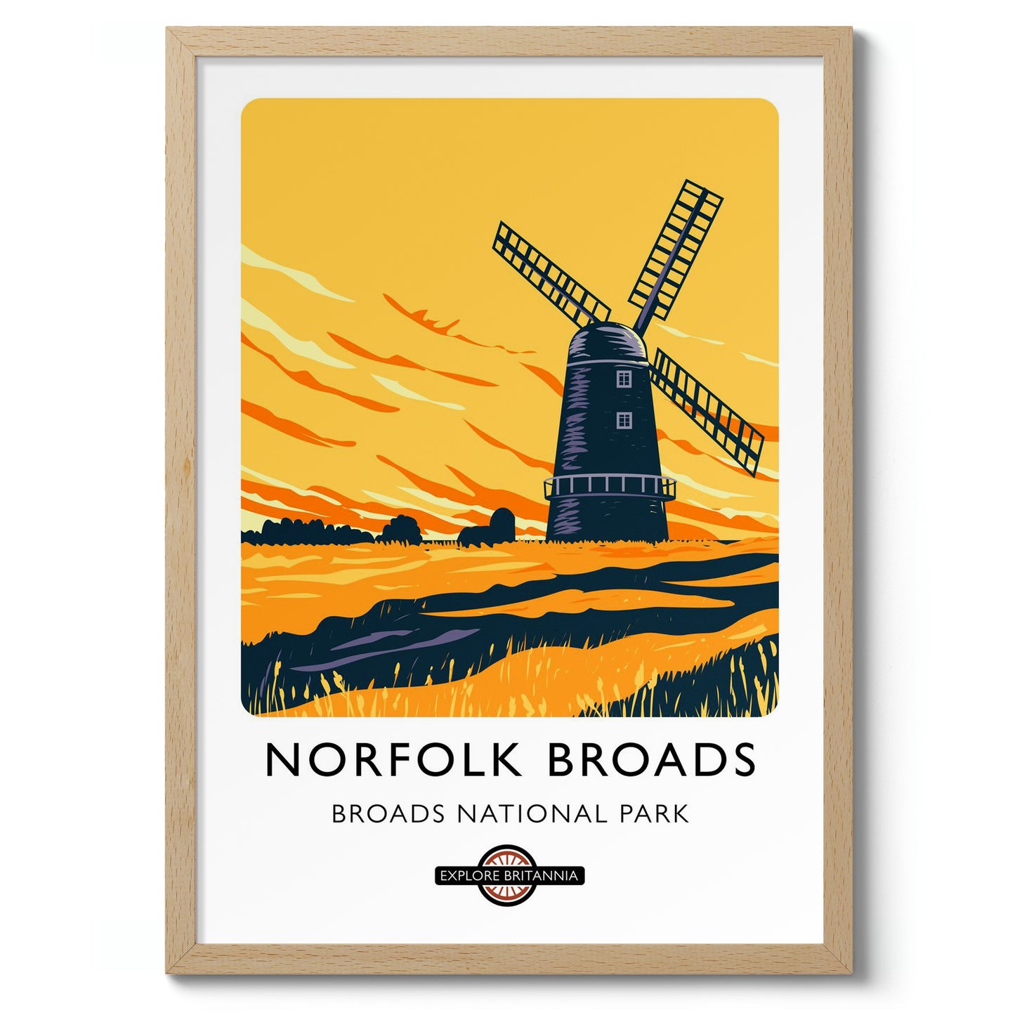 Capture the vibrant essence of the Norfolk Broads with this striking poster. Featuring a bold illustration of a windmill against an orange sunset sky, the graphic design highlights the serene fields of Broads National Park. This artwork beautifully embodies travel and exploration themes, making it an ideal piece for celebrating the natural beauty of Britain.