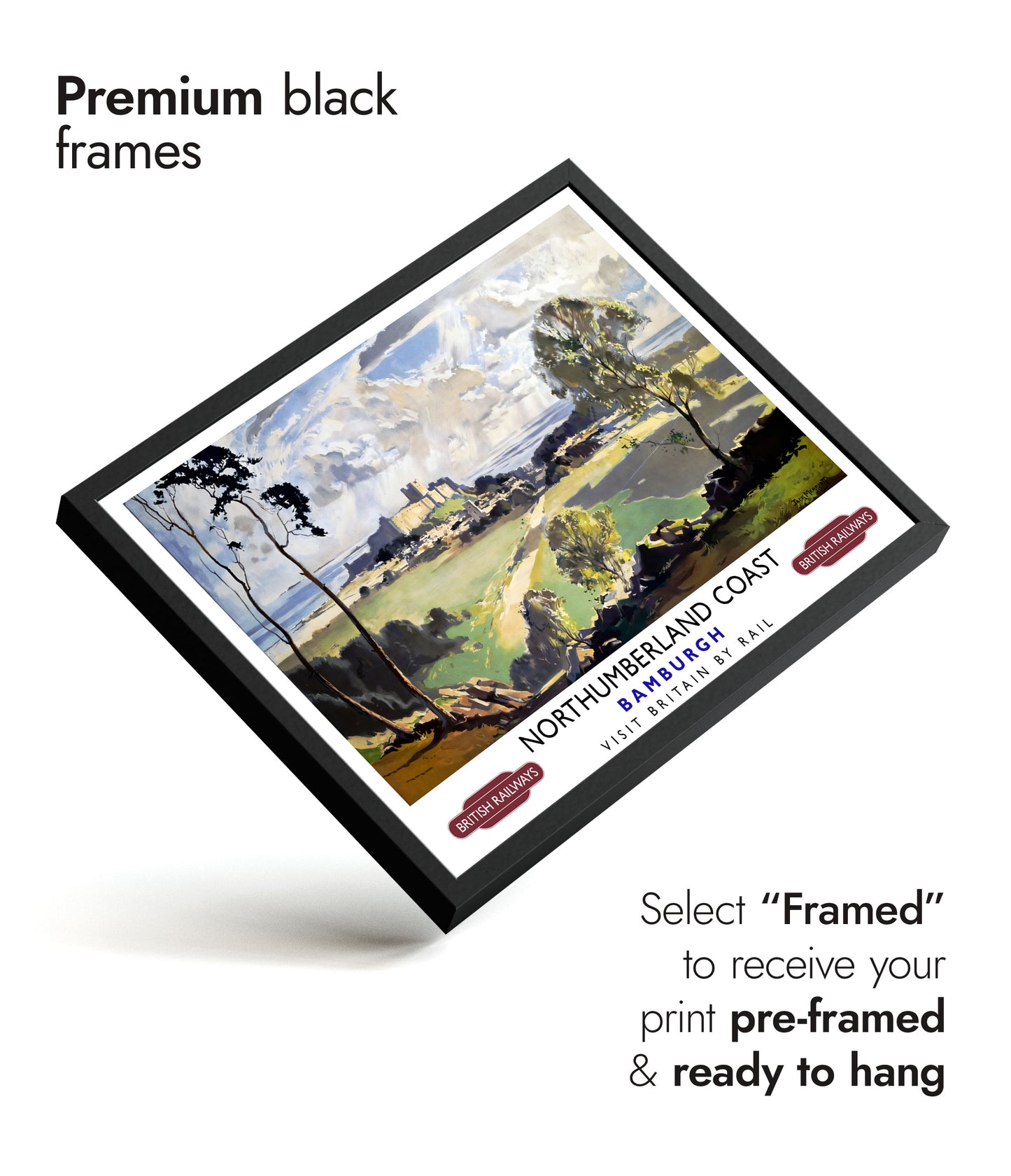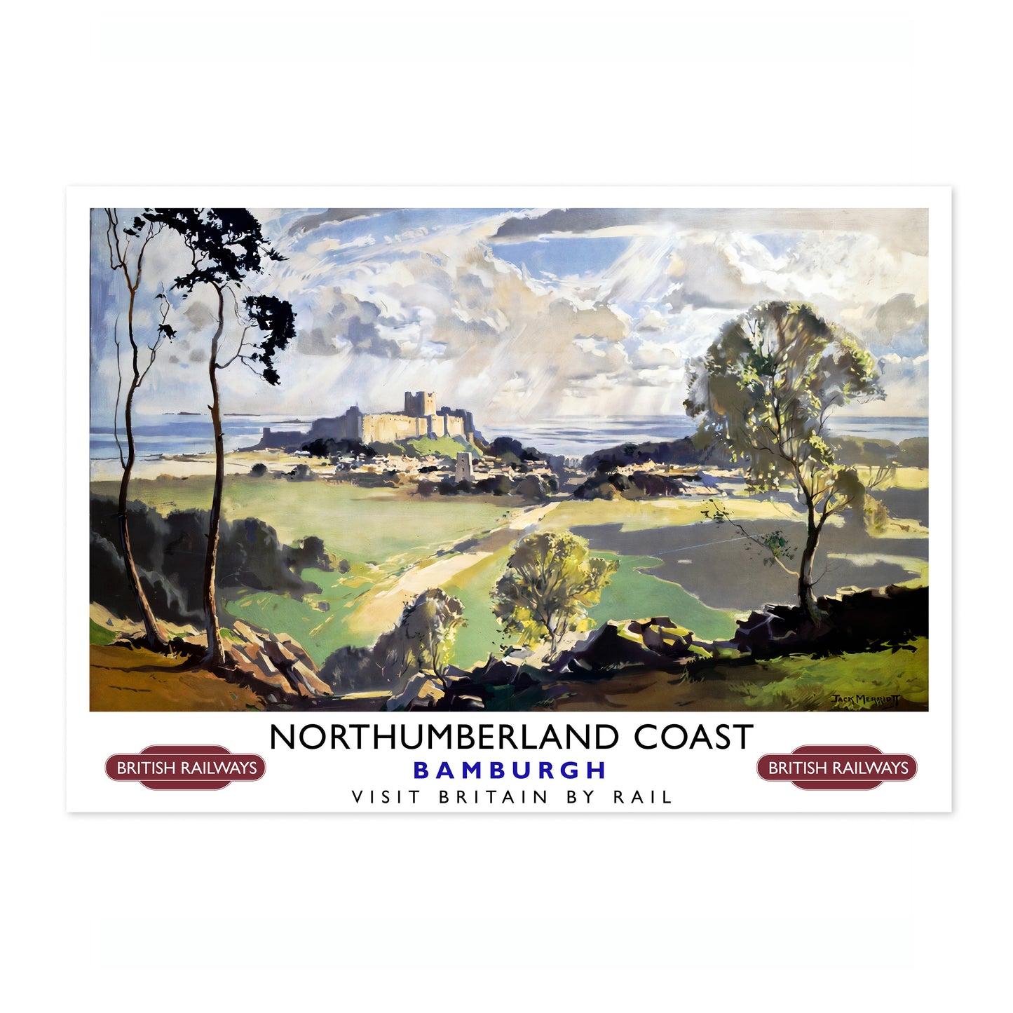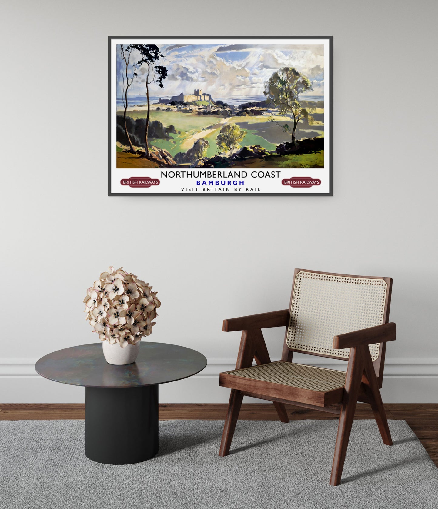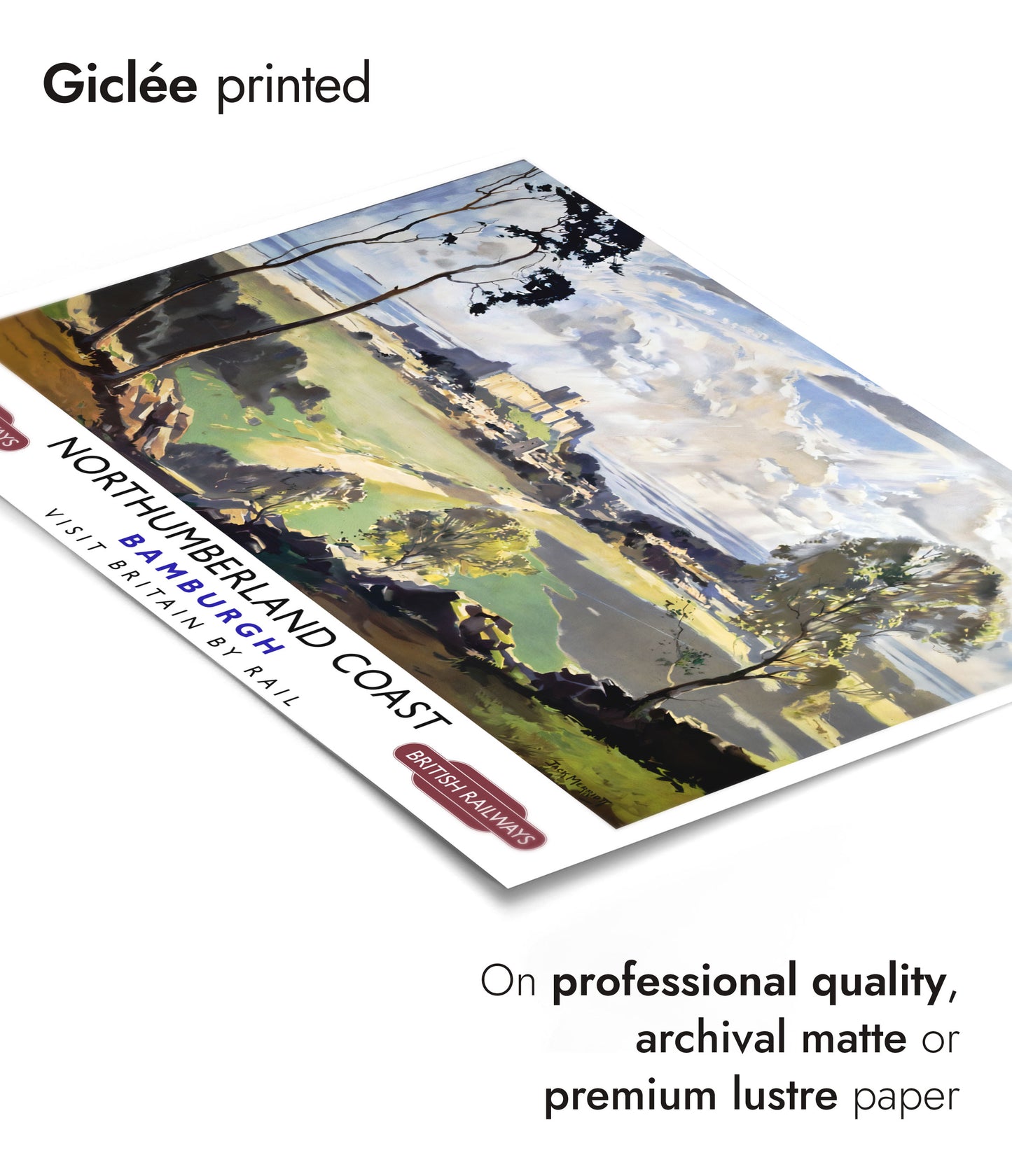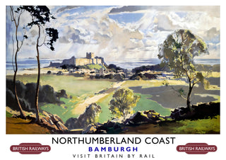 “Northumberland Coast” poster captures the serene beauty of Bamburgh, England. This vintage illustration features a majestic castle overlooking the rugged coastline, set against a dramatic sky with scattered clouds. The lush greenery and towering trees enhance the tranquil seaside atmosphere, making it perfect for those who appreciate classic travel art and picturesque British landscapes.