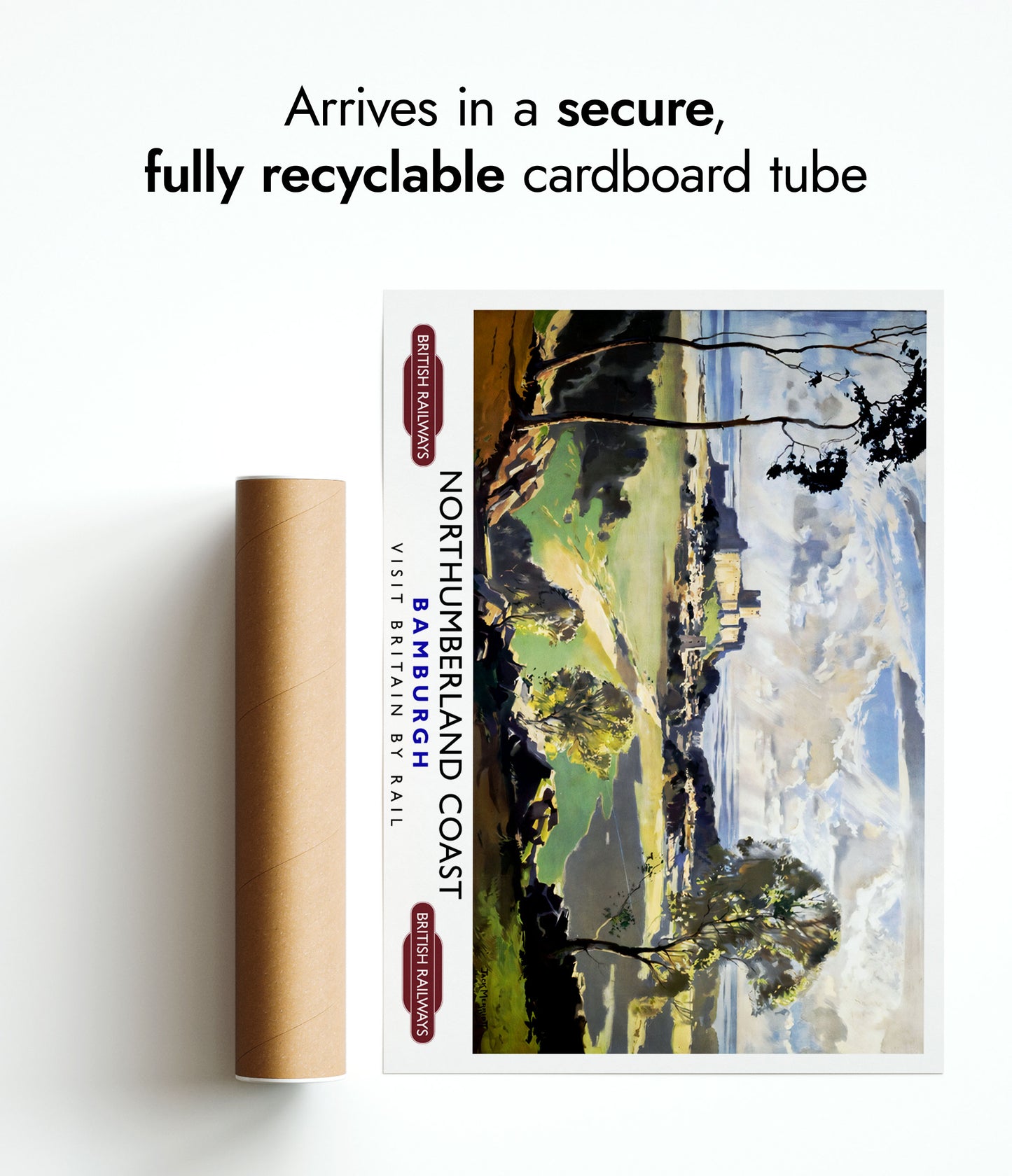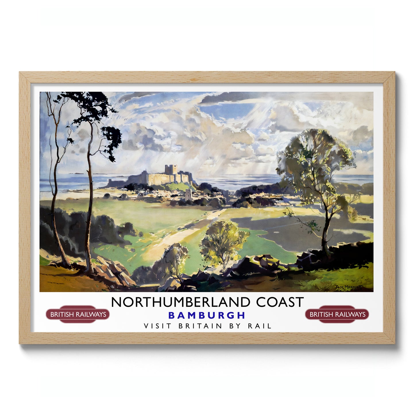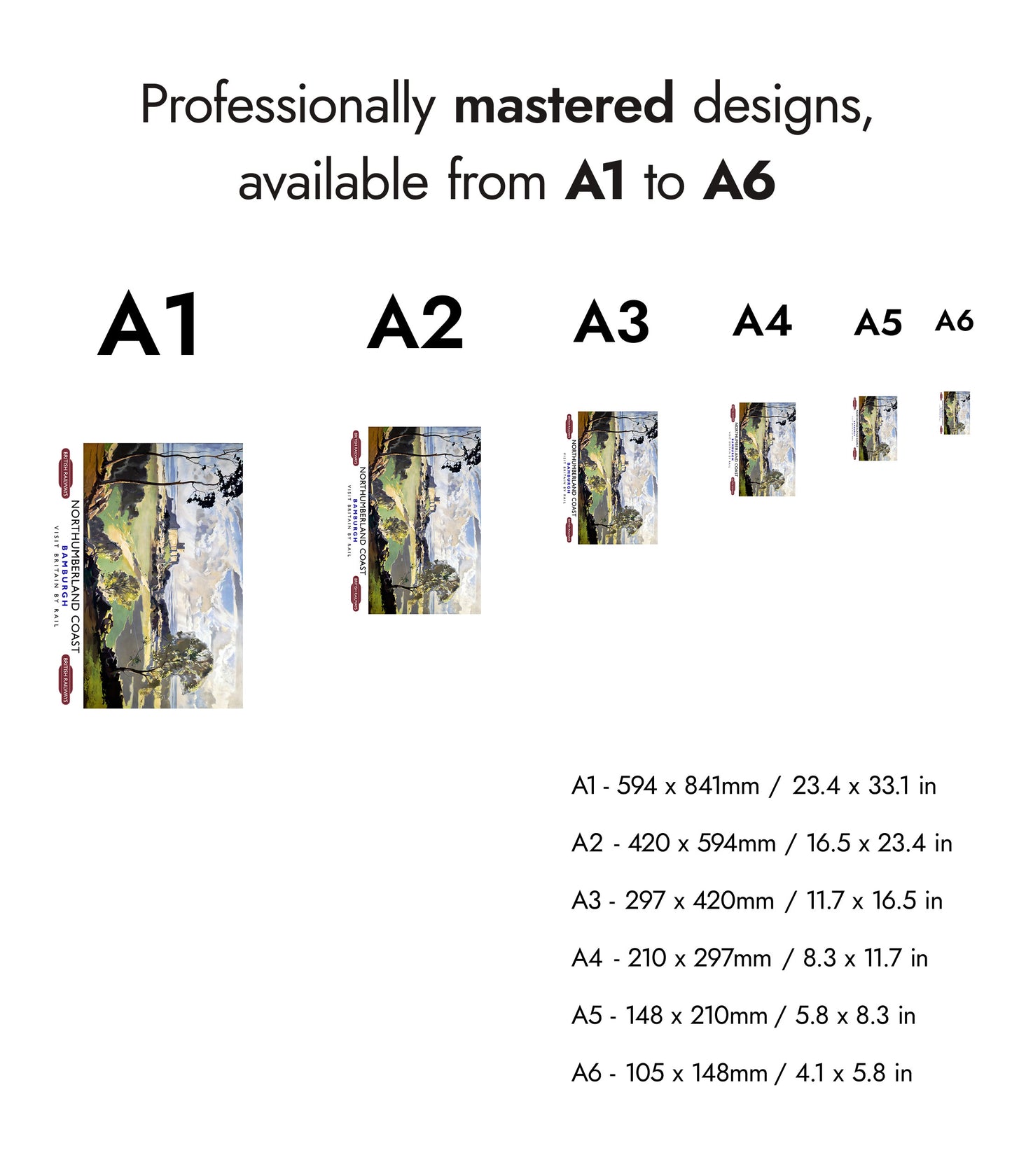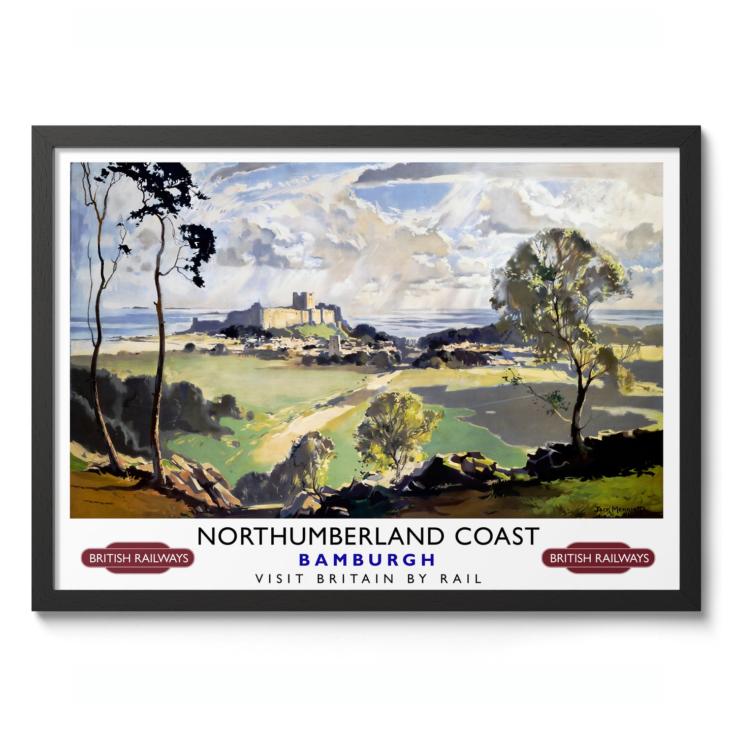 “Northumberland Coast” poster captures the serene beauty of Bamburgh, England. This vintage illustration features a majestic castle overlooking the rugged coastline, set against a dramatic sky with scattered clouds. The lush greenery and towering trees enhance the tranquil seaside atmosphere, making it perfect for those who appreciate classic travel art and picturesque British landscapes.