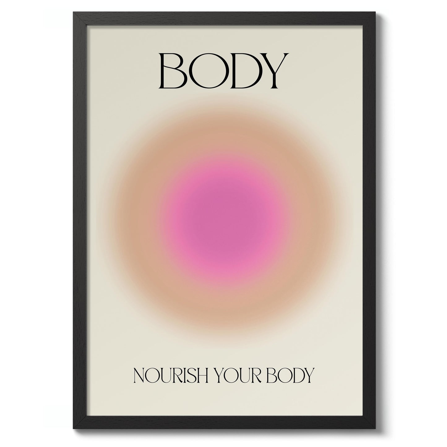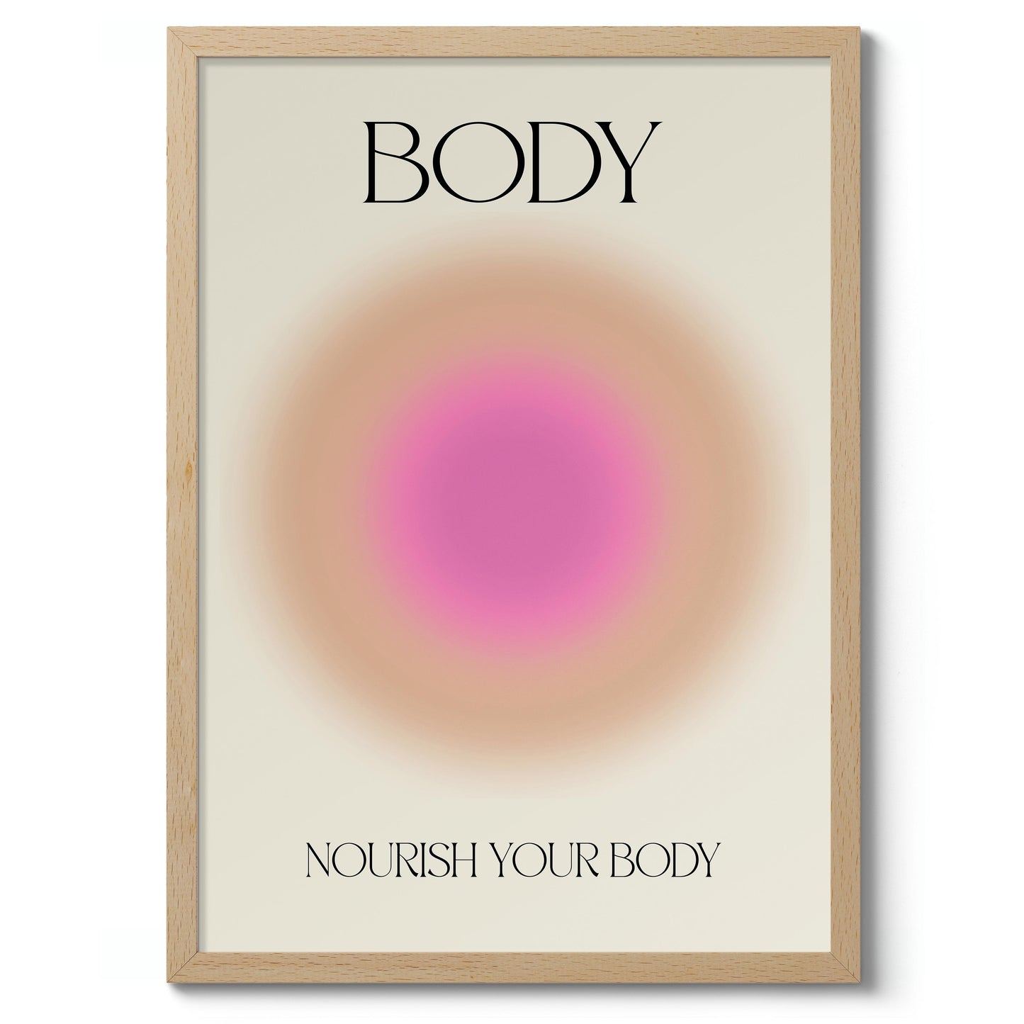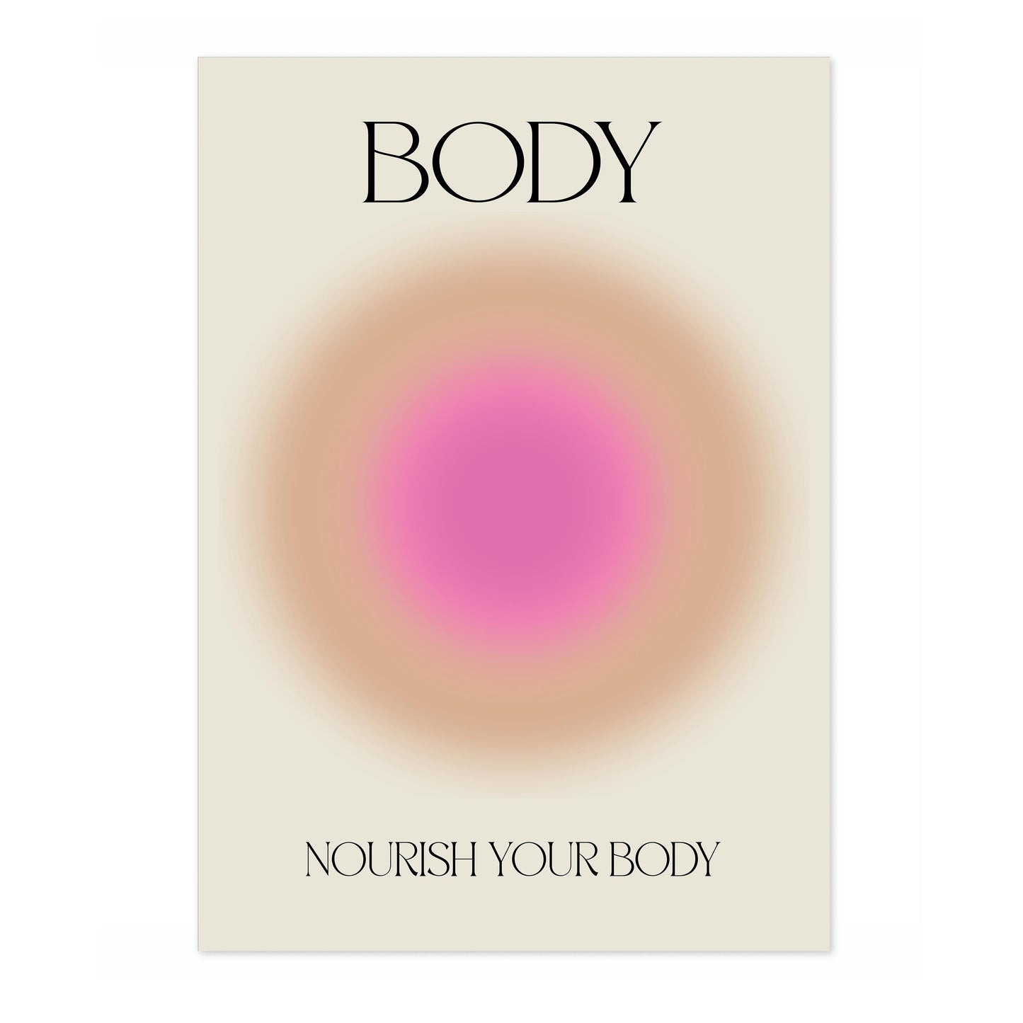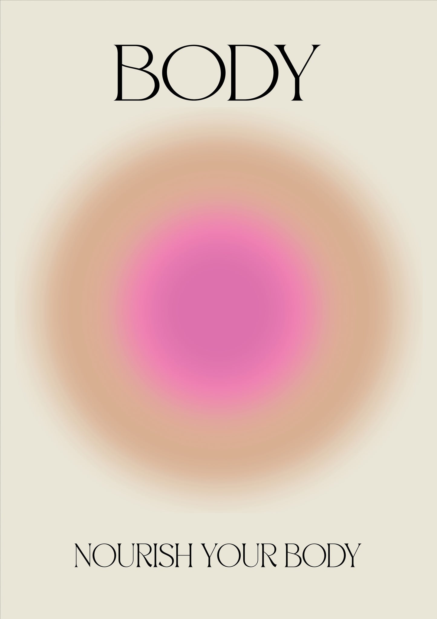 This poster titled "Nourish Your Body" features an abstract, minimalist design focusing on a soft gradient aura. At its center, a warm pink hue transitions to subtle beige and tan tones, encapsulating themes of mindfulness and well-being. Ideal for promoting a calming and introspective atmosphere, this portrait seamlessly blends modern art with wellness themes.