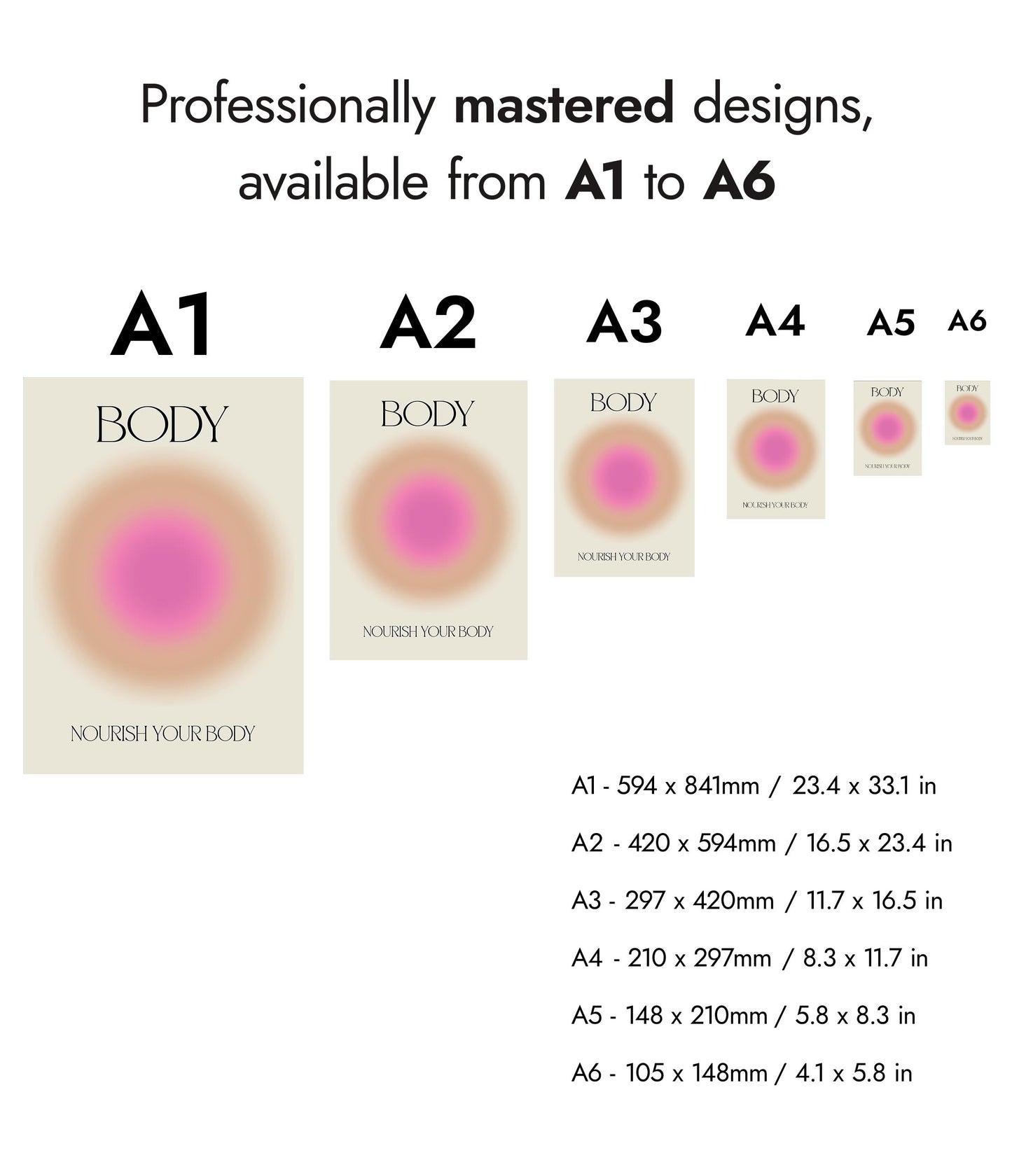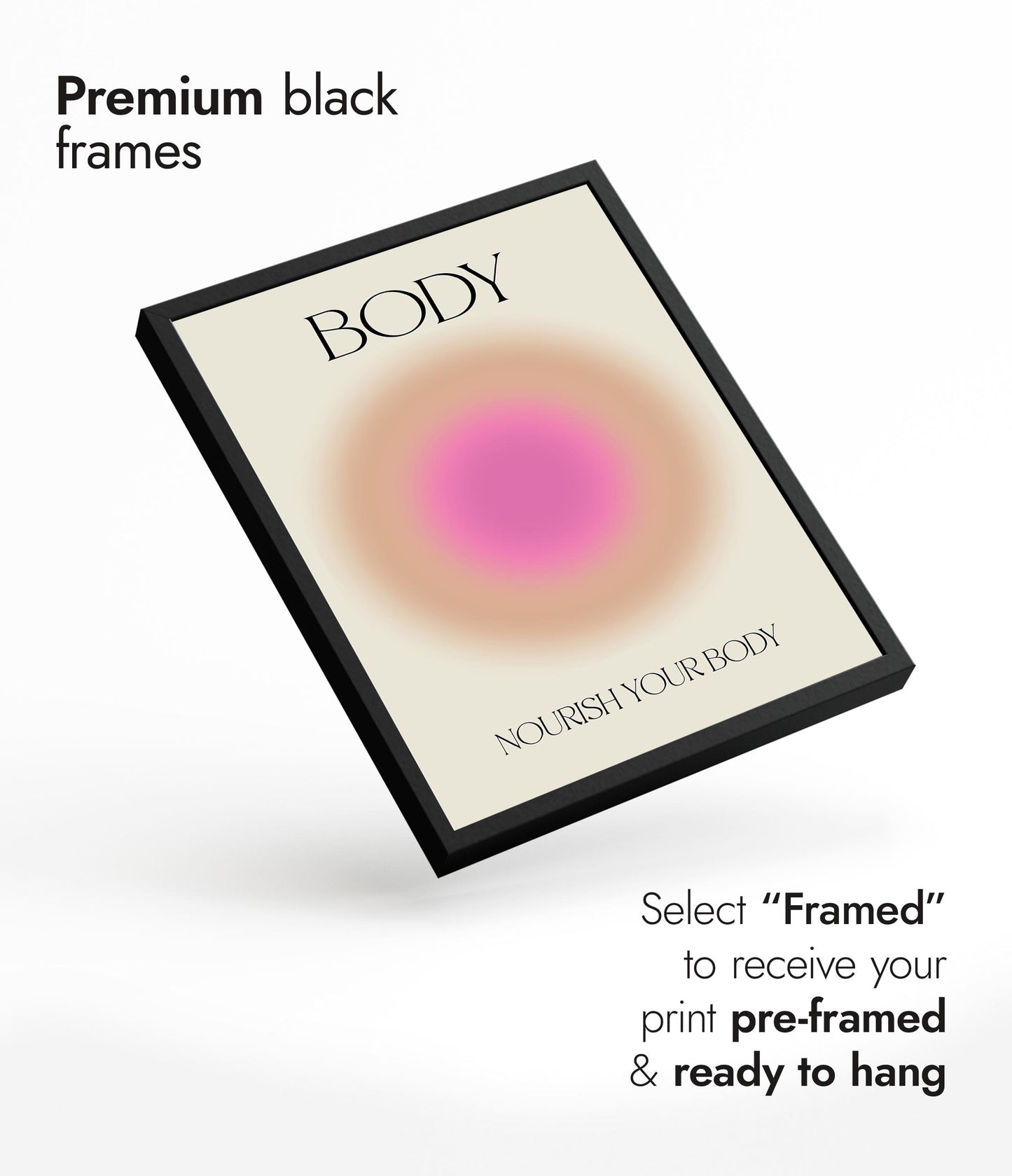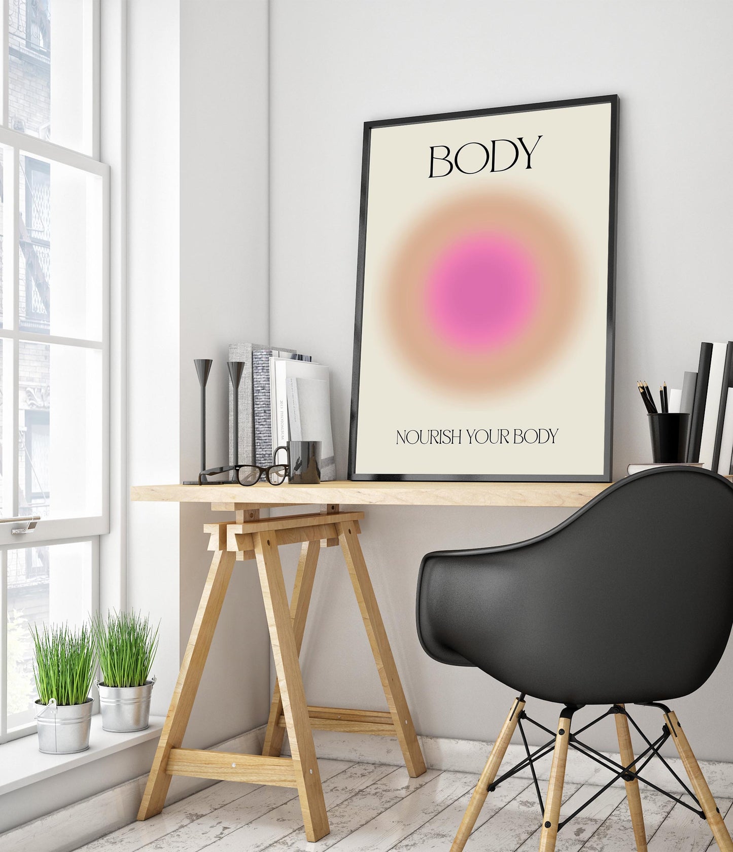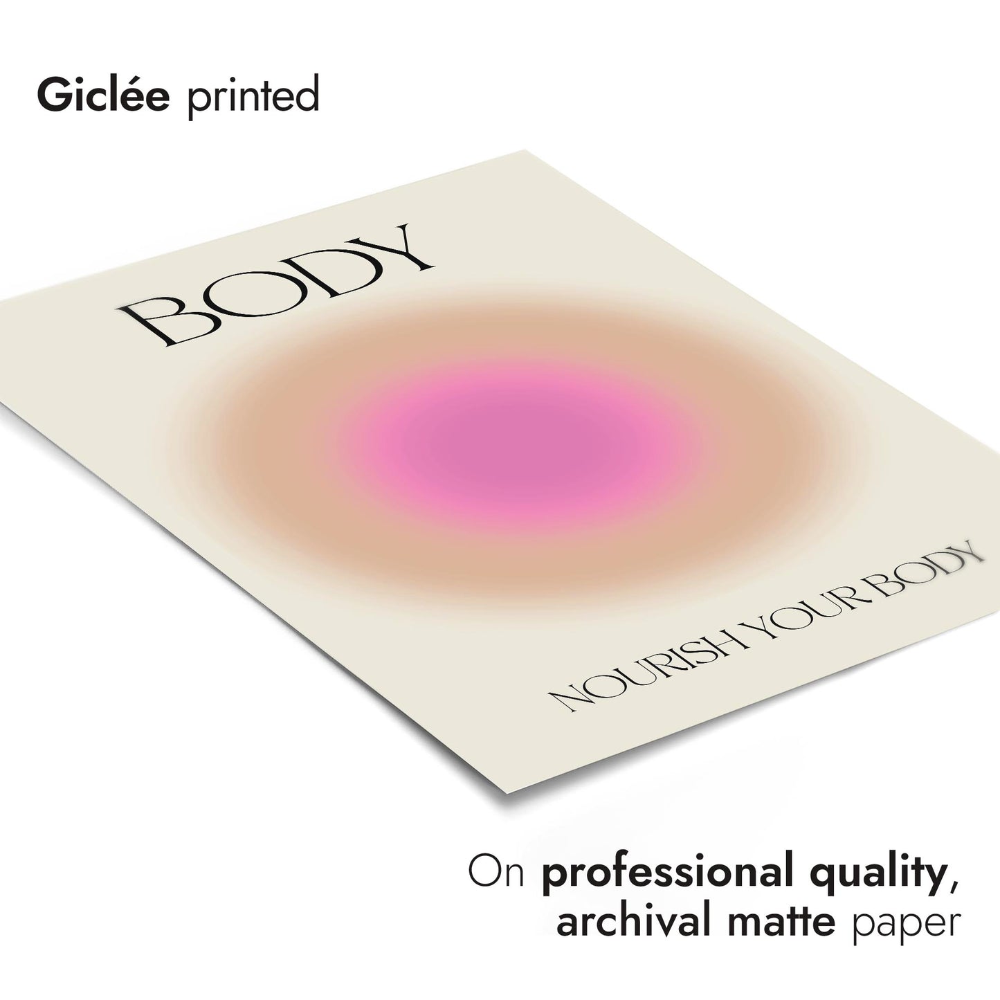 This poster titled "Nourish Your Body" features an abstract, minimalist design focusing on a soft gradient aura. At its center, a warm pink hue transitions to subtle beige and tan tones, encapsulating themes of mindfulness and well-being. Ideal for promoting a calming and introspective atmosphere, this portrait seamlessly blends modern art with wellness themes.