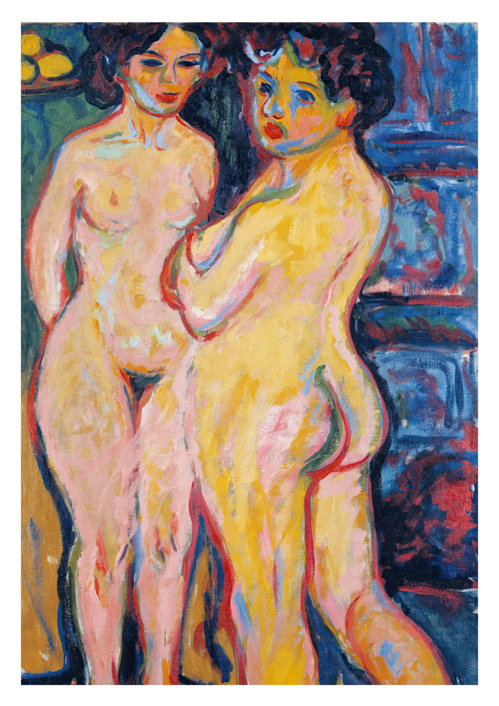 The "Nudes Standing by Stove" poster features an expressive painting by Ernst Ludwig Kirchner. It portrays two nude women standing beside a stove, rendered in bold, dynamic brushstrokes typical of Expressionism. The vibrant colours and raw, emotive style capture the intimate, candid nature of the scene. This art print is ideal for those who appreciate modernist approaches in portraiture and thematic explorations of human form.