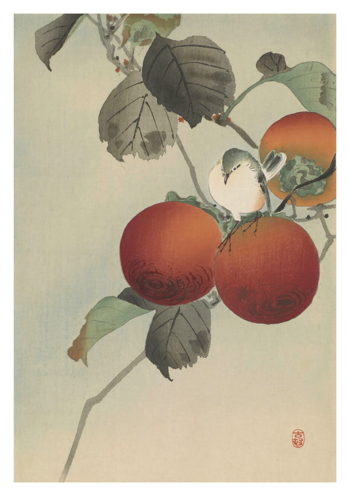 Ohara Koson's "Nuthatcher atop Persimmons" woodblock poster beautifully captures a serene moment of a nuthatch perched on ripe persimmons. The traditional Japanese Ukiyo-e style enhances the delicate illustration, featuring natural colours and intricate details. This portrait-style poster is perfect for adding a touch of nature and elegance to your space.