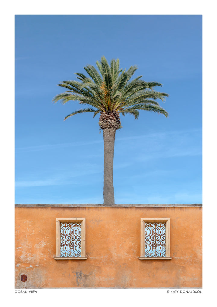 Capture serenity with the "Ocean View" poster by Katy Donaldson. A solitary palm tree stands tall against a vivid blue sky, juxtaposed with an orange-hued building featuring two ornate windows. This photographic portrait perfectly blends architectural and natural elements, creating a tranquil, sun-kissed scene ideal for brightening any space.