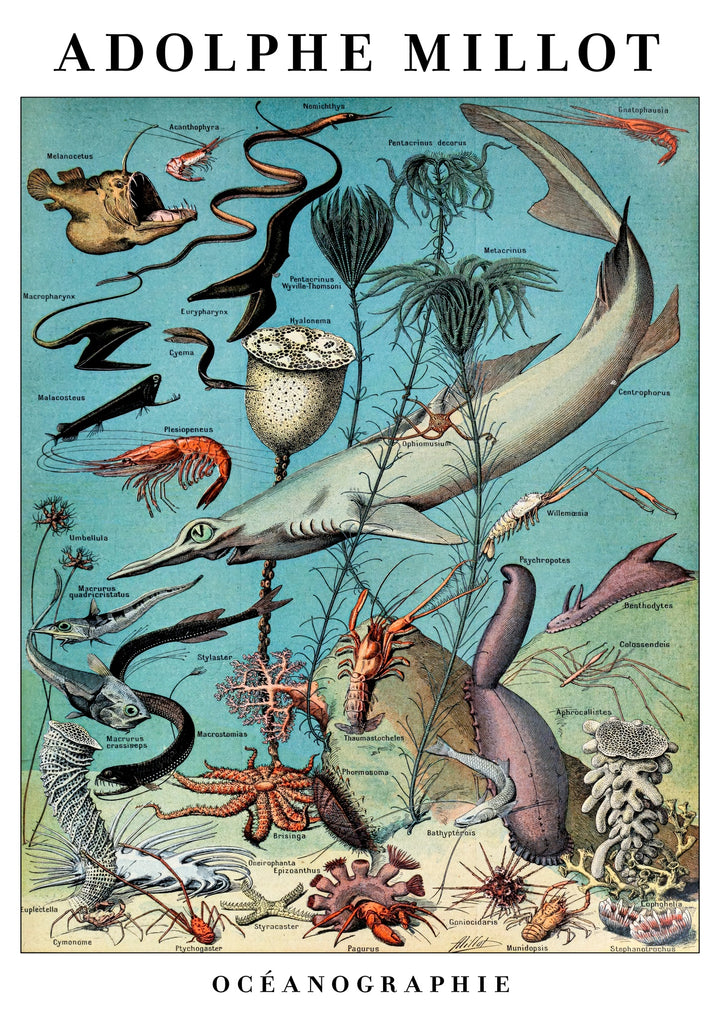 This vintage-inspired "Oceanography" poster by Adolphe Millot showcases a detailed illustration of marine life. Featuring a diverse array of sea creatures including fish, sharks, and corals, this scientific-themed wall art captures the beauty and complexity of underwater ecosystems. Ideal for zoology enthusiasts, this artwork provides an insightful look into ocean biology, making it a striking addition to any space.