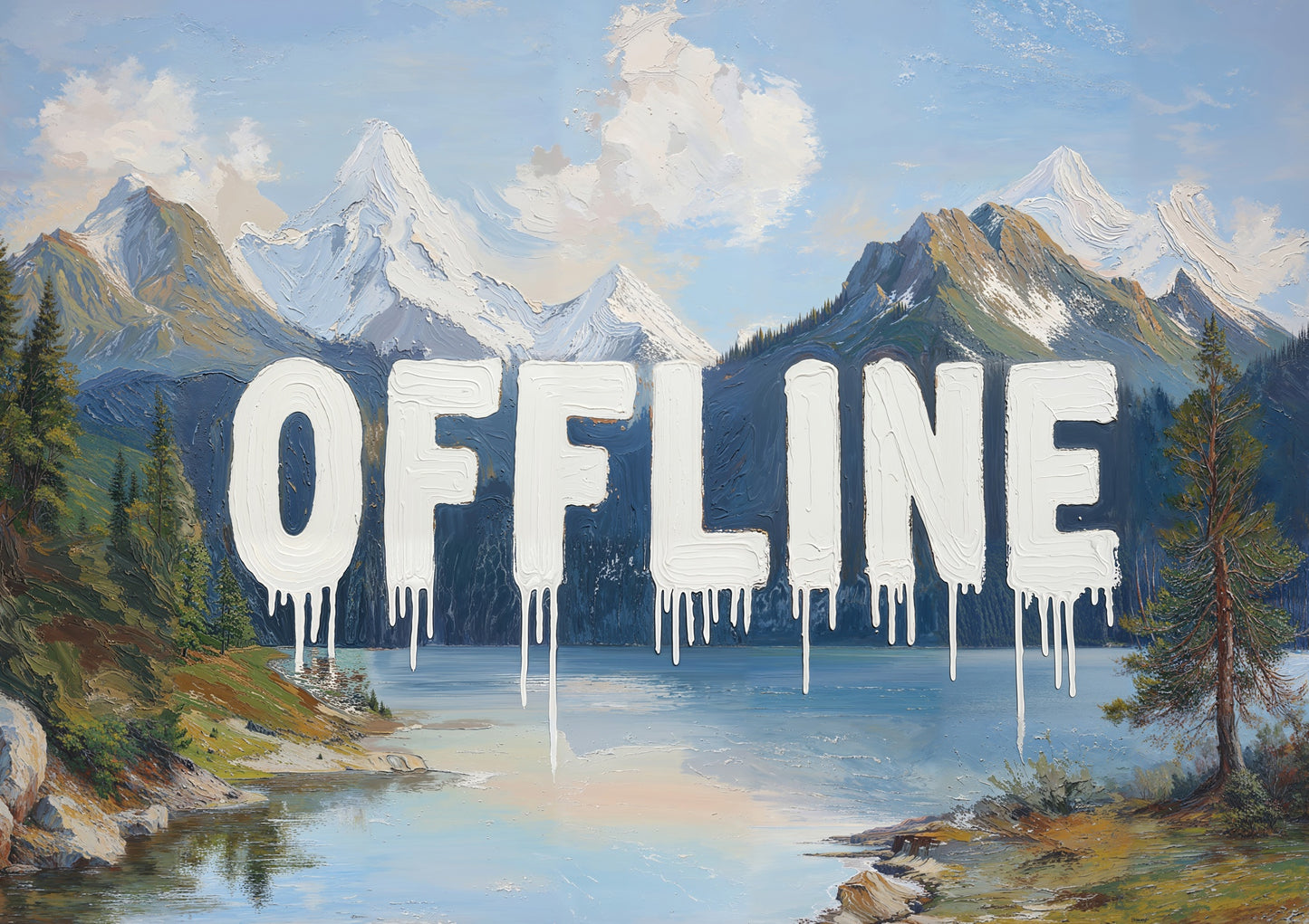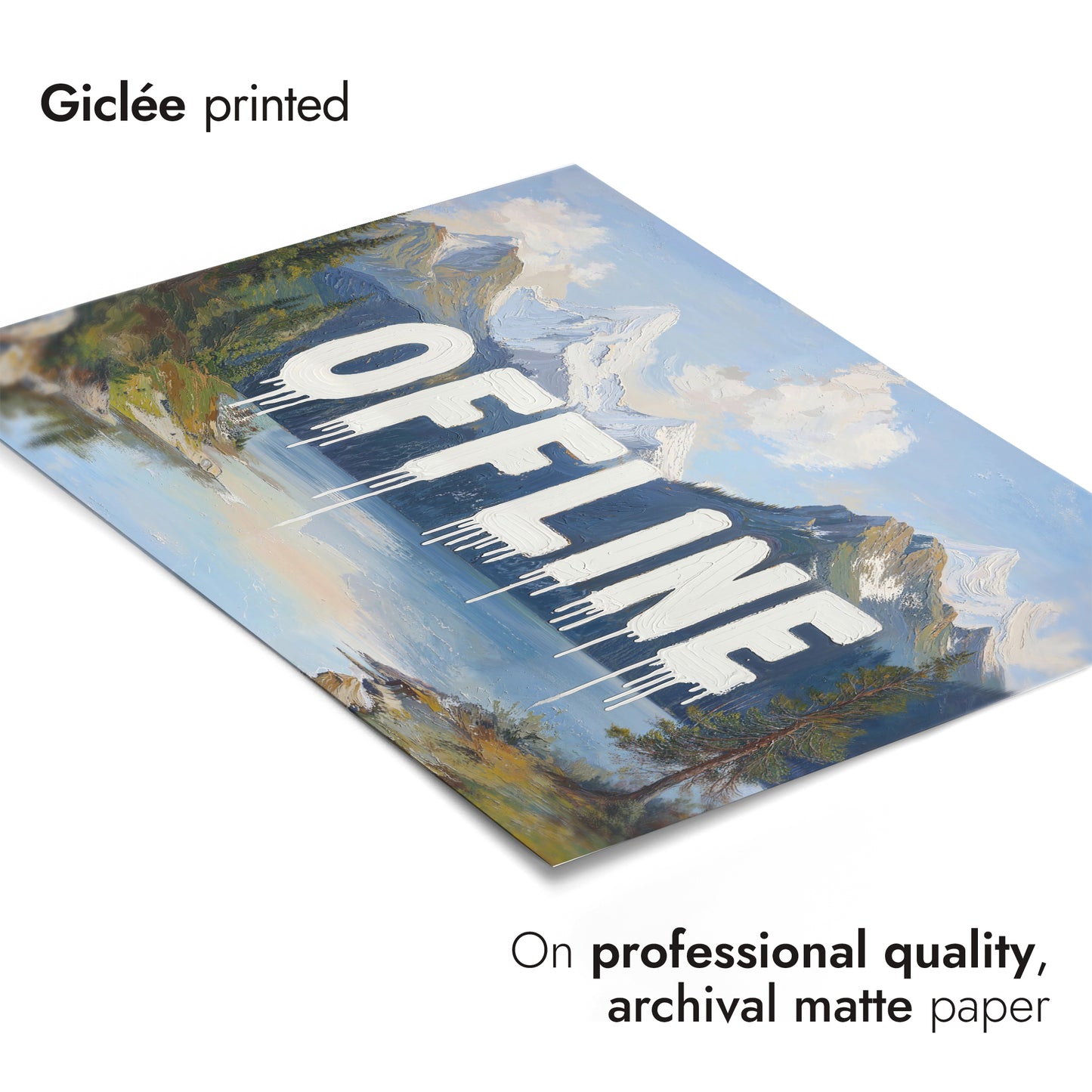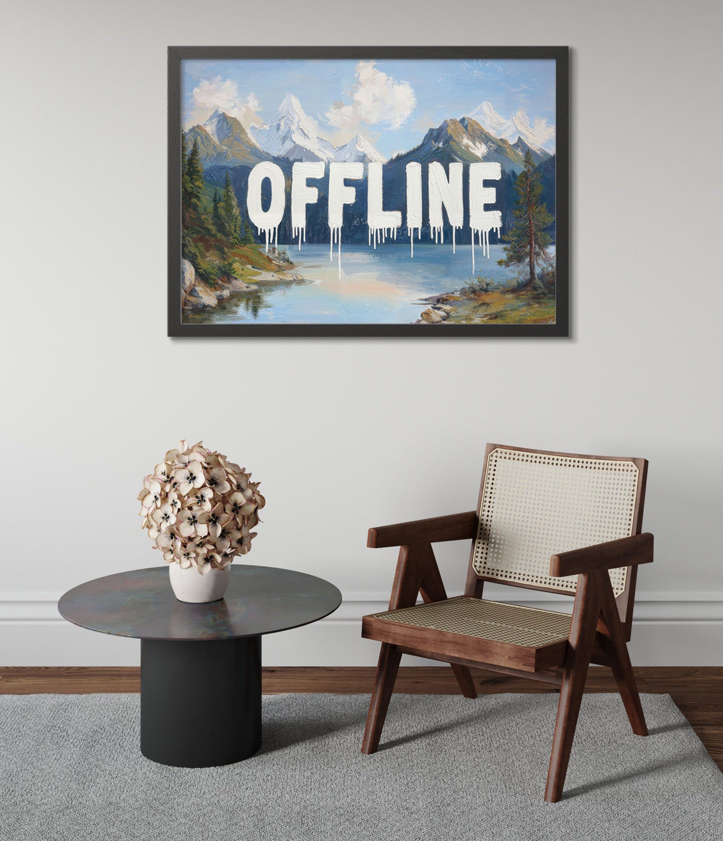 This art print blends classic landscape painting with modern typography. Snow-capped mountains and a tranquil lake serve as a serene backdrop for bold, graffiti-inspired letters spelling "OFFLINE." The contrasting styles create a striking visual impact, perfect for a graphic poster. Ideal for lovers of contemporary art, this piece adds a unique touch to any space seeking a balance of tranquility and bold design.