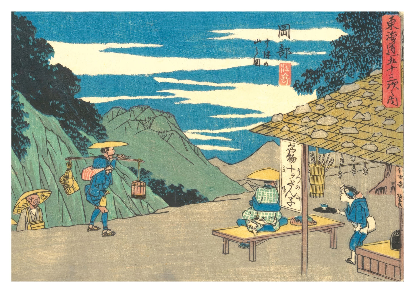 This Japanese woodblock poster titled "Okabe" by Utagawa Hiroshige portrays a serene mountainside setting where travelers rest at a rustic restaurant. The traditional Ukiyo-E style illustration features vivid blues and greens, capturing the essence of rural Japan. Ideal for enthusiasts of Japanese culture and landscape art, this piece brings tranquil, historical charm to any space.