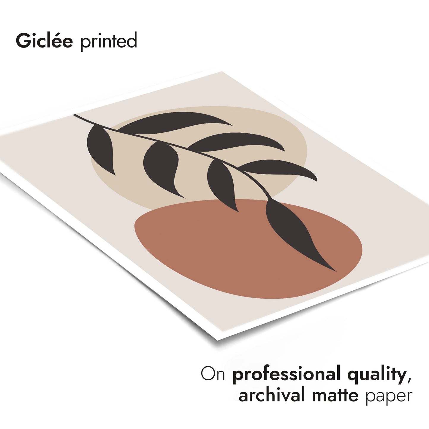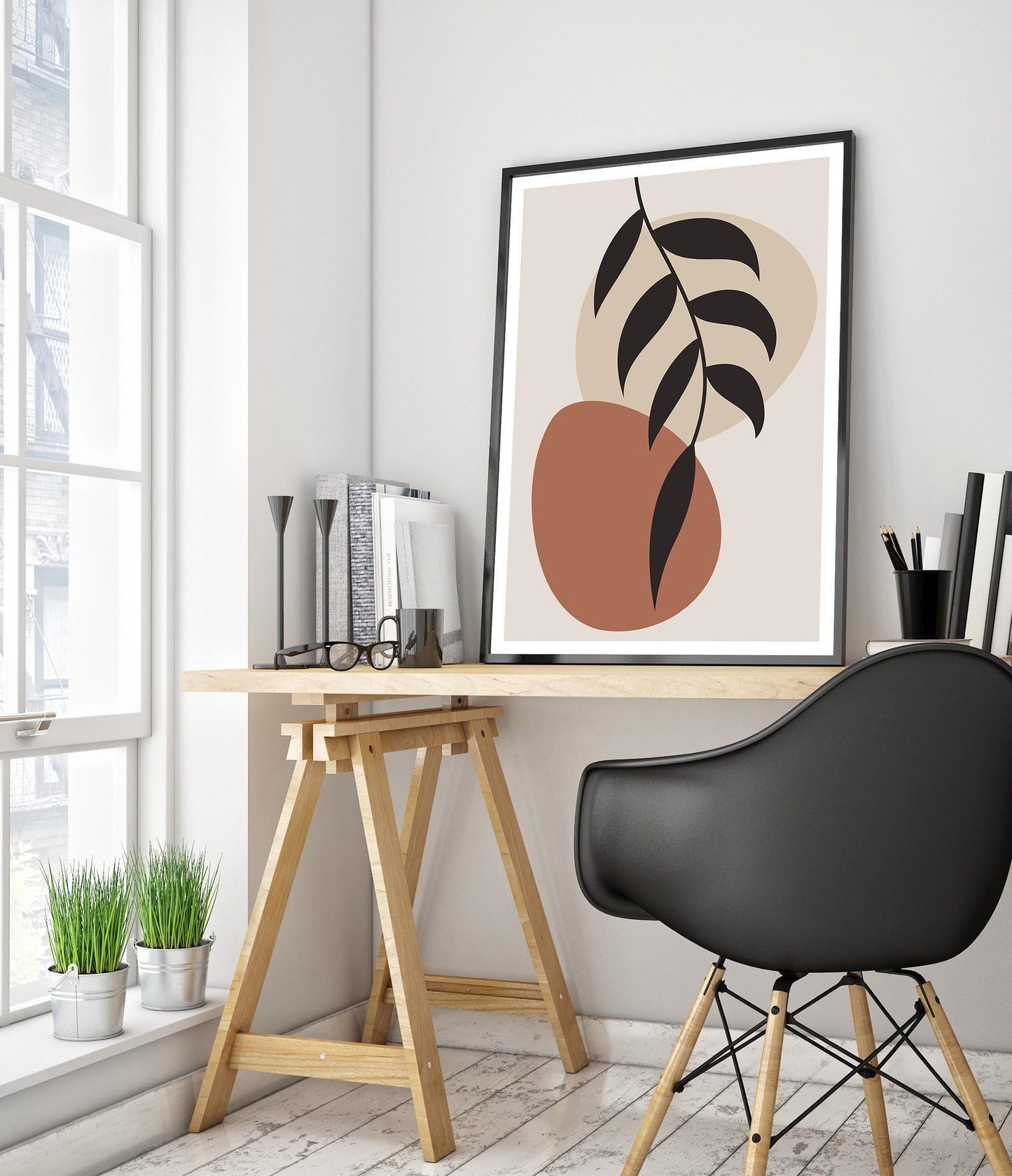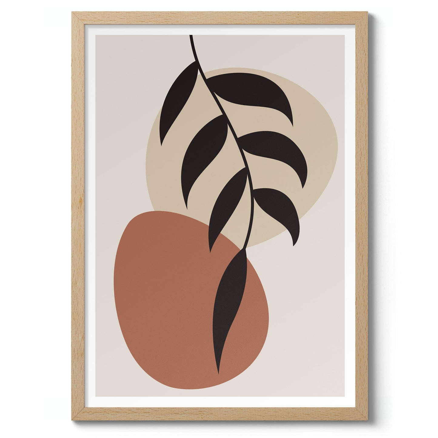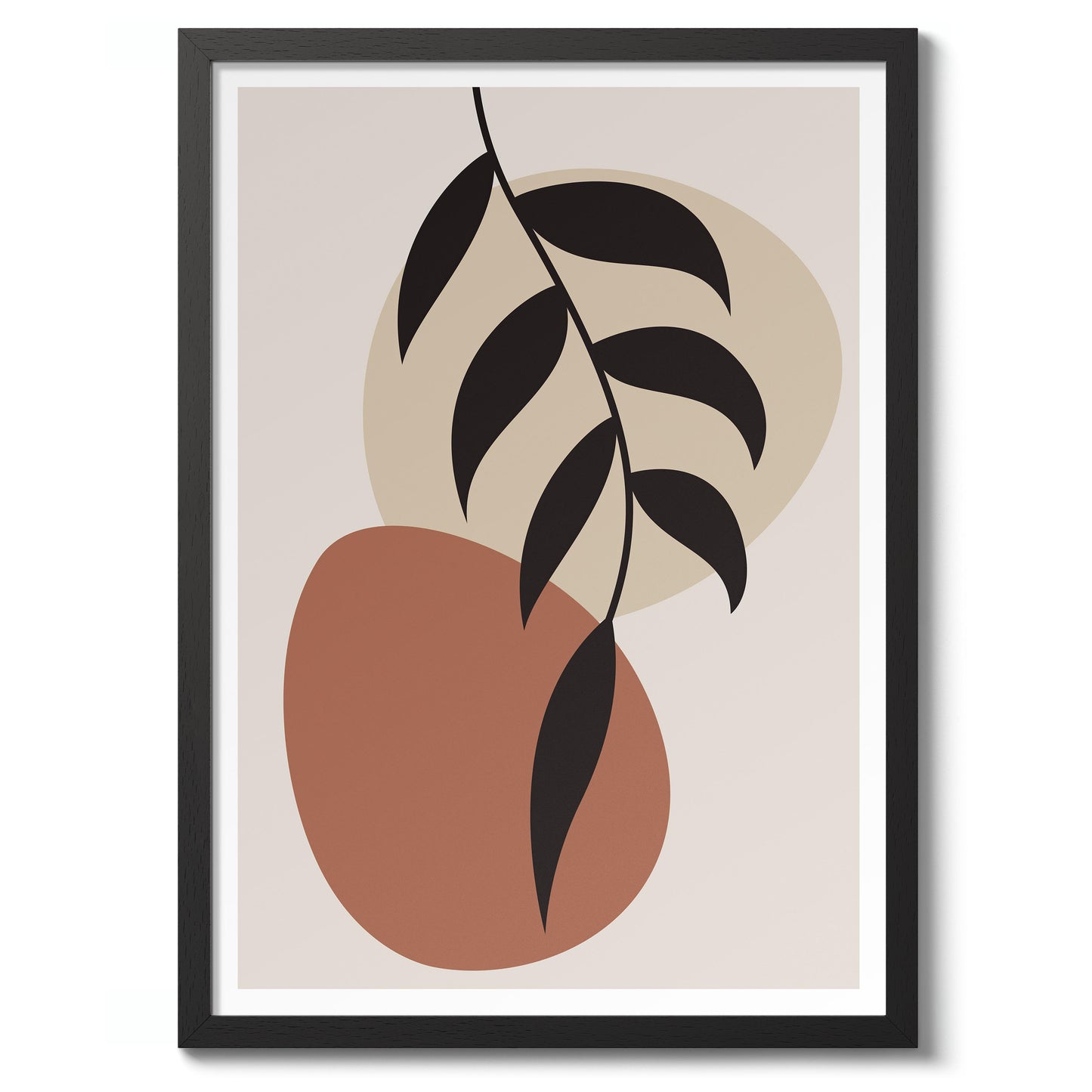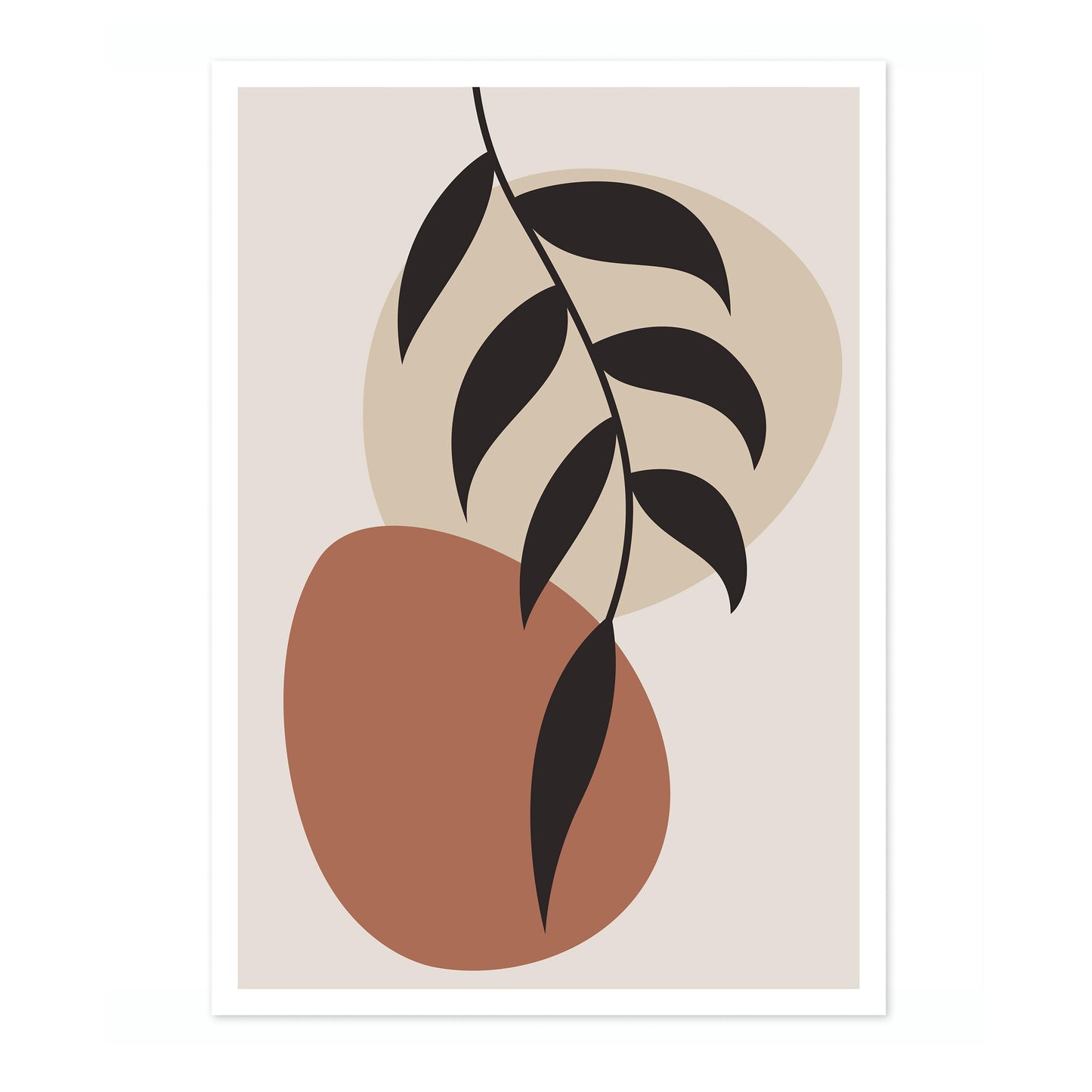 This "Olive Branch" poster showcases a minimalist graphic illustration featuring an elegant black leaf sprig set against abstract, earthy-toned shapes. Its sleek and modern design is perfect for adding a touch of nature-inspired decor to any space. Ideal for fans of boho and minimalist styles.