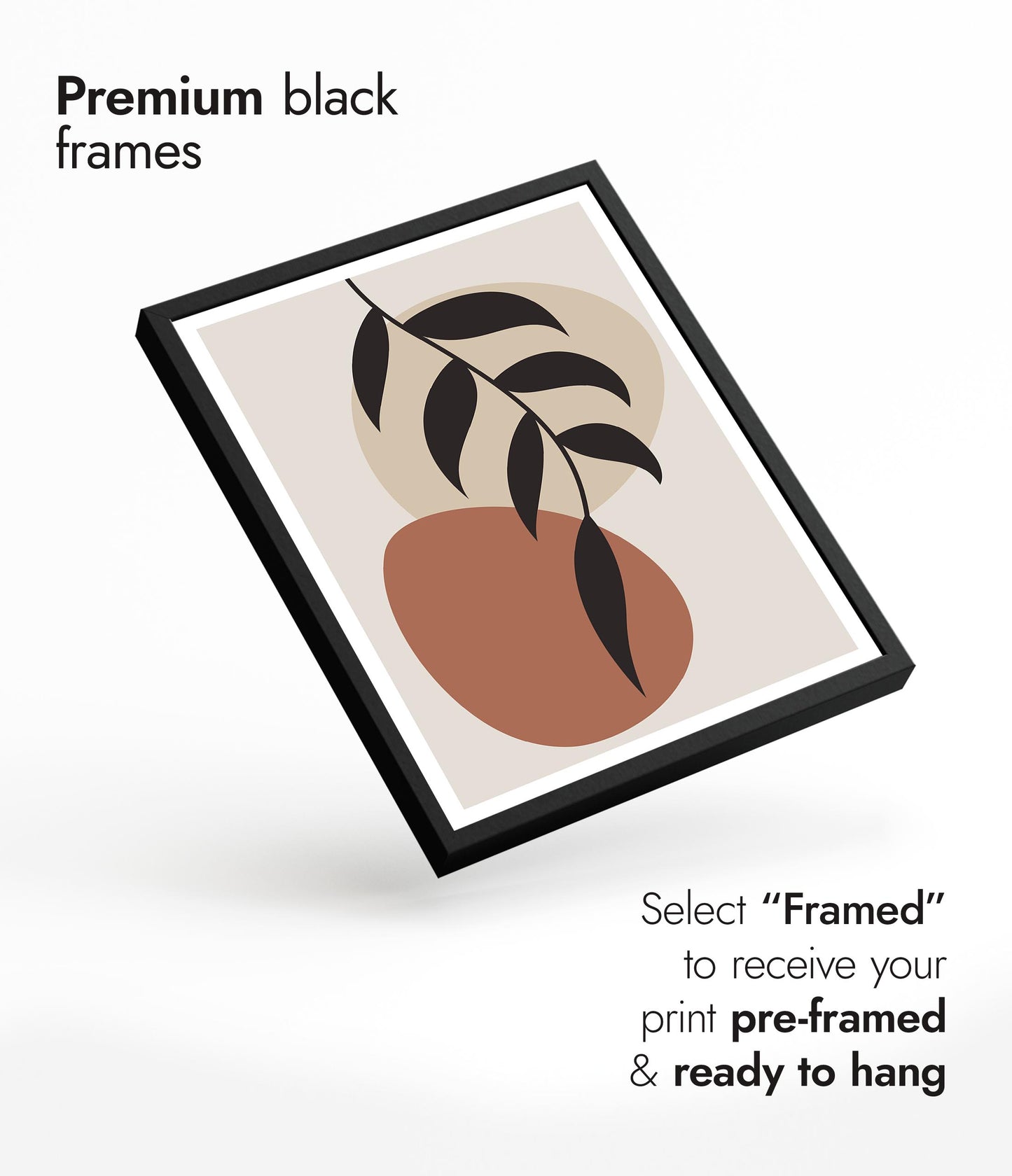 Solid wood frames available in black stained or natural finishes, with UV resistant acrylic glass. Framed orders arrive pre-installed with your choice of print, ready to hang. Available in all print sizes.