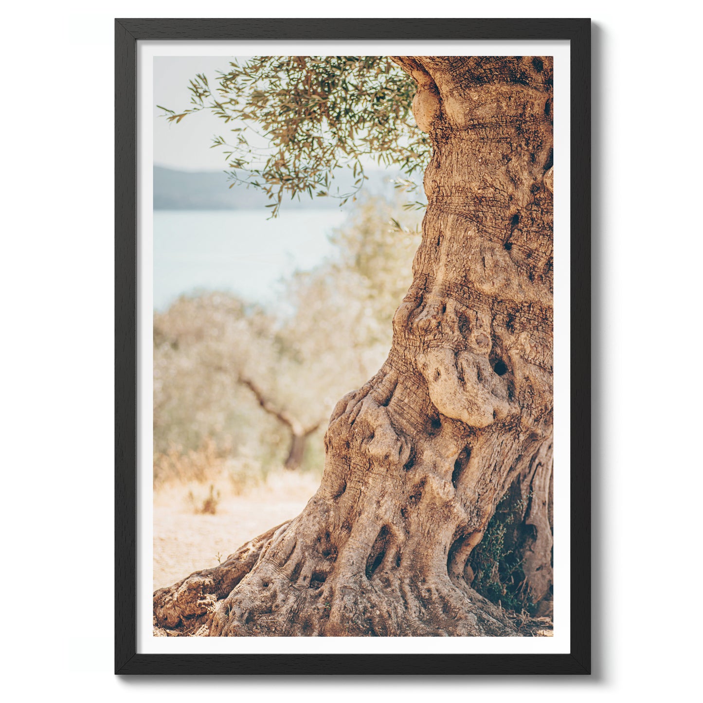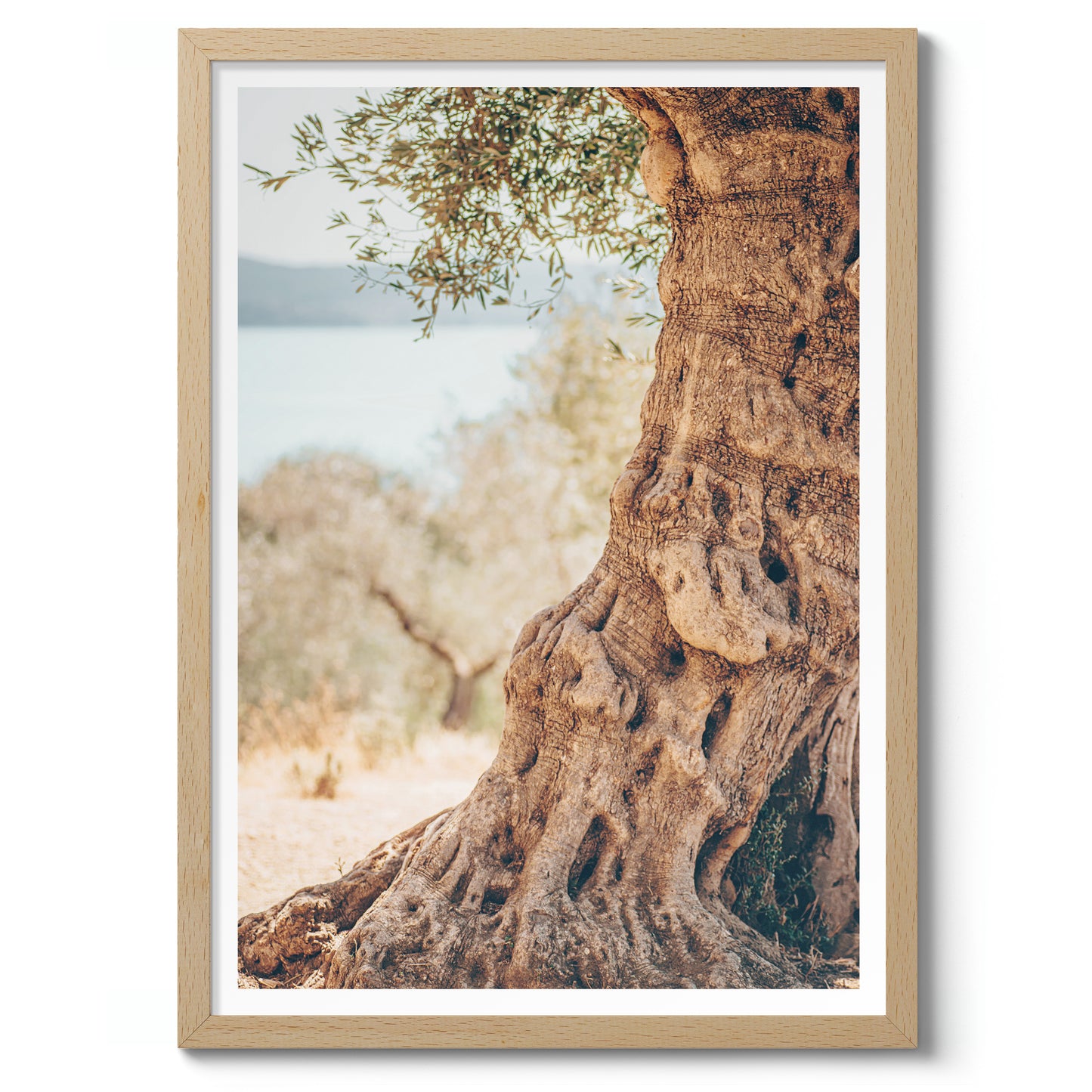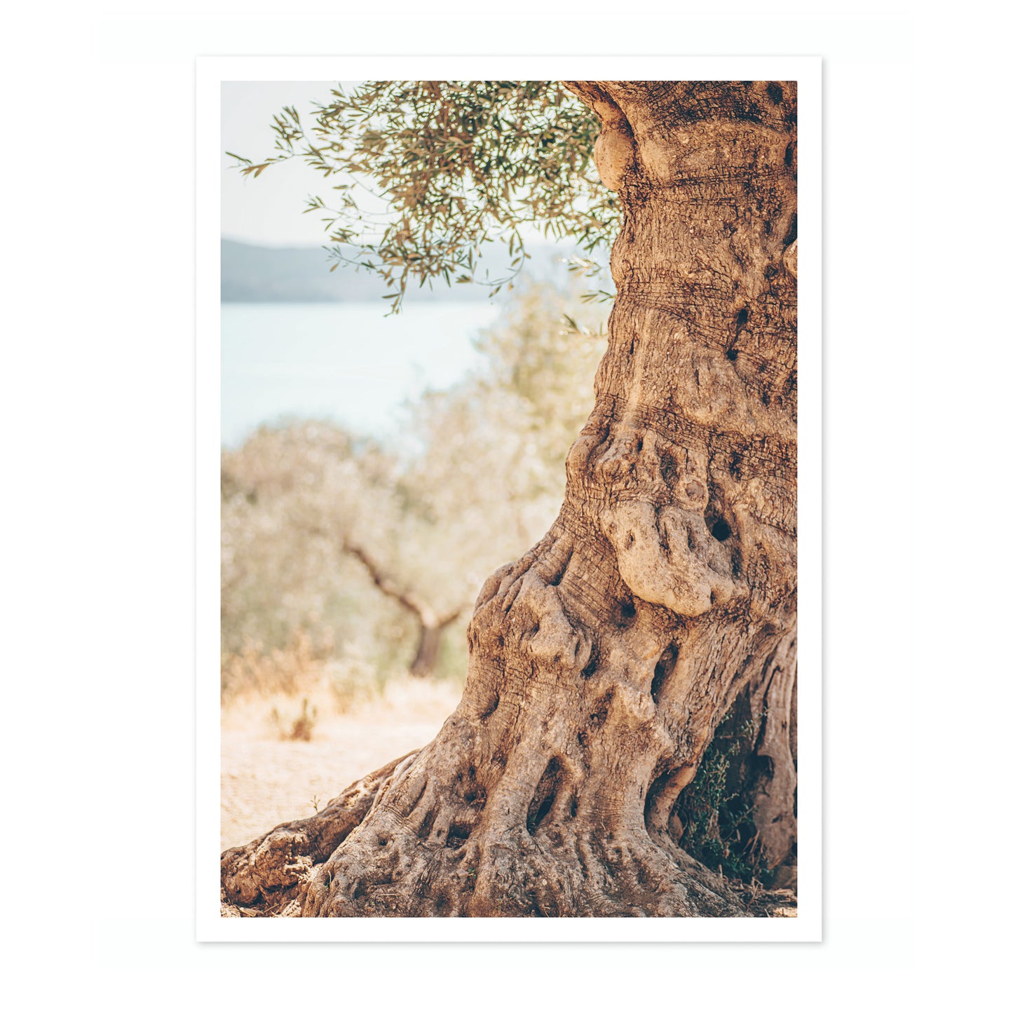 This photographic poster, titled "Olive Tree," captures the intricate texture of an ancient olive tree trunk against a serene natural backdrop. The detailed close-up showcases the tree's gnarled bark and the subtle play of light and shade, evoking the timeless beauty of nature. Perfect for adding a touch of organic elegance to any space.